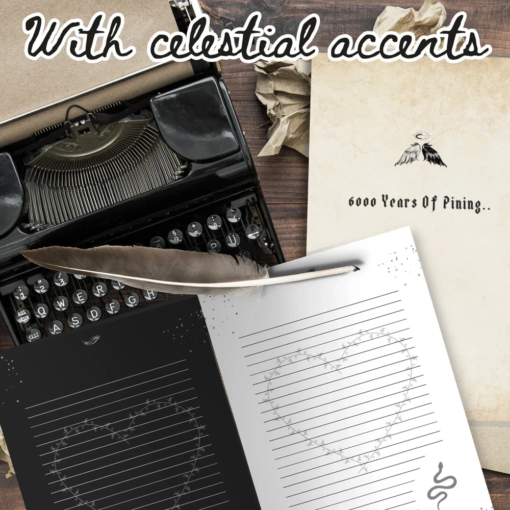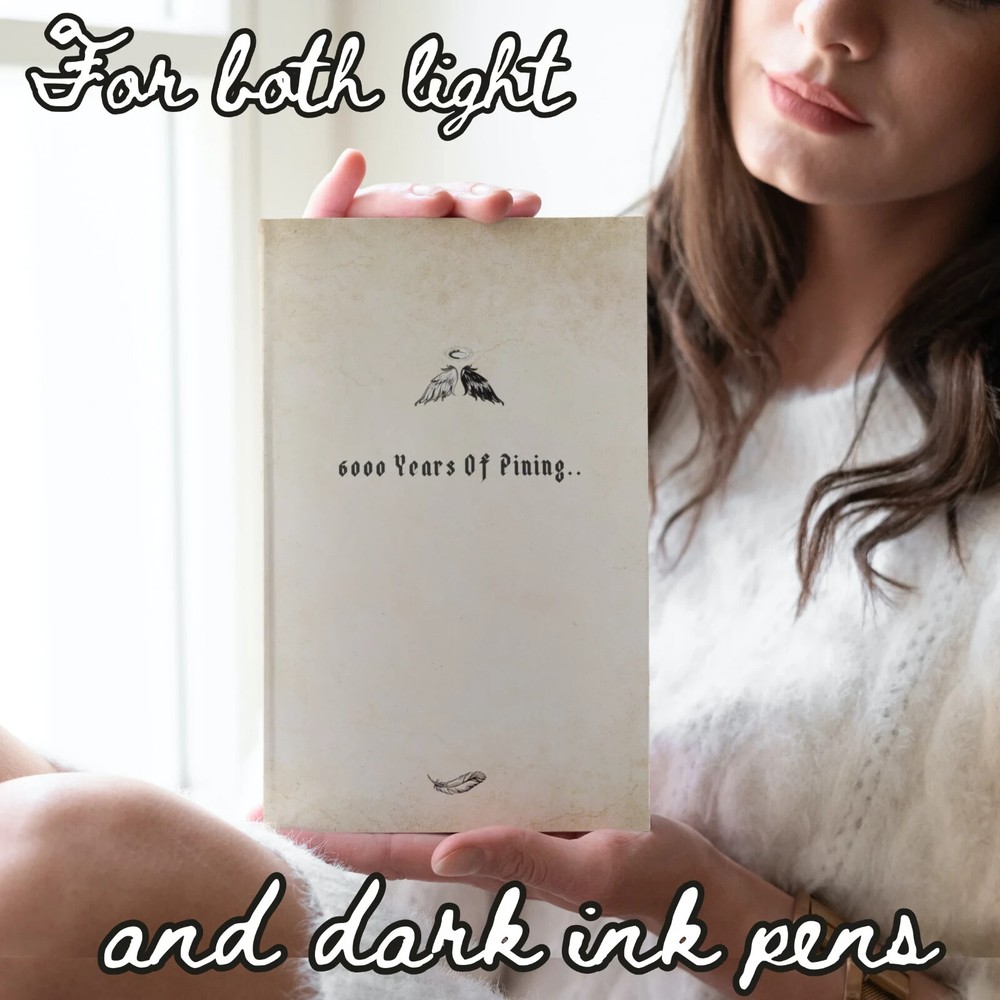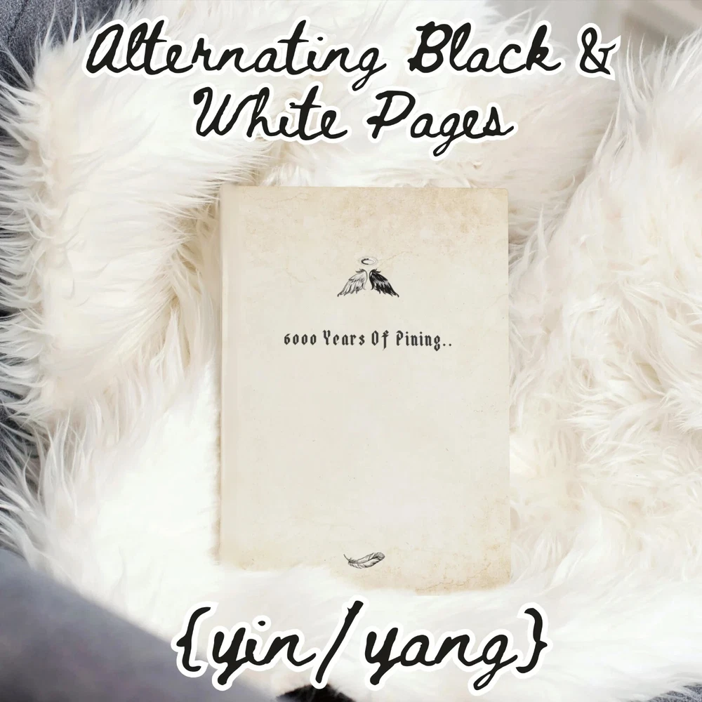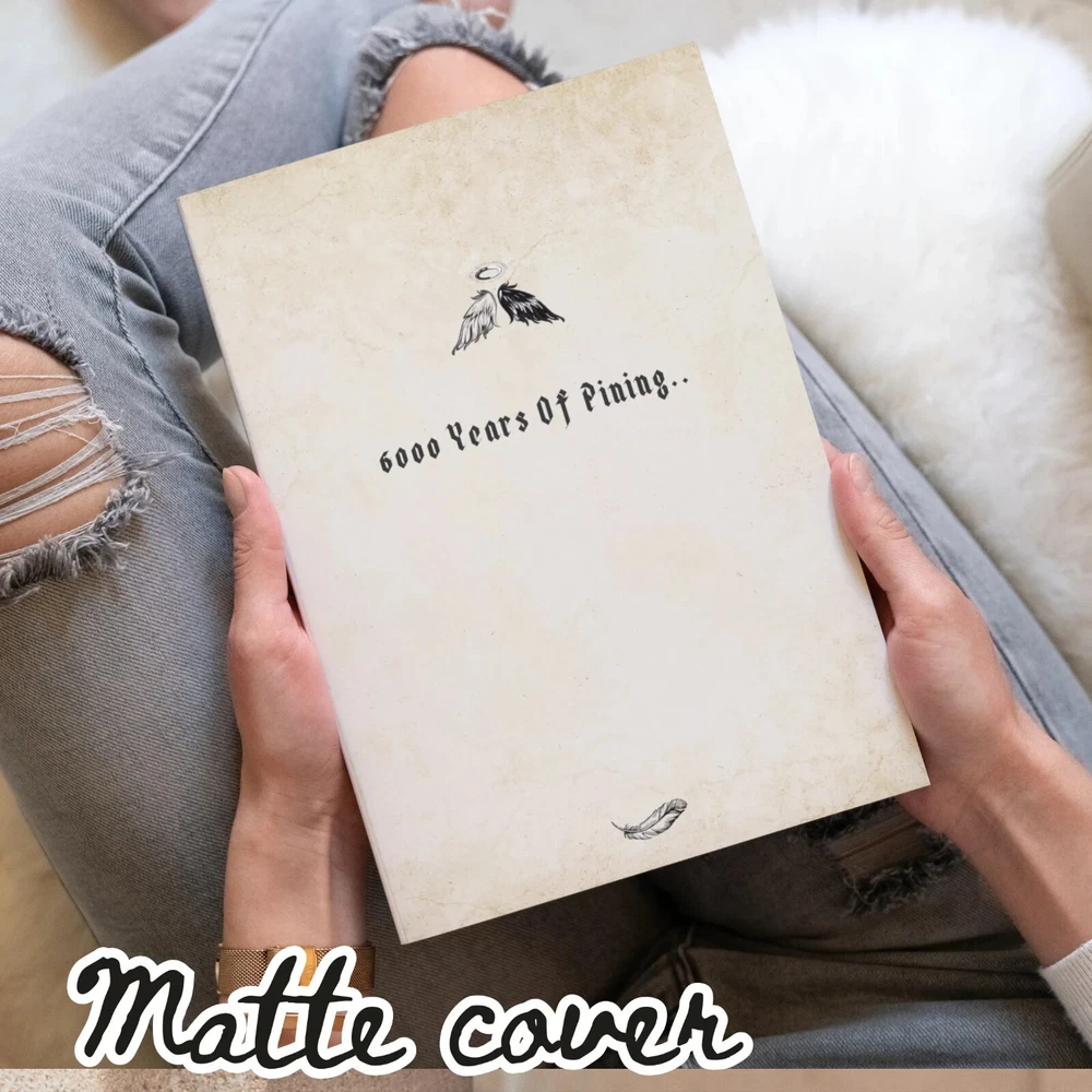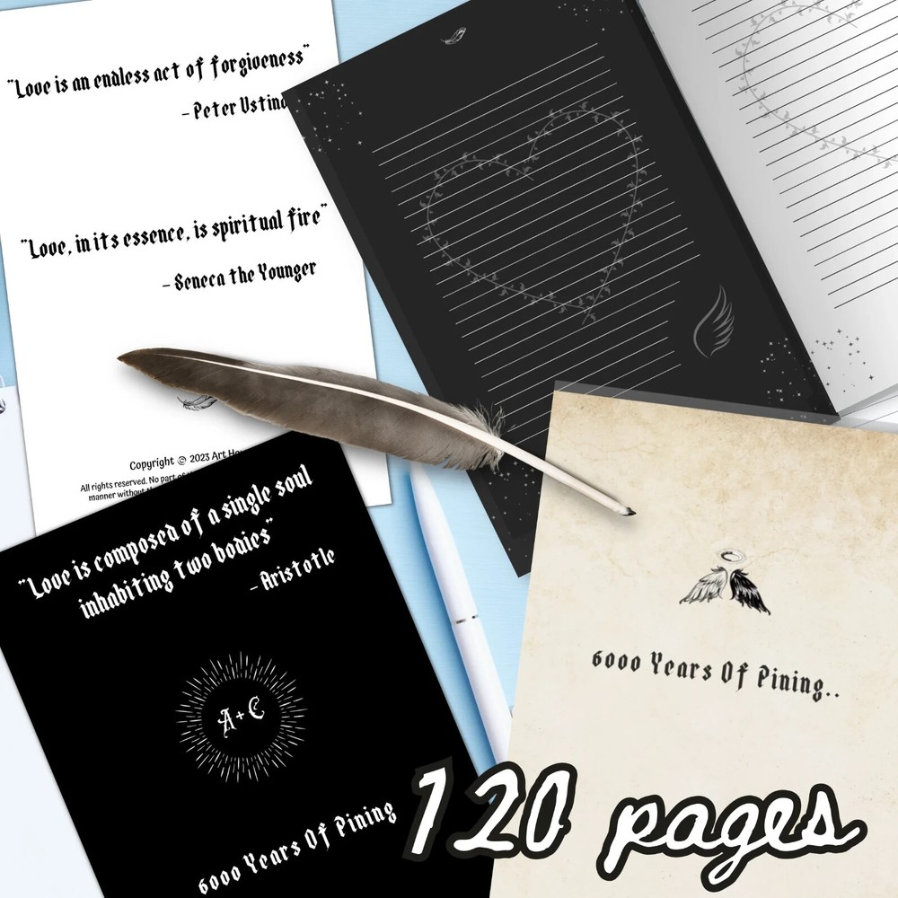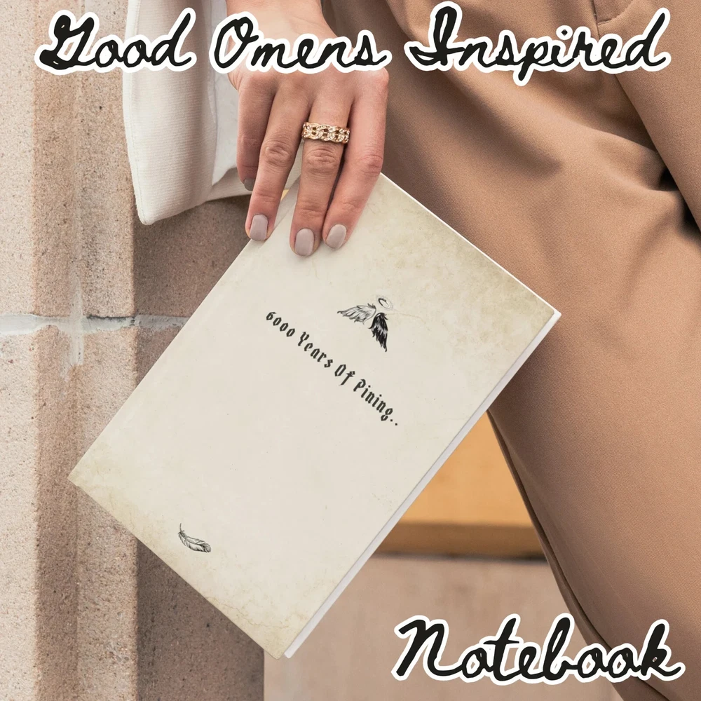 ❤ BRING ROMANCE INTO YOUR LIFE!! I bet it's very easy to find a journal with a very conventional cover and boring interior, but I doubt you are able to easily get your hands on a notebook that is poetic and witty in nature, but also conveys the essence of the infamous gOmens fandom. Which is why this daily diary makes a perfect gift for anyone who adores Good Omens and our "ineffable husbands". Whether you use these notepads for your simple daily accounts or occasional poetic outbursts, these cool journals are a beautiful way to commemorate the GO series and remain close to the characters and to a lovelorn being that's within you. ❤ What's even more attractive is that this journal comes with a mix of black and white interior pages for both dark ink pens and white ink pens, a mixed color combination for your amusement of course, contradicting each other, just like our favorite angel and demon. You'll get utter satisfaction from writing down your thoughts, comments or heartfelt poetry in these imaginative and profound journals. This funny "6000 years of pining" notebook makes an awesome and unique gift for anyone, including yourself, for a birthday, Christmas, Valentine's day or any other occasion. ❤ Great for black and white ball pens, gel pens, ink or pencils. This well-made present is made-to-order and has a perfect 6x9 size, which is easy to carry around, and just the right size for your purse, bag, backpack, laptop case or a baby stroller. ❤ Journal Features: • 120 pages • beautiful matte cover • interior has a mix of alternating black and white color pages, with cute celestial accents (see pictures) • 6” x 9” paperback (softcover) • part of the gOmens series ❤ ALSO ----------------------- - Colors may vary when printed due to different screen resolutions, color depths and printer options. - NO REFUNDS OR EXCHANGES AT THIS TIME. --------------------------- ❤ PLEASE NOTE: All designs are copyrighted and cannot be reproduced or altered in any way. Distribution or reselling of these graphics is strictly prohibited. ©2024 - All rights reserved.