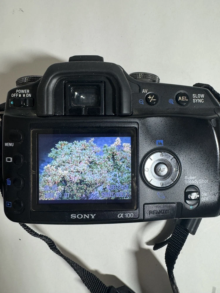 Series: Sony Alpha Type: Digital SLR Model: sony alpha a100 UPC: 0027242694156 gtin13: 0027242694156 Optical Zoom: 3.9x Maximum Resolution: 10.2 MP Battery Type: Lithium-Ion Features: Auto Focus Connectivity: USB Brand: Sony Item Weight: 19.22 Oz. MPN: DSLR-A100K Country/Region of Manufacture: Japan Color: Black