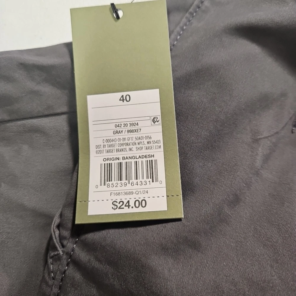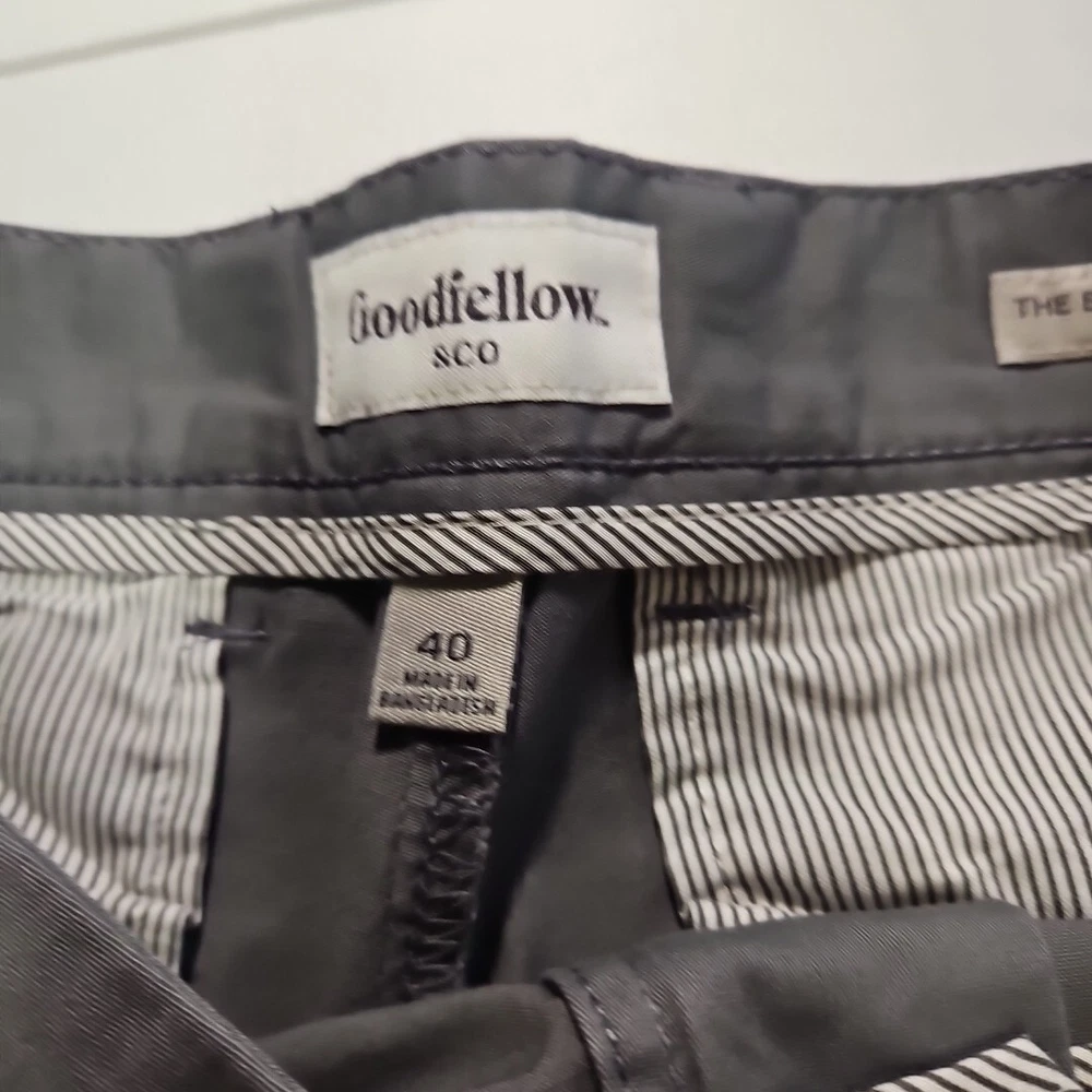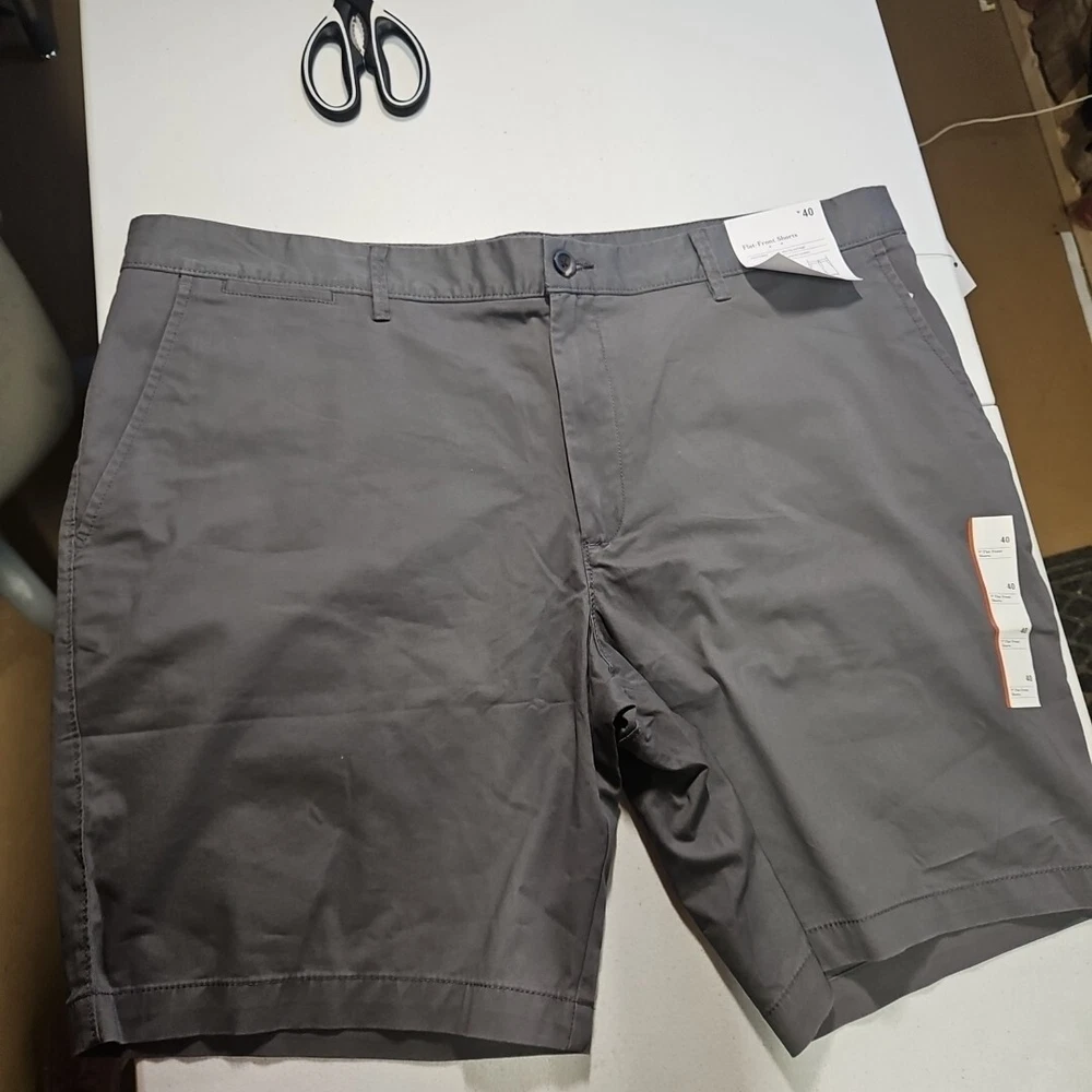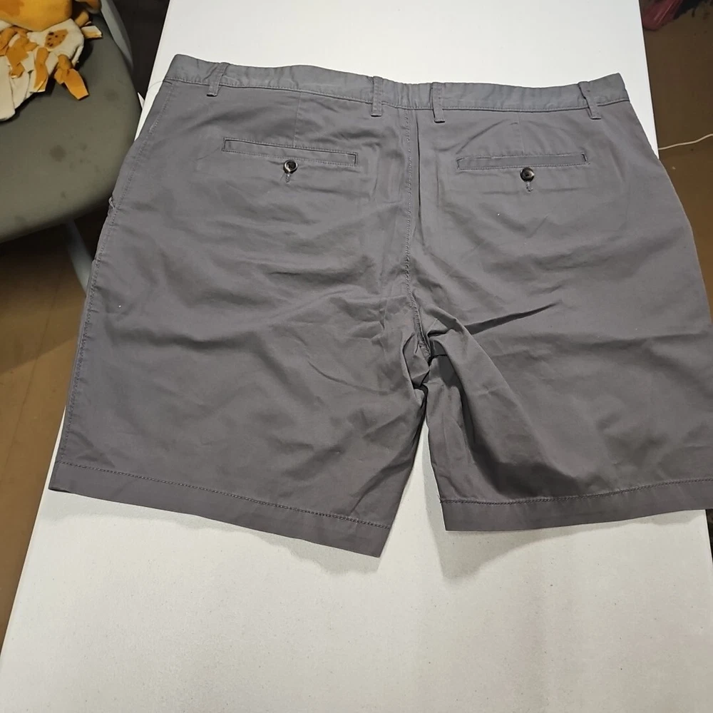 Crafted for comfort and style, these Goodfellow & Co chino shorts are a versatile addition to any wardrobe. The classic gray color and solid pattern make them ideal for a range of occasions, from a casual day out to a relaxed work environment or even for travel. With a size 40 waist and a 9-inch inseam, they provide a tailored fit that's not too tight and not too loose. The stretch fabric blend of cotton and spandex ensures ease of movement, while the flat-front design keeps the look sharp and the fly button and zipper offer a secure fit. Practical features such as the slash pockets add functionality to this preppy piece, making it a go-to for both beach getaways and tropical adventures. Machine washable for easy care, these shorts are as low maintenance as they are stylish. Shorts are new with tags. From a pet and smoke free home.