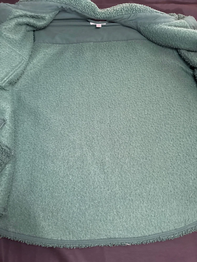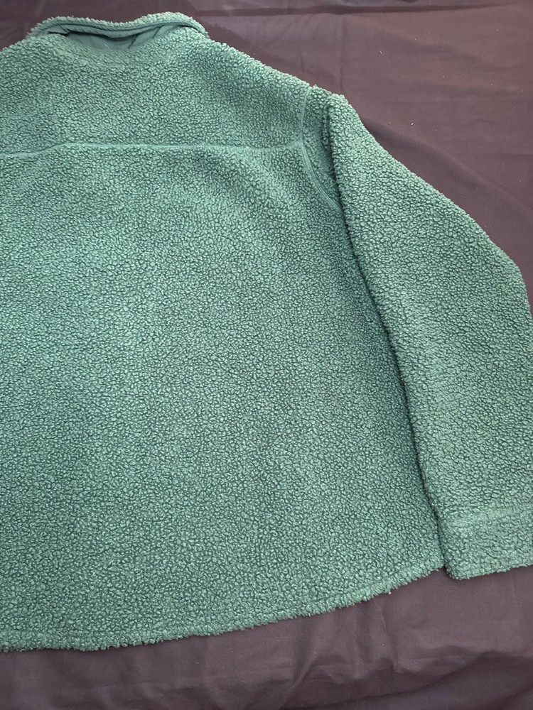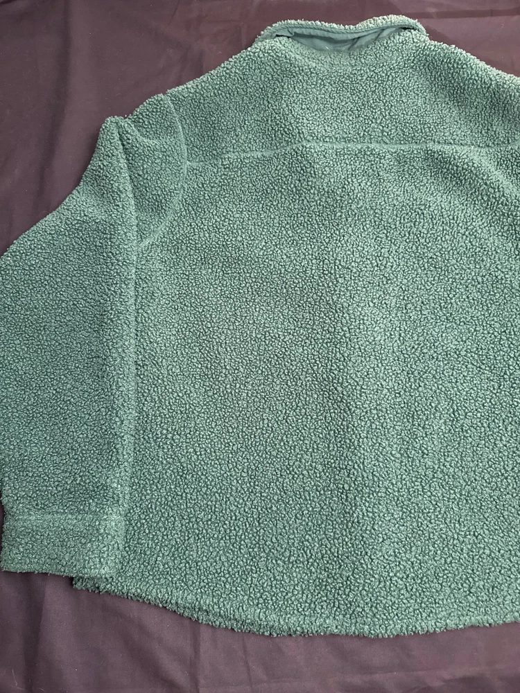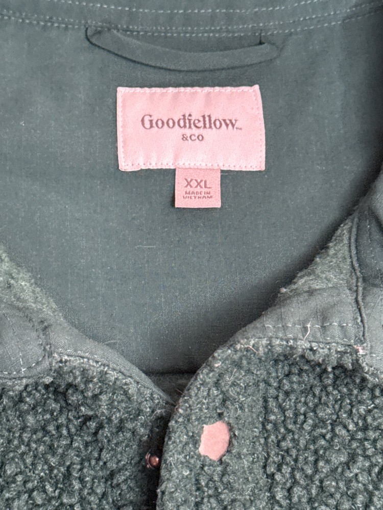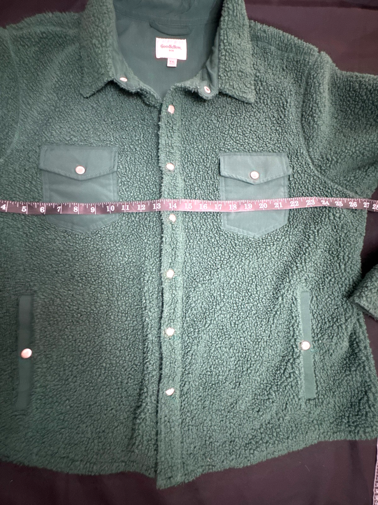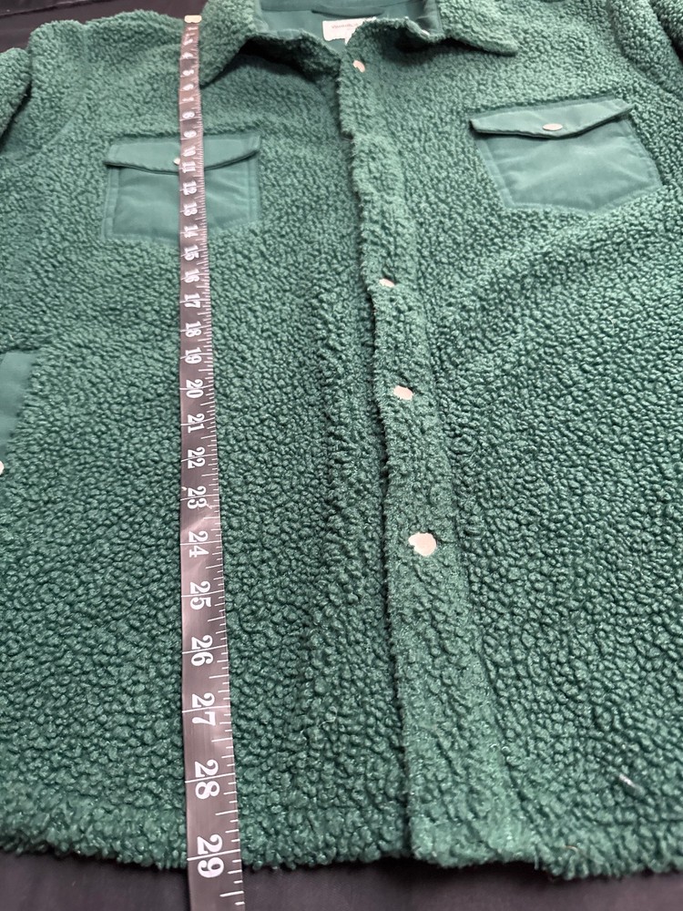 Stay cozy and stylish with this Goodfellow & Co green sherpa jacket, perfect for cool weather wear. Crafted with a soft, high-pile fleece exterior and lined with smooth jersey, this jacket offers the comfort of a fleece with the structure of a shirt jacket (“shacket”). Key Features: • Brand: Goodfellow & Co (Target in-house brand) • Size: XXL (see label—please check measurements below) • Color: Forest green • Material: High-pile fleece/polyester with jersey lining • Front snap-button closure with flap chest pockets & side hand-warmer pockets • Classic collar—wear it buttoned-up or open as a layering piece • Reinforced seams, internal lining visible in photos Condition Notes: • Excellent for secondhand; shows normal light use with no visible flaws • Fabric remains fluffy and intact, snaps secure, pockets clean Measurements (laid flat, doubled): • Chest (armpit to armpit): approx 27″ → 54″ total • Full length (collar seam to hem): approx 29″
