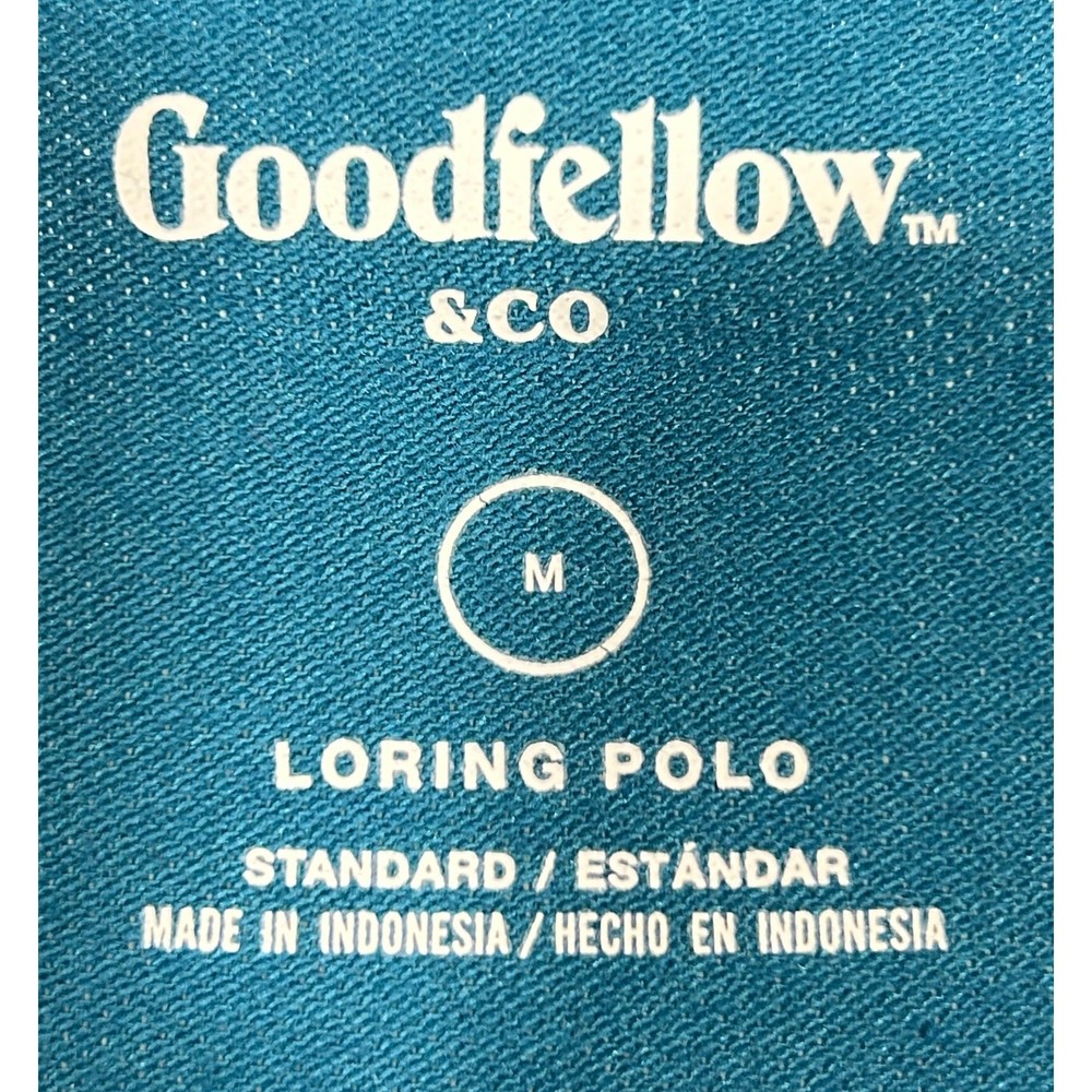 This Goodfellow & Co Loring Polo Shirt in size Medium features a vibrant teal-blue color, short sleeves, and a soft 100% cotton fabric for breathable comfort. Classic polo styling with a two-button placket and banded sleeves makes this a versatile staple for casual or semi-dress occasions. The clean silhouette and modern fit flatter a variety of builds, with measurements approximately 20" pit to pit and 28" shoulder to hem. Made in Indonesia, this polo is part of Goodfellow’s reliable essentials line, favored for everyday wear. Condition: Gently worn with no visible stains or damage. Please note, this item is pre-loved and may have minor imperfections not otherwise noted in the description.