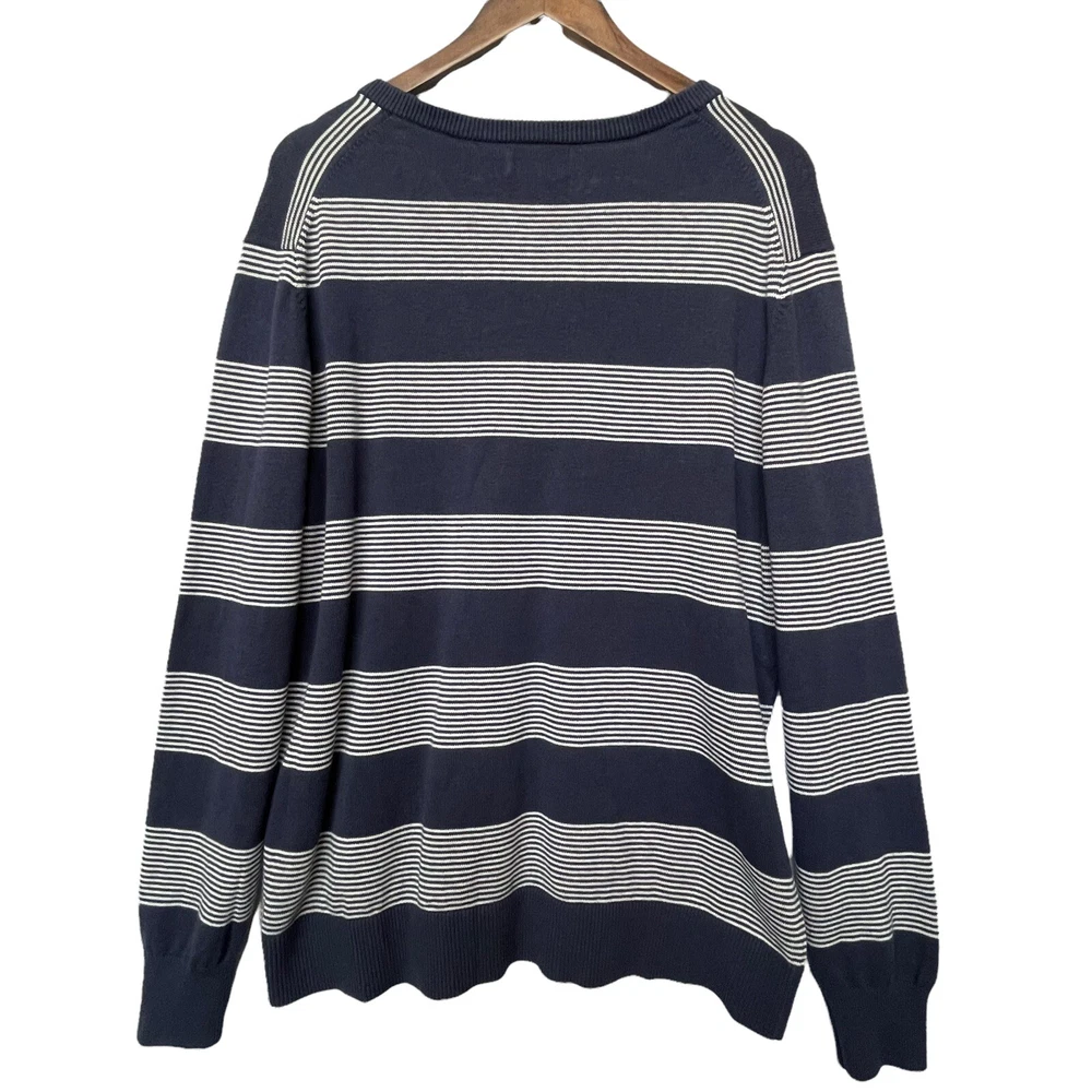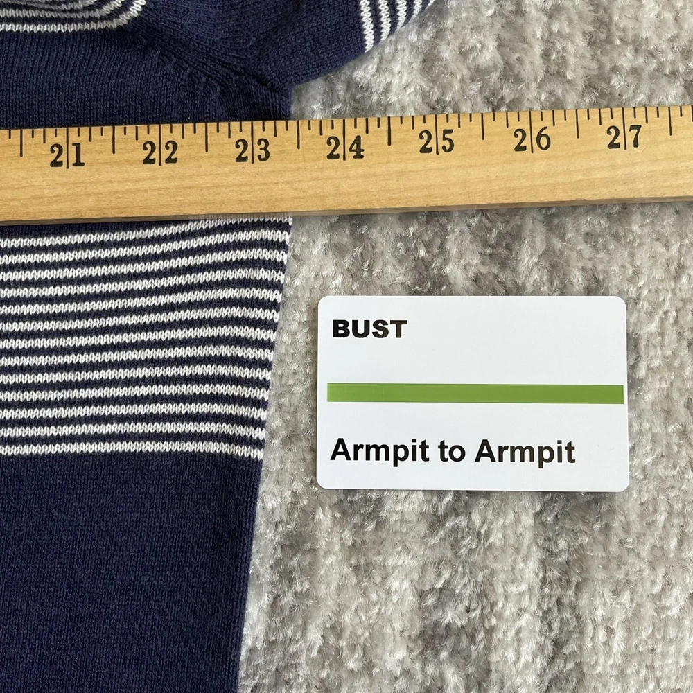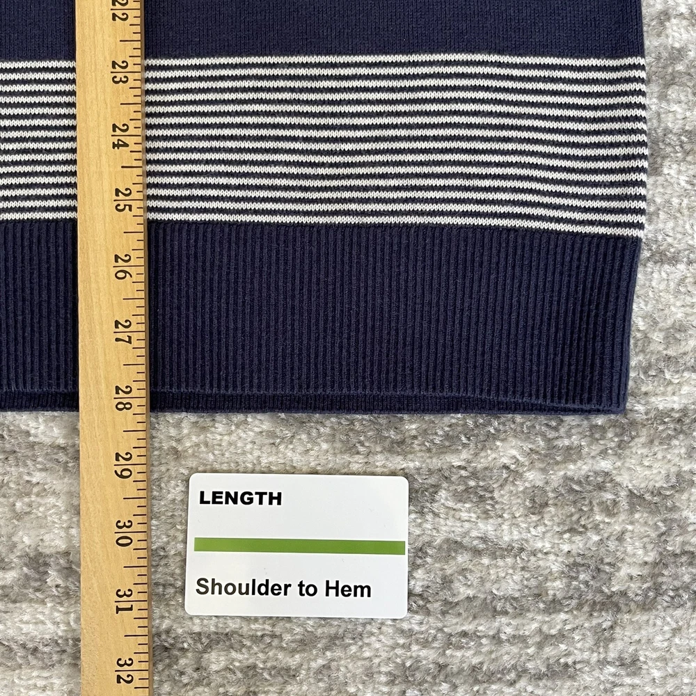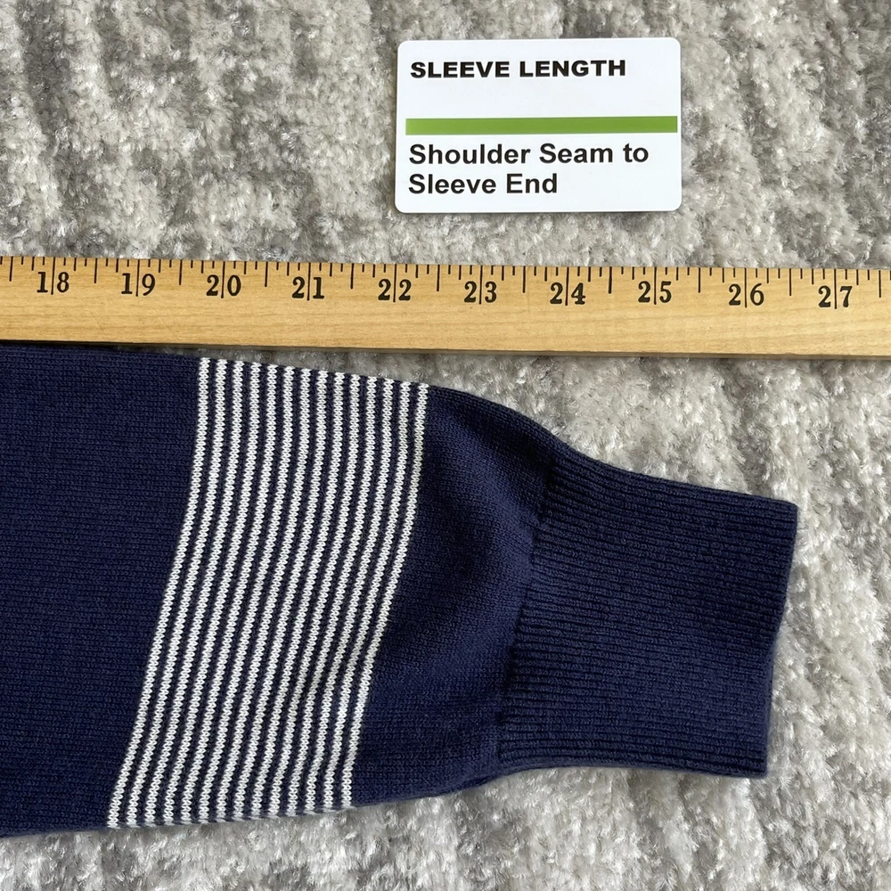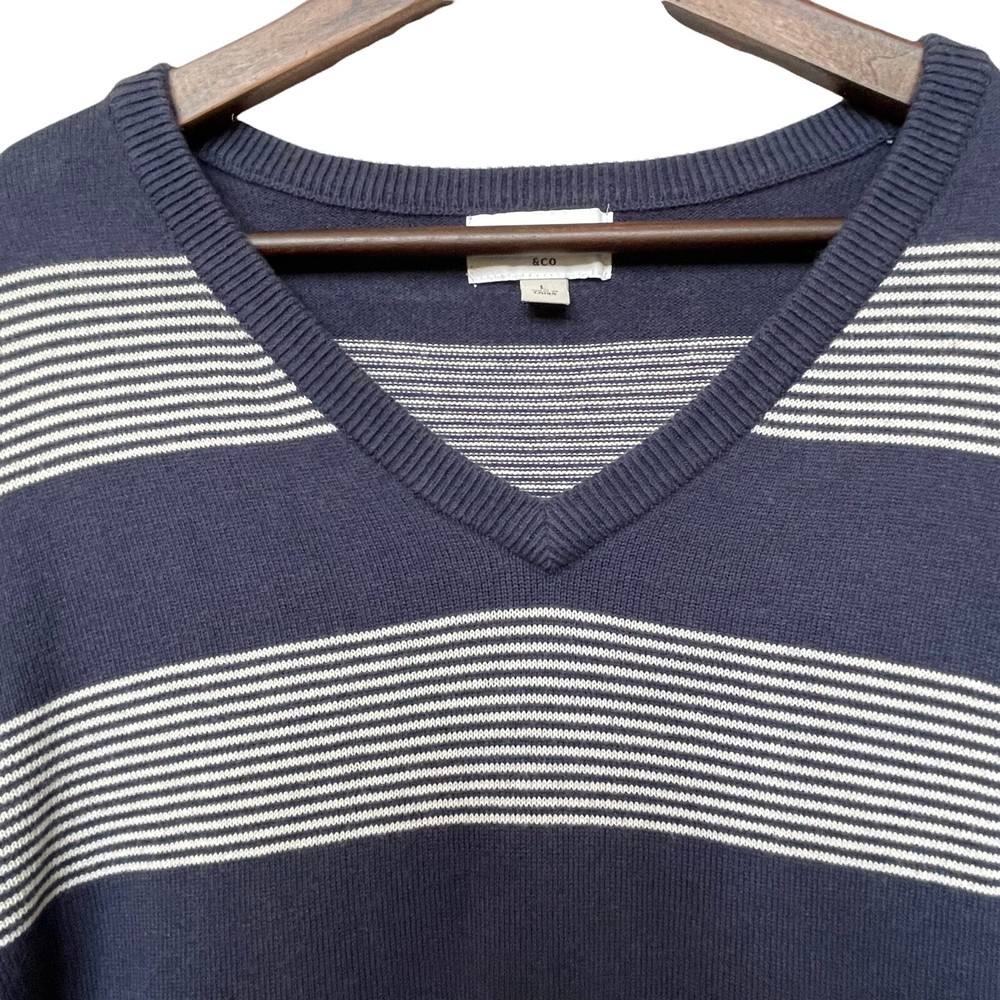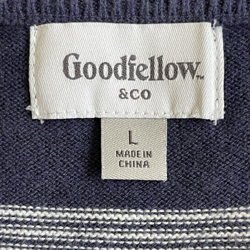 Goodfellow & Co. V-Neck Knit Pullover Sweater * Size: L * See pictures for measurements laying flat. *Color: Navy Blue, White *Features : V-Neck, Tight Knit, Ribbed Cuffs and Hem, 80% Cotton, 15% Nylon, 5% Wool, Stretch *Very Good Pre-owned Condition *Purchased items are shipped out next business day