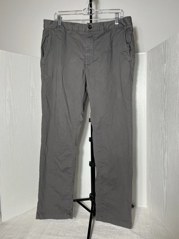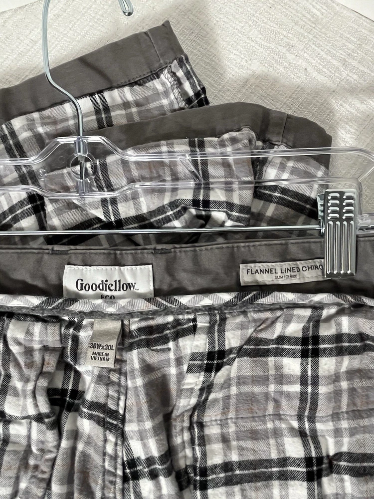 Goodfellow & Co gray chino pants. The pants feature a comfortable and durable cotton fabric with a flannel lining to keep you warm and cozy in colder seasons. Easy-care, windproof, and insulated features make them a reliable choice for any weather. Gently Used. No tears, holes, stains or snags. Shell 90% Cotton 2% Spandex Lining 100% cotton Machine Washable Size: 36 x 30 Measured Flat (across): Waist 18.5 inches Rise 12 inches Inseam 30 inches Thigh 11 inches **Need additional pictures or have questions?? Don't hesitate to message. Take a peek at SweetShine's other listings. Thanks for viewing.