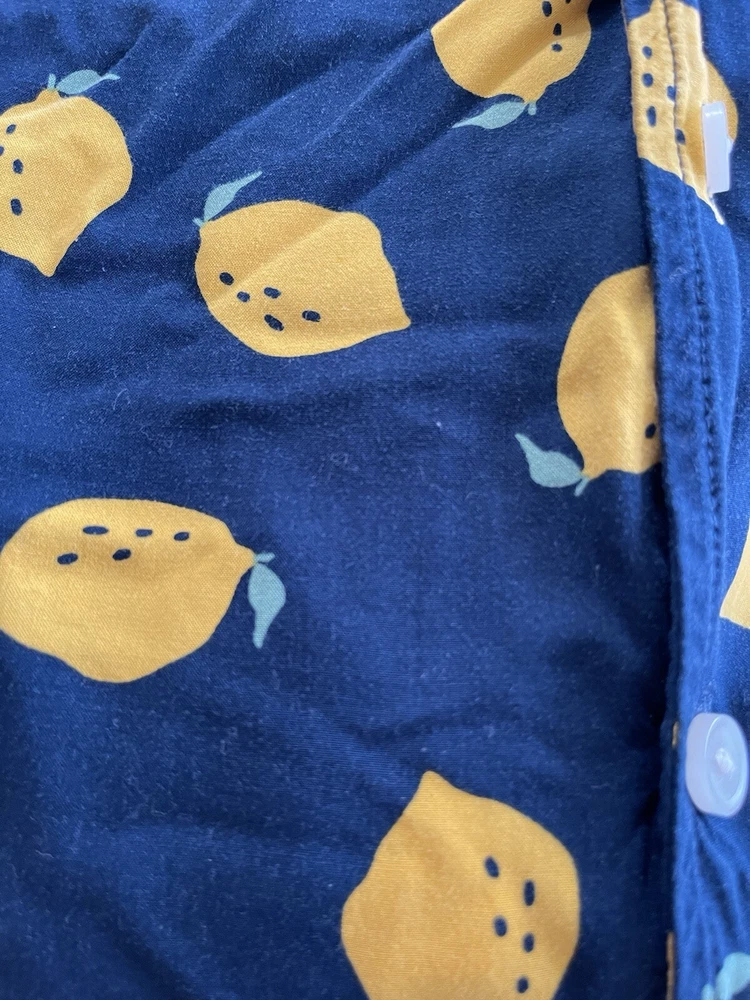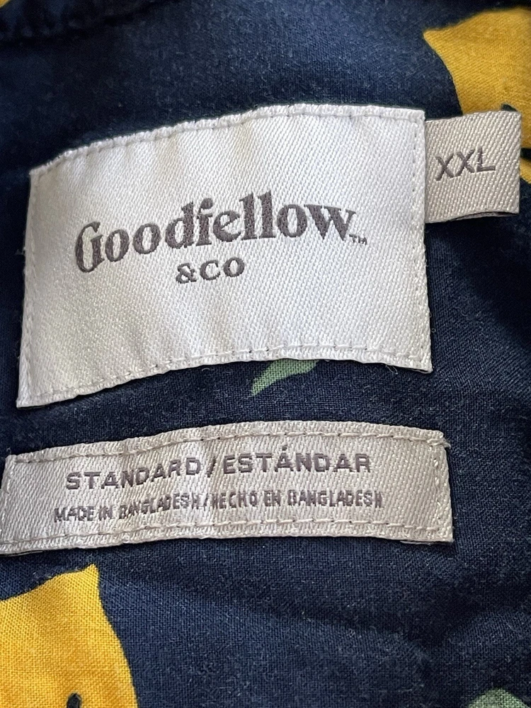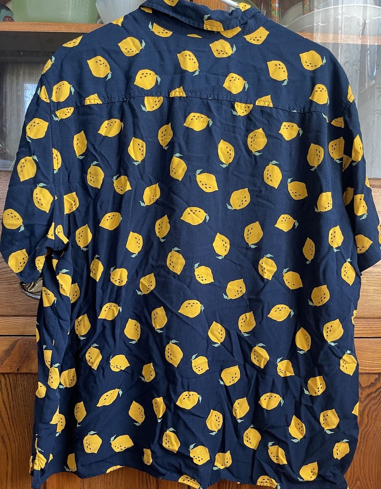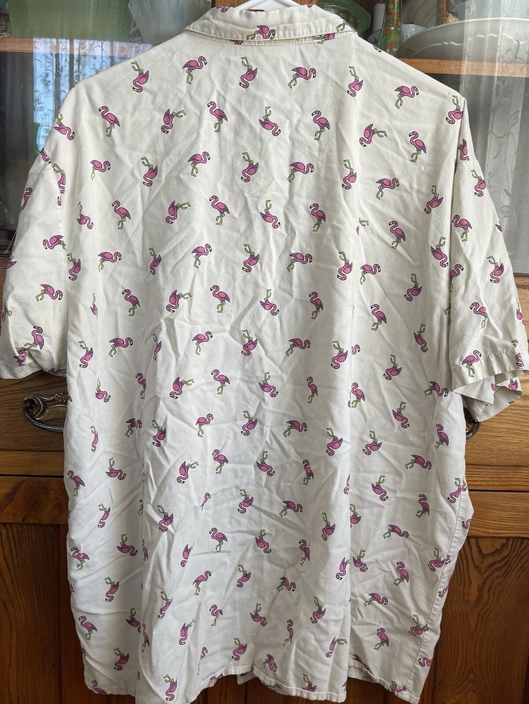 Different brands but measure same, 27 long armpit to armpit and 28 inches long. The first is a navy yellow lemon print shirt Goodfellow xxl. The second is an Isaac Morrison Limited, IML, pink and white(cream) flamingo print shirt, XXL Both excellent condition.