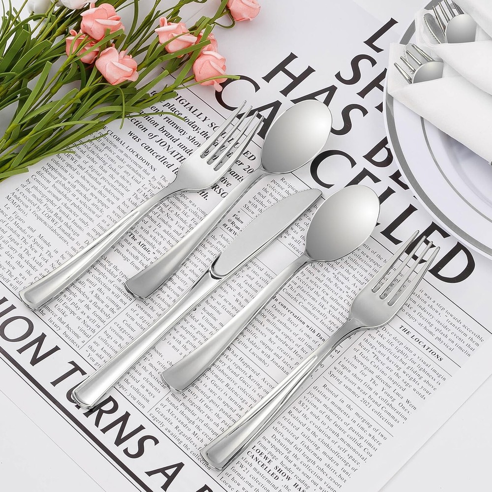 Goodluck 50 Pack Pre Rolled Silver Plastic Silverware, Wrapped Plastic Cutlery Set with Napkin Include 50 Forks, 50 Knives, 50 Spoons and 50 Napkins, Fancy Disposable Silverware for Party, Wedding Product Details Color: Silver Brand: Goodluck MPN: YS50PC UPC: Does not apply EAN: Does not apply Material: Plastic Color: Silver Brand: Goodluck Handle Material: Plastic Finish Type: Polished Material: Plastic Color: Silver Brand: Goodluck Handle Material: Plastic Finish Type: Polished Is Dishwasher Safe: No Manufacturer: Goodluck Product Dimensions: 6 x 8 x 14 inches Item Weight: 3.12 pounds Country of Origin: China Date First Available: May 3, 2023 Pre-rolled Convenience - As the perfect disposable utensils, you don't even have to worry about buying napkins. Our silver silverware set, paired with these pre-rolled napkins, makes your event a breeze. Safe Disposable Silverware Set - This silver plastic cutlery is 100% food-grade, made from BPA-free and heavy-duty plastic, ensuring minimal cracks and breakage during transportation and use. Elegant Silverware - These wrapped plastic cutlery sets go above and beyond any plain white or transparent plastic cutlery sets. With crisp white napkins and exquisite silverware, your parties are elevated with elegance and luxury. Perfect for Any Occasion - Whether it's birthdays, kids' parties, banquets, weddings, or various holidays like Valentine's Day, St. Patrick's Day, Easter, graduation season, Mother's Day, Father's Day, Halloween, Thanksgiving, Christmas, you name it, our rolled silverware disposable is ready to impress. WHAT YOU GET - A convenient 50-pack that includes 50 forks, 50 spoons, 50 knives and 50 napkins. Our disposable pre-rolled silverware ensures a hassle-free post-party experience, freeing you to savor moments with family and friends instead of worrying about cleanup.
