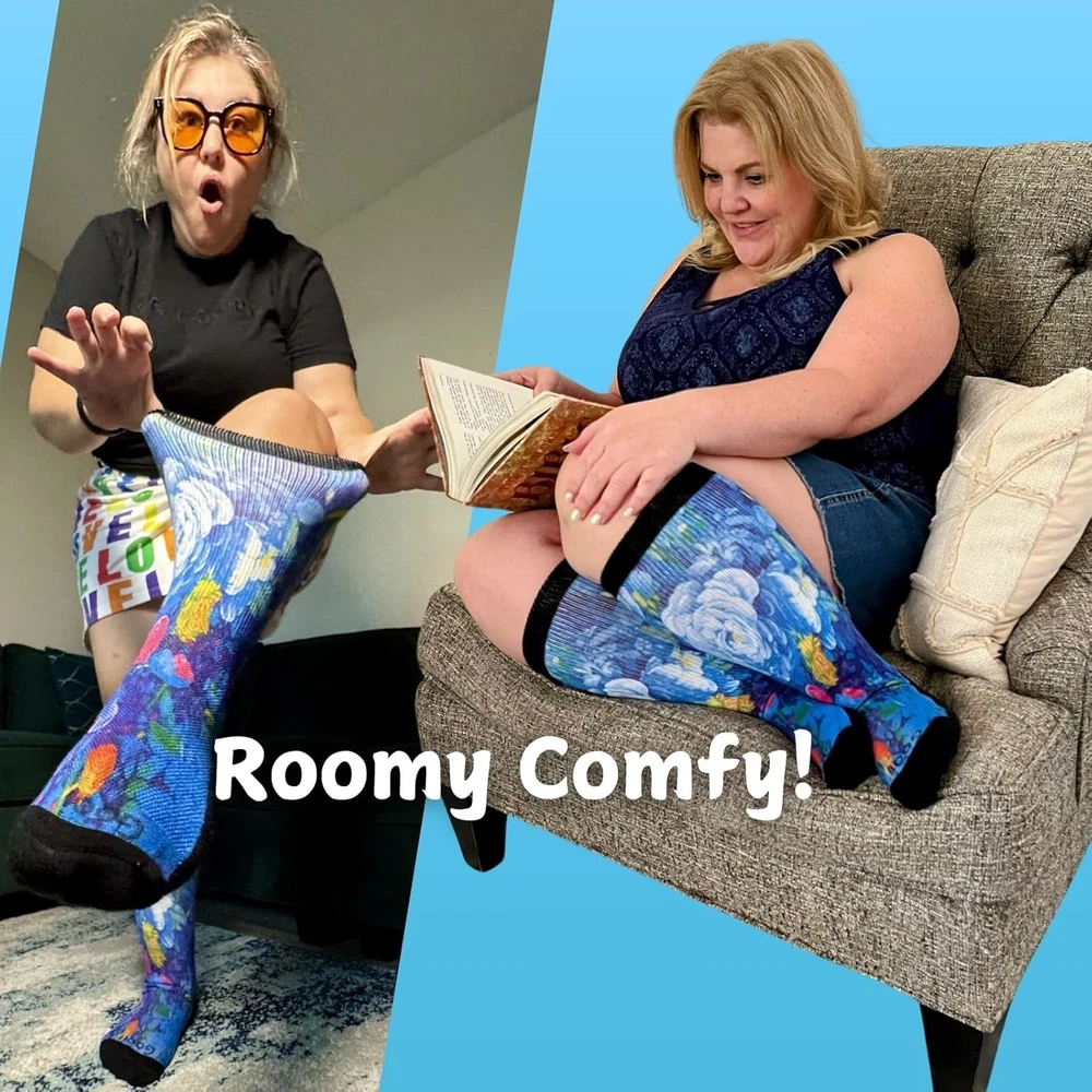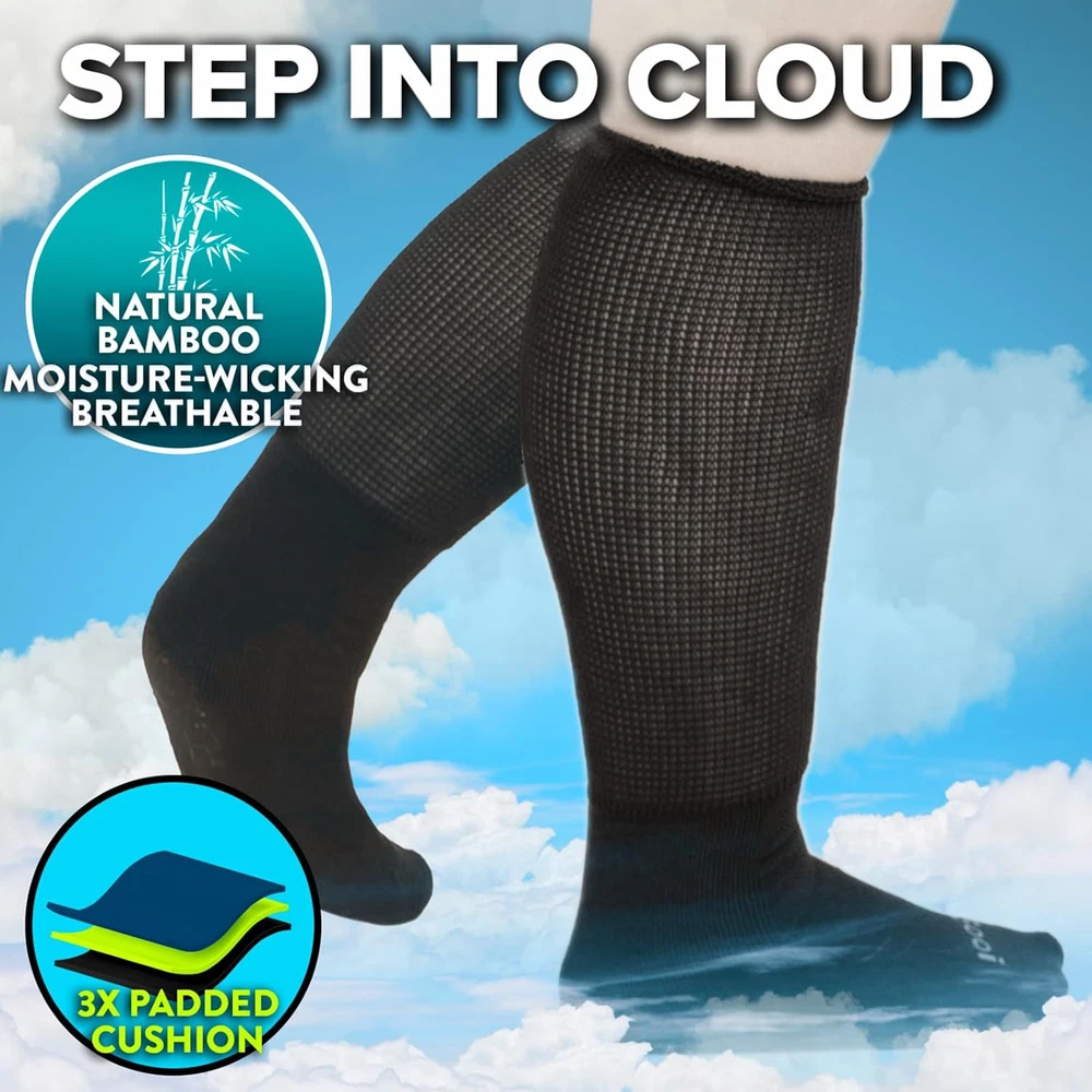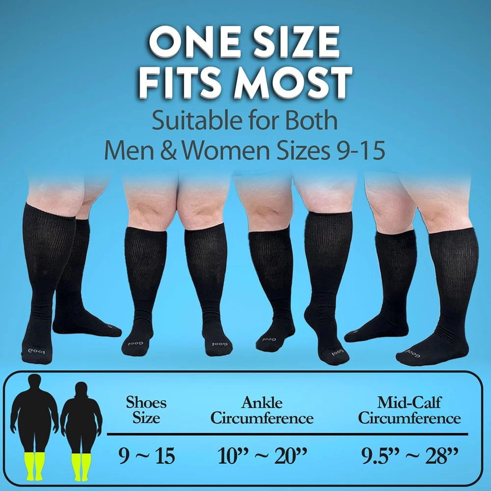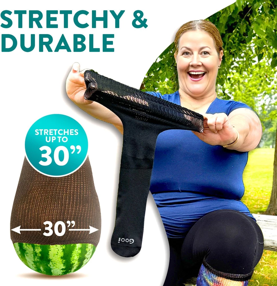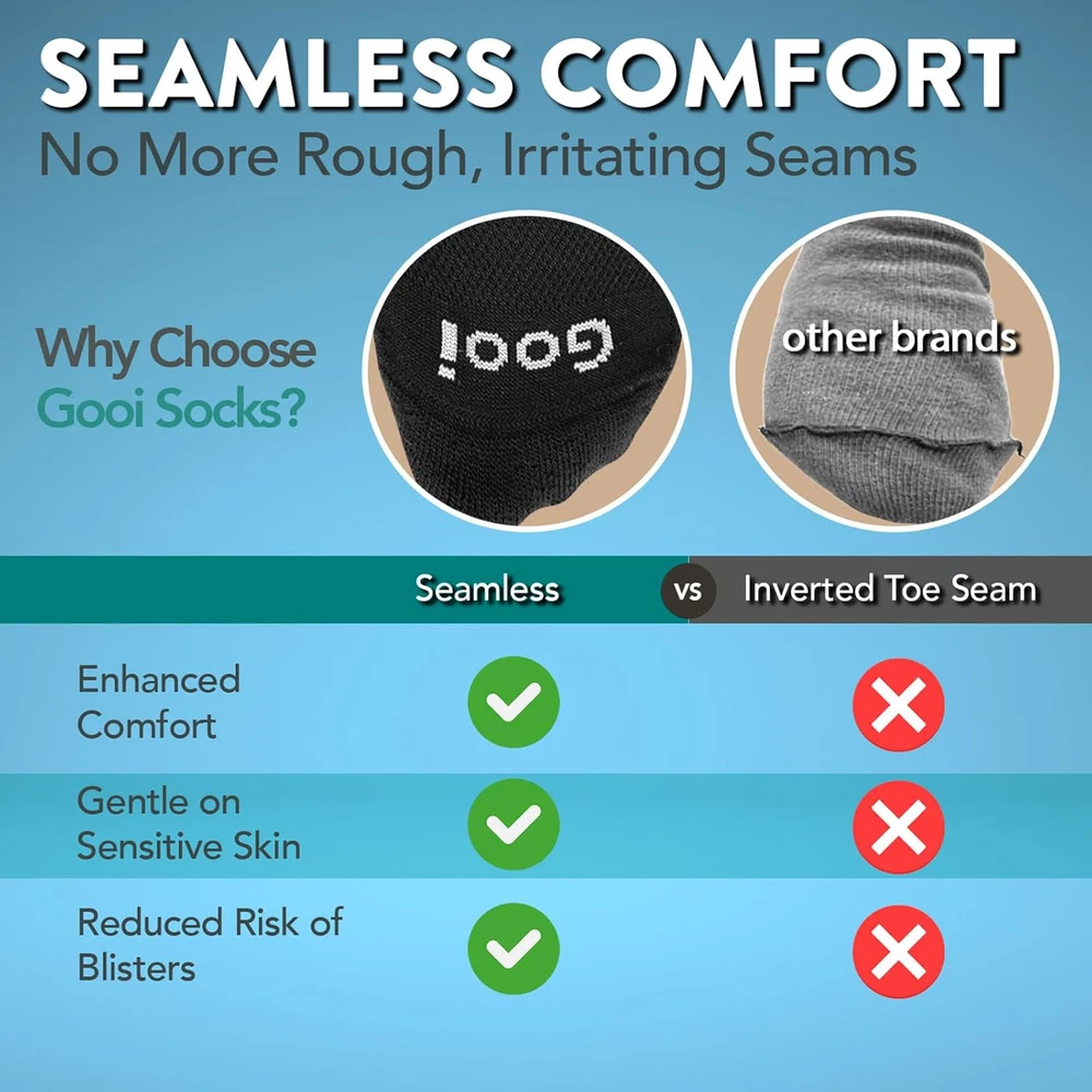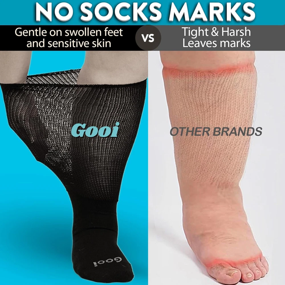 Non-binding Top: The loose, stretchy cuff reduces pressure on the leg and avoids restricting circulation, helping to prevent swelling. Gooi Socks with an ultra-wide, non-binding top are ideal for swollen ankles and calves, ensuring comfort without tight elastic bands. Gooi's Seamless Toe prevent rubbing and irritation, which can cause blisters or ulcers. This design is crucial for those with sensitive or diabetic feet, eliminating the discomfort of bulky seams and providing a roomy toe box to avoid constriction. Moisture-wicking, Breathability, Odor control: Gooi socks made from moisture-wicking fabrics, help keep feet dry by absorbing sweat and reducing friction. Breathable, lightweight materials enhance airflow. Extra padded Cushioning provides shock absorption and comfort, especially for sensitive or swollen feet. Thick, plush cushioning helps protect against foot fatigue and the formation of calluses, all without feeling too restrictive. Easy On/Off: The loose, stretchy design makes these socks easy to put on and take off, especially for those with limited dexterity. The stretchy top accommodates swollen feet, allowing for easy pull-on styles that reduce the strain during wear.