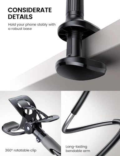 Return Policy Fast Delivery Trusted seller Gooseneck Phone Holder for Bed - Cell Phone Mount Clamp Clip, Flexible Long Arm, Overhead Mount for Desk Headboard Bedside, for iPhone 16 Pro Max, 15 Pro Max, 14 Plus, 13 Mini & 4-7" Phone Product Description 【Upgraded Version】Based on the pain points of similar products "Very shaky. Sag slowly after a period and can't keep a position for your phone anymore", the arm of our gooseneck phone holder for bed adopts better materials and design. It has improvements in both stability and durability. Noted: the long arm is not a super flexible type, which aims to add stability. 【Multipurpose Phone Holder】The gooseneck phone clamp mount is designed to: watch Netflix handsfree while lying in bed or sofa at home, use facetime with families when clipped on the desk, read recipes in the kitchen, taking selfies. And it also can be an overhead phone holder for video recording. 【Easy to Install】Featuring the adjustable clamp base varying from 0 to 2.36 inches (6cm), the cell phone clip holder can be securely mounted on the bed frame, bedside, headboard, nightstand, desk, end table and kitchen counter etc. A non-slip silicone base won't scratch the surface of your furniture. 【Stable and Durable】As for the 33.4 inches (85cm) bendable lazy long snake arm, high- quality Aluminum-magnesium alloy solid core makes the lazy arm sturdy enough to hold his phone firmly, yet flexible to bend in any direction to accommodate your view. It will be a lifesaver for protecting you from neck pain. 【Support 4-7'' Smartphones】The 360-degree phone lazy bracket is compatible with 4-7'' devices, namely almost all cell phones, like iPhone 16 Pro Max, iPhone 16 Plus, iPhone 15 Pro Max, iPhone 15 Plus, 14 13 Pro Max, 12 Mini 11 Pro XS Max XS XR X 8 Plus 8 7 Plus 7 6S Plus 6S 6 SE, Galaxy S24 S24+ S24 Ultra, S23 S23+ S23 Ultra, S22 S21 S20 S10 Edge etc. Shipping Returns Payment Shipping Shipping is FREE to all addresses other than APO/PO boxes in the lower 48 states. All our stock ships from US-based warehouses. Shipped via USPS or UPS (depending on location and package weight) Unless stated otherwise, all orders will ship within 24-72 hours of your payment being processed. Check our feedback to see the great reviews of FAST shipping we offer. Returns Seller does not accept returns Payment We currently accept payment via eBay managed payments only. Once payment is cleared, we will dispatch your shipment within 1-3 business days. Please refer to the "Shipping" tab for more information regarding shipping speed to your destination.
