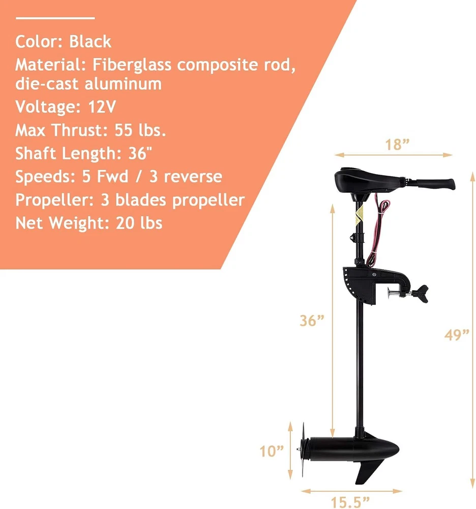 brand name (item): ‎Goplus size (item): ‎55LBS recommended uses for product: ‎For Fresh Water, For Sail Boats, For Salt Water operation mode (item): ‎Electric operation mode: ‎Electric gtin13: Does not apply mounting type (item): ‎Transom Mount package weight (item): ‎26 Pounds maximum horsepower (item): ‎0.62 Horsepower brand (item): ‎Goplus voltage: ‎12 Volts item package dimensions l x w x h (item): ‎51 x 19 x 7 inches manufacturer (item): ‎Goplus Corp color (item): ‎Black voltage (item): ‎12 Volts item package dimensions l x w x h: ‎51 x 19 x 7 inches ASIN: B08NVRFKL1 fuel type: ‎electric engine type: ‎Electric mounting type: ‎Transom Mount Brand: ‎Goplus manufacturer: ‎Goplus Corp material: ‎Aluminum fuel type (item): ‎electric UPC: Does not apply engine type (item): ‎Electric material (item): ‎Aluminum maximum horsepower: ‎0.62 Horsepower package weight: ‎26 Pounds