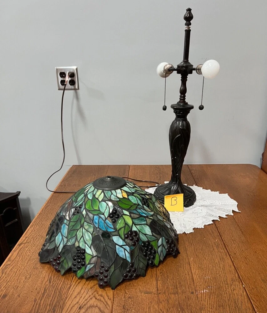 Gorgeous Dale Tiffany Stain Glass Lamp, Grape Vine Shade With Over 100 Jewels- #B Beautiful Lamp, The Pictures Don't Do It Justice. Excellent Working Condition, Very Heavy. There Is Some Chipping Of The Bronze Finish Up Where The Chain Ball Rubbed On The Lamp-See Last Photo Measures Approx 28"H Shade Approx 19"W x 10"D Bulbs not included We have 2 of these lamps - check out of other listings if interested in both Please see photos for details and condition ***Most items ship within 2-3 business days*** **** I ONLY SHIP WITHIN THE LOWER 48 OF UNITED STATES **** Please note: Shipping charge posted to this listing is based on shipping within the lower 48 of United States – if you live outside of the continental US and are interested in one of my items, please message me prior to purchasing the item so that I can provide you with accurate shipping charges. The only exception would be if you qualify for eBay’s international shipping that first processes through a domestic hub. Failure to do so could result in your purchase being cancelled.