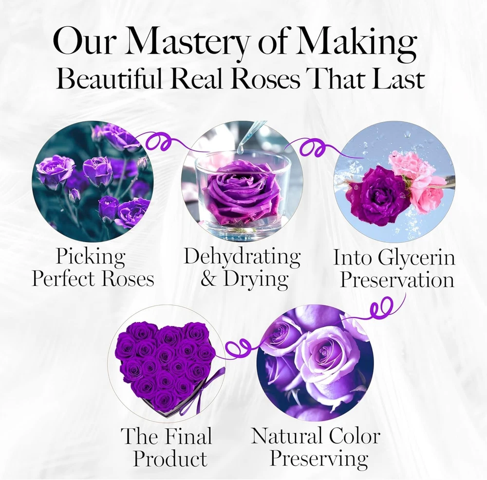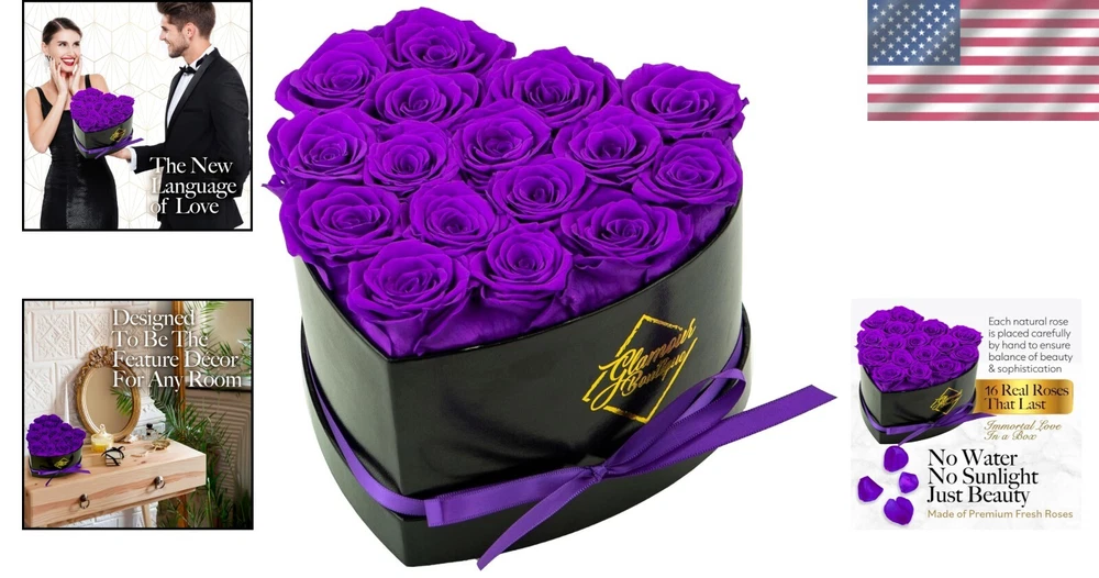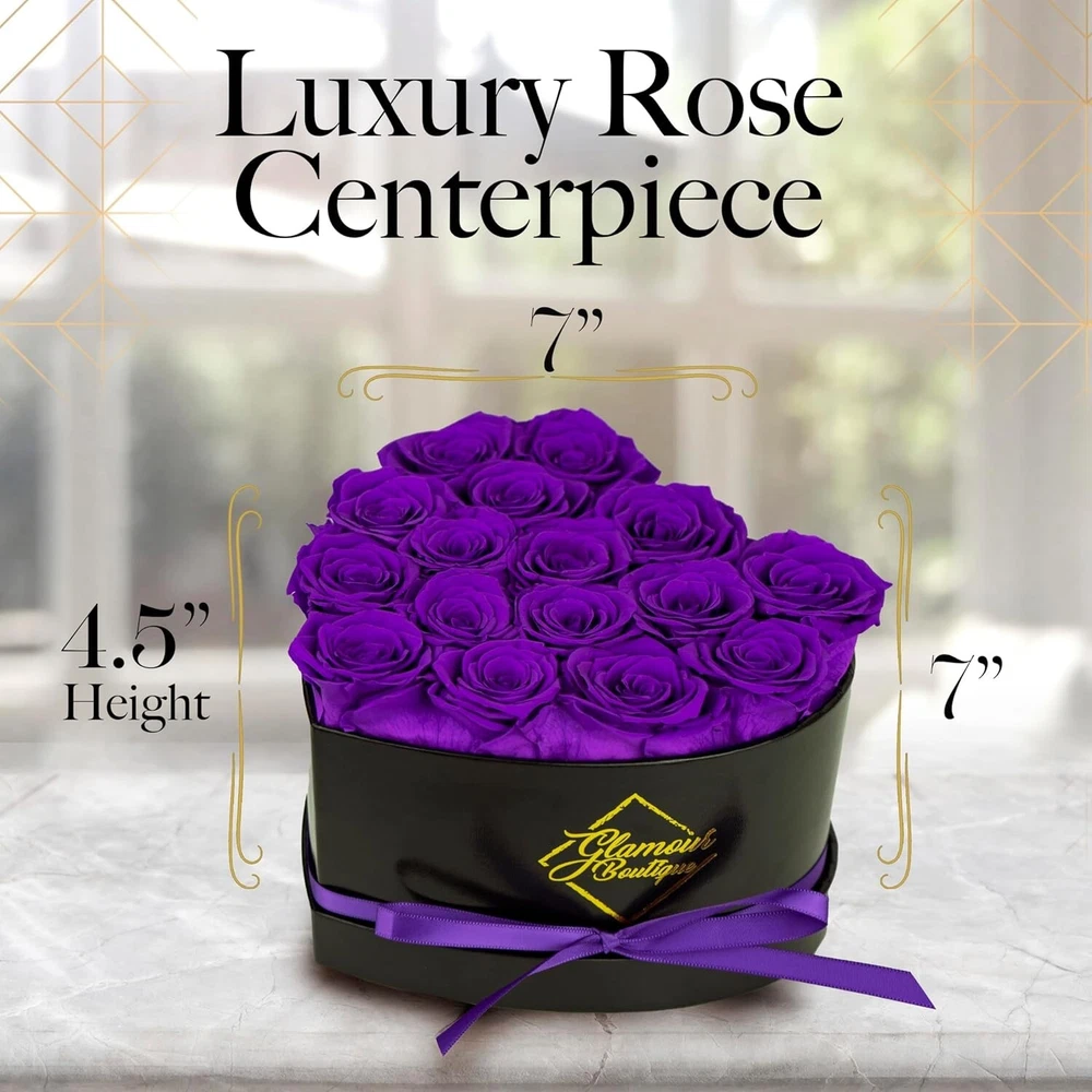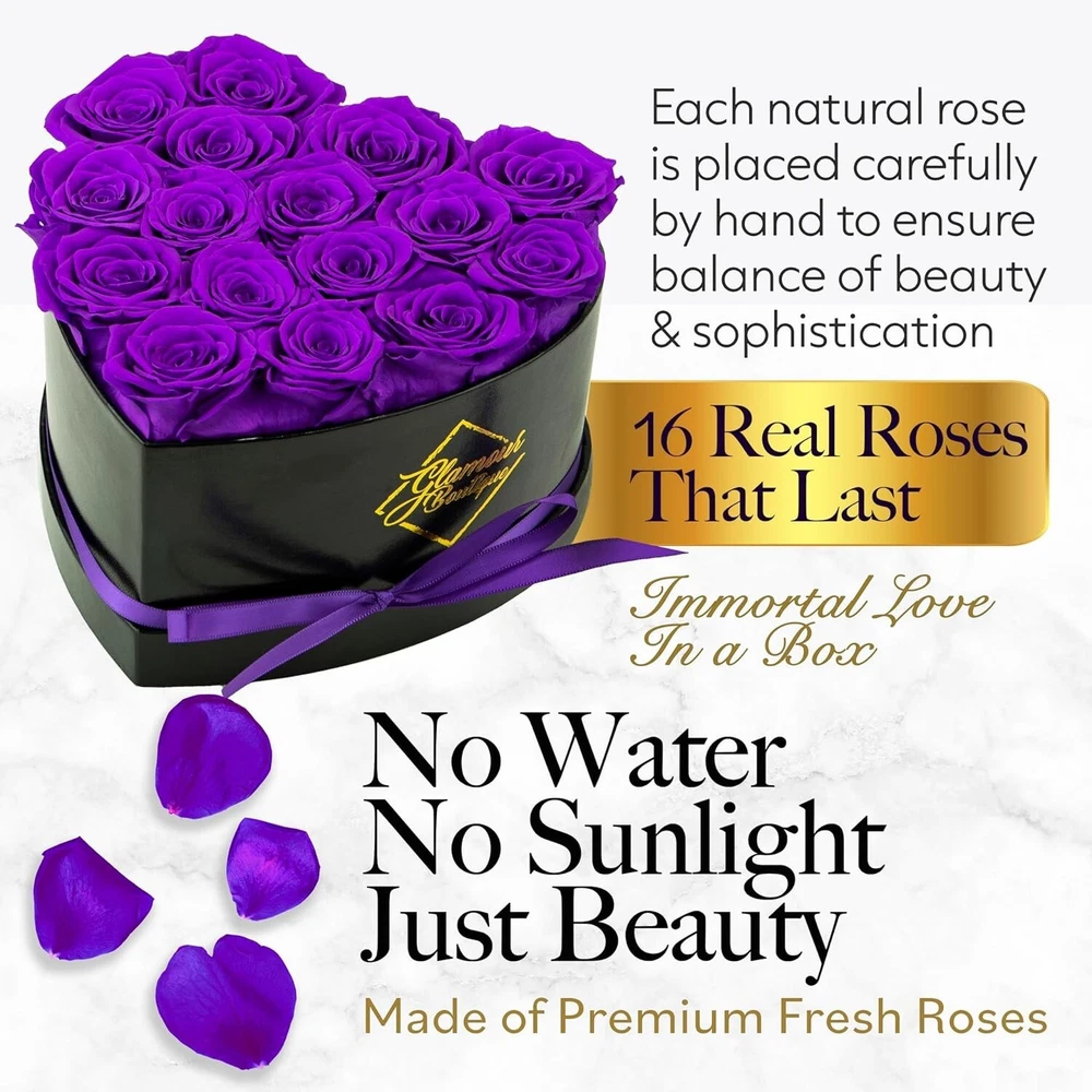 Artificial/Fresh: Artificial Brand: Unbranded Material: Preserved Flowers, Real Roses Personalized: No Common Name: Rose, Eternal Rose, Immortal Rose, Preserved Rose Form: Arrangement & Centerpiece Item Width: Preserved Roses Product: Preserved Roses Batteries Required: No Theme: Hearts Type: Flower Box Item Weight: 1.43 Pounds gtin13: Does not apply Occasion: Valentine's Day Color: Purple Product Dimensions: 7 X 7 X 4.5 Inches Number in Pack: 1 Size: 16 roses UPC: Does not apply Personalize: No