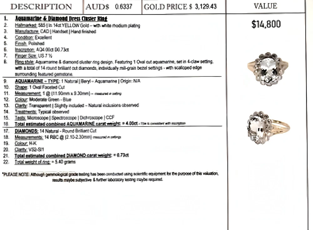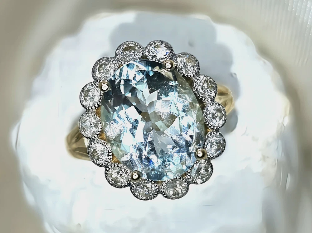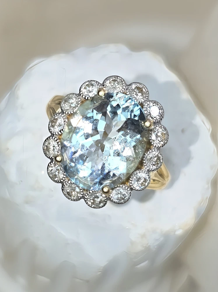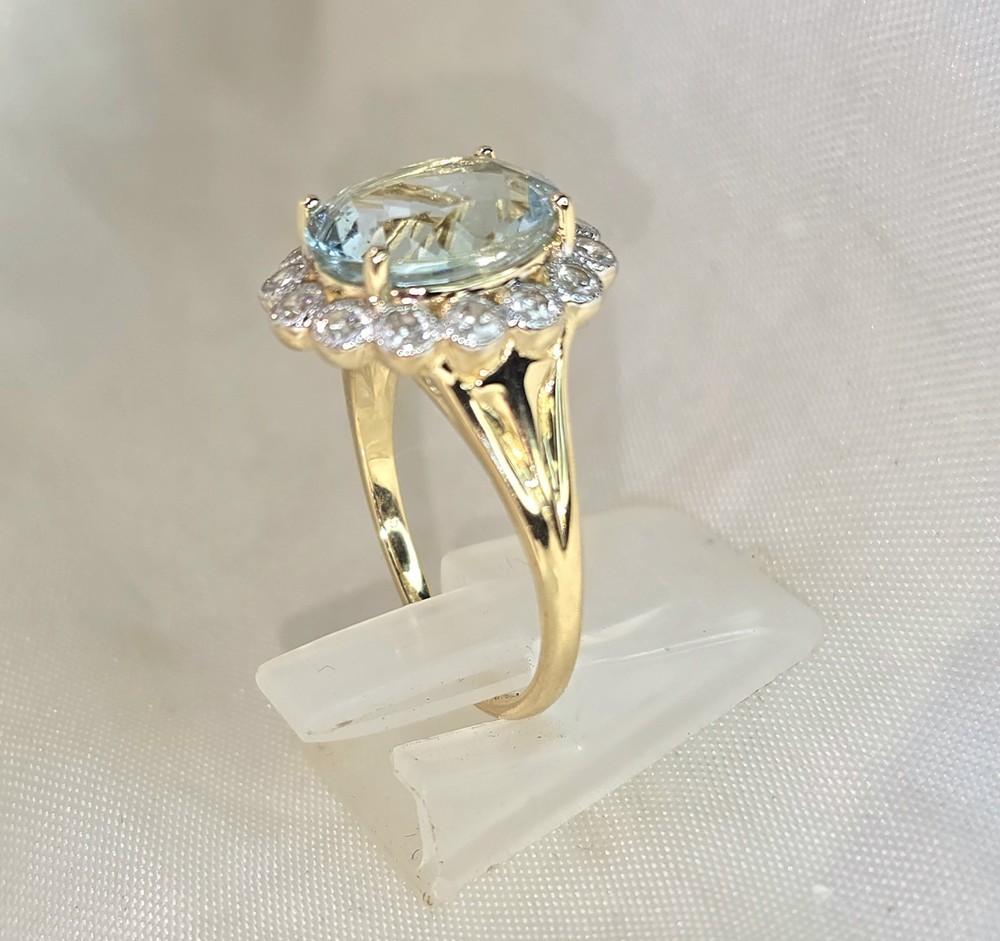 All pieces are sourced direct from the manufacturer. Brand New THE REYNA COLLECTION MARCH BIRTHSTONE 19th ANNIVERSARY MOHS: 7/7.5 DESCRIPTION Crafted in 14ct White & Yellow Gold & Featuring 1x Natural Bright Blue Aquamarine in an Oval Cut, held in a 4 Claw Setting & Surrounded by a Natural White Diamond Halo. Weight: 5.40 grams Ring Size: O (7.5) Resizing Available at Industry Prices on all Purchases 14x Natural White Round Brilliant Cut Diamonds Weighting a Total of .73cts 1x Natural Bright Blue Aquamarine in an Oval Cut Weighting a Total of 4.00cts ACCREDITATION Australian Industry Standard Registered Diamond Grader & Gemmologist NAJA, JAA & GAA Member Independent Valuation Provided Retail Replacement Value $14,800.00 We Source All Jewellery Directly From The Manufacturer, Guaranteeing Authenticity. All Brand New Pieces Come With A 12 Month Manufacturing Warranty. AQUAMARINE & JEWELLERY FACTS The name Aquamarine was Inspired by the Gemstones Resemblance of the Ocean, It is often associated with calmness, clarity, courage, and faithfulness. Sailors treasured it as a talisman for protection and courage at sea, and it was also believed to bring happiness in marriage. Beryl Gem Family, with Morganite, Emerald & Heliodor Gold isn't produced by Earth, it comes from space via comets, meteorites, & asteroids hitting the planet over 4.5 billion years. Some experts believe mineable Gold deposits maybe depleted as soon as 2035, driving up prices that Gold is now more expensive than Platinum! CLEANING UR AQUAMARINE JEWELLERY Soak your aquamarine jewellery in the soapy water and let it sit for 30 minutes or so. Use a toothbrush and gently scrub the jewellery. Make sure not to scrub too hard and use a soft-bristled toothbrush if possible. Rinse off your jewellery with clean water and wipe dry with a cloth.