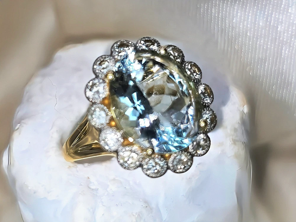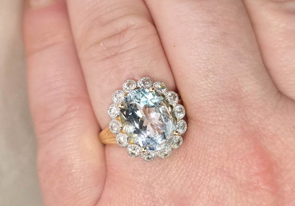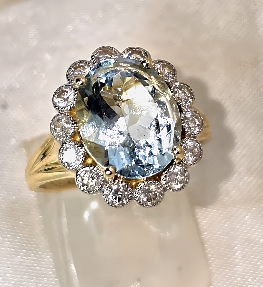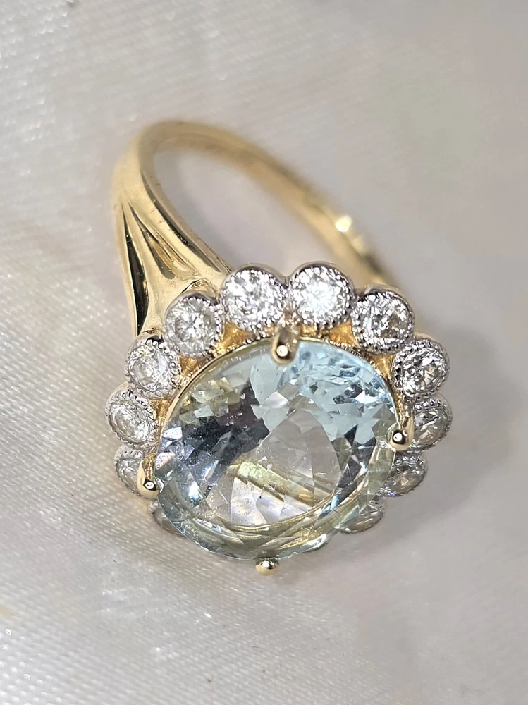 All pieces are sourced direct from the manufacturer. Brand New THE REYNA COLLECTION MARCH BIRTHSTONE 19th ANNIVERSARY MOHS: 7/7.5 DESCRIPTION Crafted in 14ct White & Yellow Gold & Featuring 1x Natural Bright Blue Aquamarine in an Oval Cut, held in a 4 Claw Setting & Surrounded by a Natural White Diamond Halo. Weight: 5.40 grams Ring Size: O (7.5) Resizing Available at Industry Prices on all Purchases 14x Natural White Round Brilliant Cut Diamonds Weighting a Total of .73cts 1x Natural Bright Blue Aquamarine in an Oval Cut Weighting a Total of 4.00cts ACCREDITATION Australian Industry Standard Registered Diamond Grader & Gemmologist NAJA, JAA & GAA Member Independent Valuation Provided Retail Replacement Value $14,800.00 We Source All Jewellery Directly From The Manufacturer, Guaranteeing Authenticity. All Brand New Pieces Come With A 12 Month Manufacturing Warranty. AQUAMARINE & JEWELLERY FACTS The name Aquamarine was Inspired by the Gemstones Resemblance of the Ocean, It is often associated with calmness, clarity, courage, and faithfulness. Sailors treasured it as a talisman for protection and courage at sea, and it was also believed to bring happiness in marriage. Beryl Gem Family, with Morganite, Emerald & Heliodor Gold isn't produced by Earth, it comes from space via comets, meteorites, & asteroids hitting the planet over 4.5 billion years. Some experts believe mineable Gold deposits maybe depleted as soon as 2035, driving up prices that Gold is now more expensive than Platinum! CLEANING UR AQUAMARINE JEWELLERY Soak your aquamarine jewellery in the soapy water and let it sit for 30 minutes or so. Use a toothbrush and gently scrub the jewellery. Make sure not to scrub too hard and use a soft-bristled toothbrush if possible. Rinse off your jewellery with clean water and wipe dry with a cloth.
