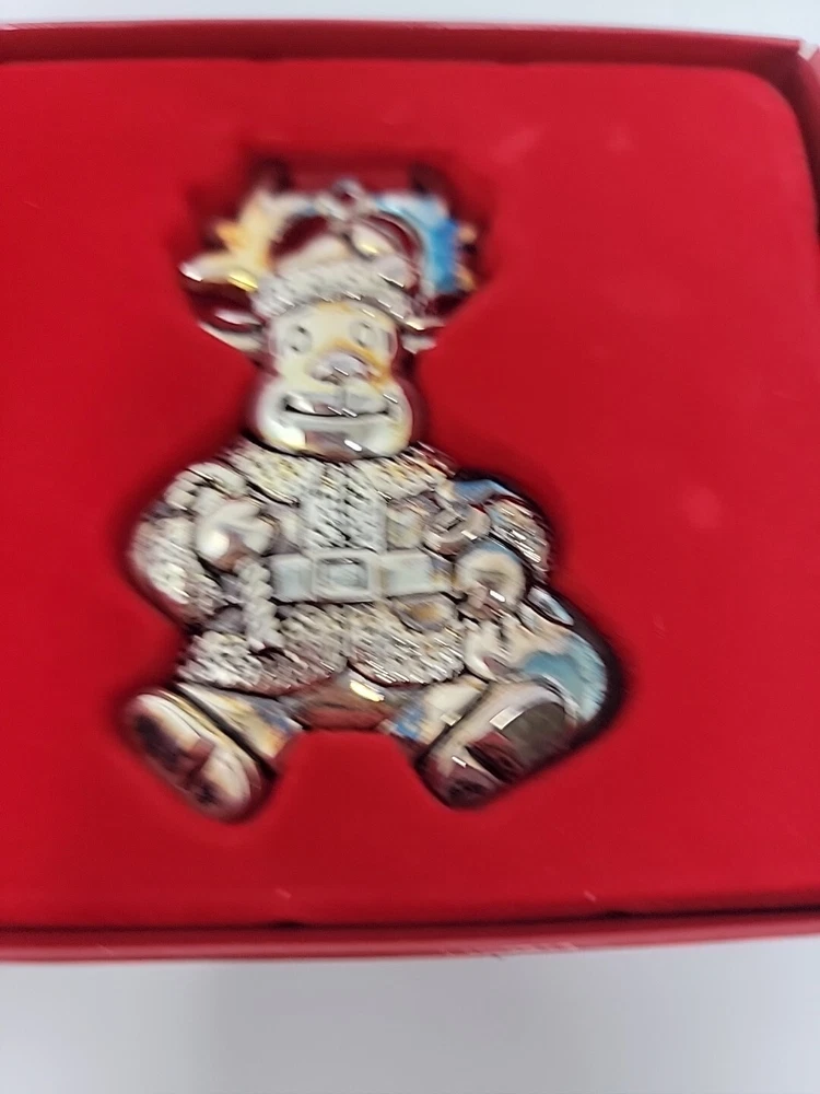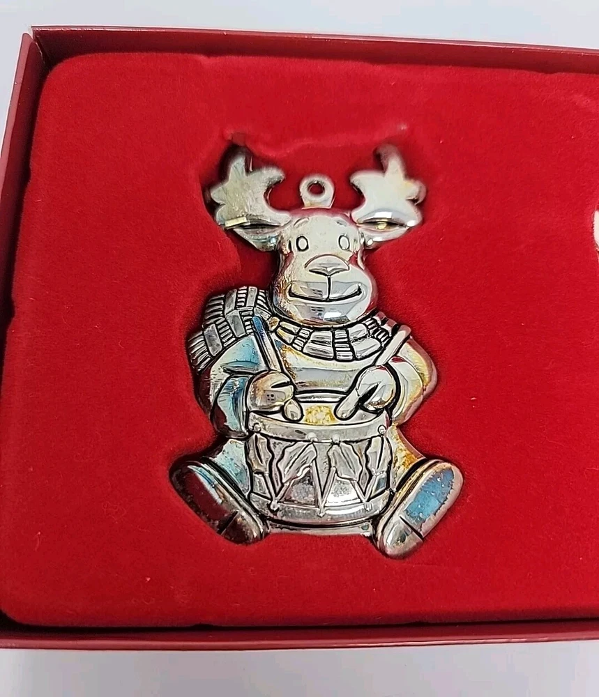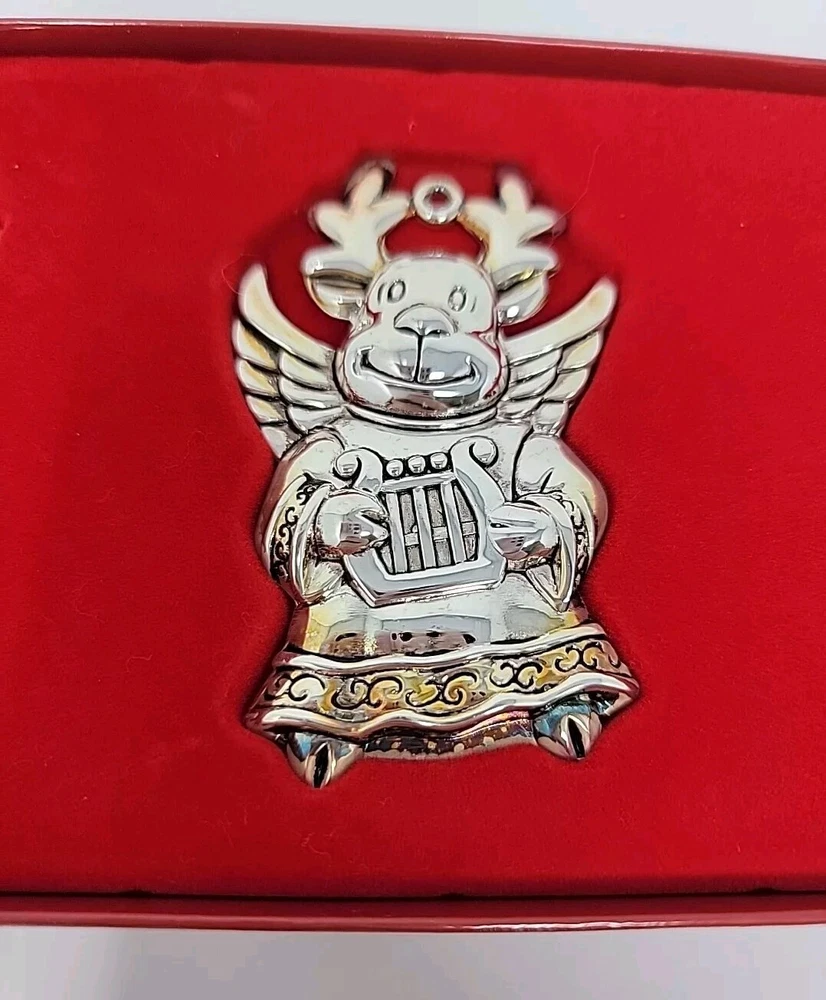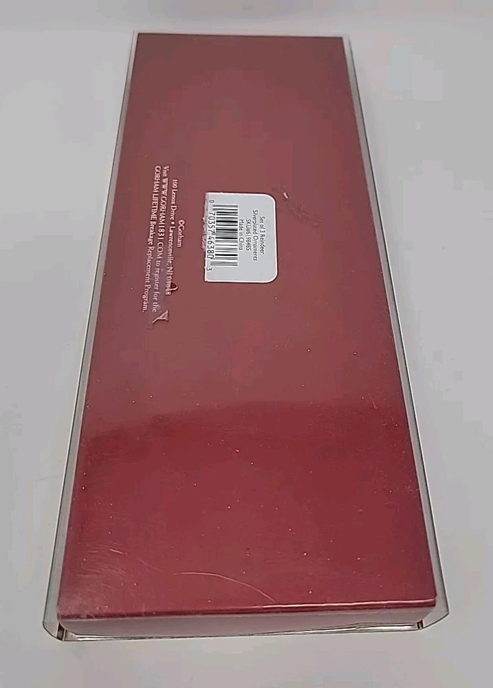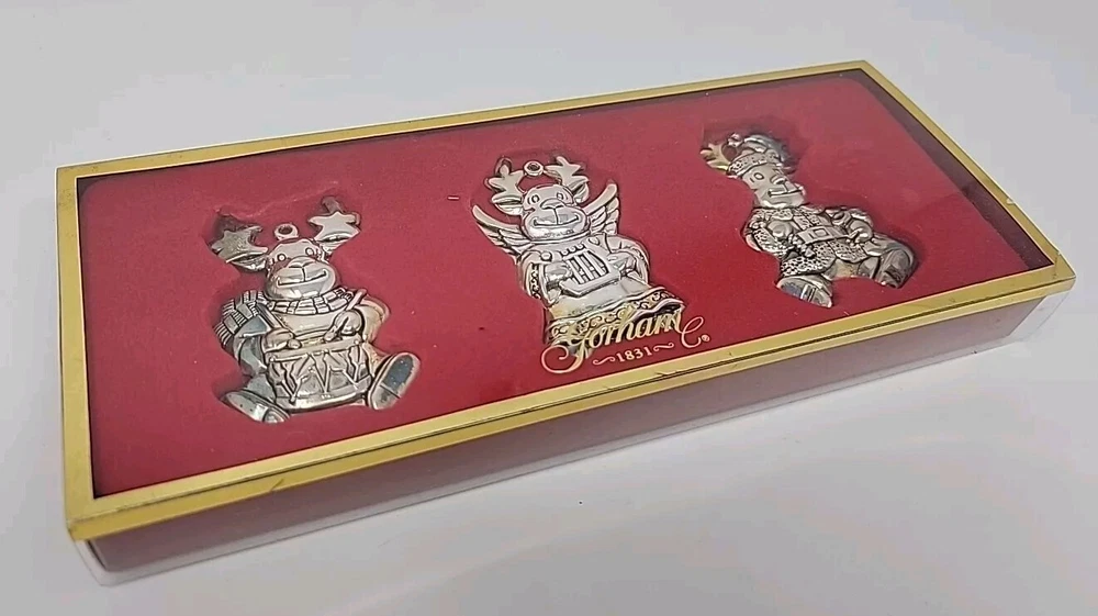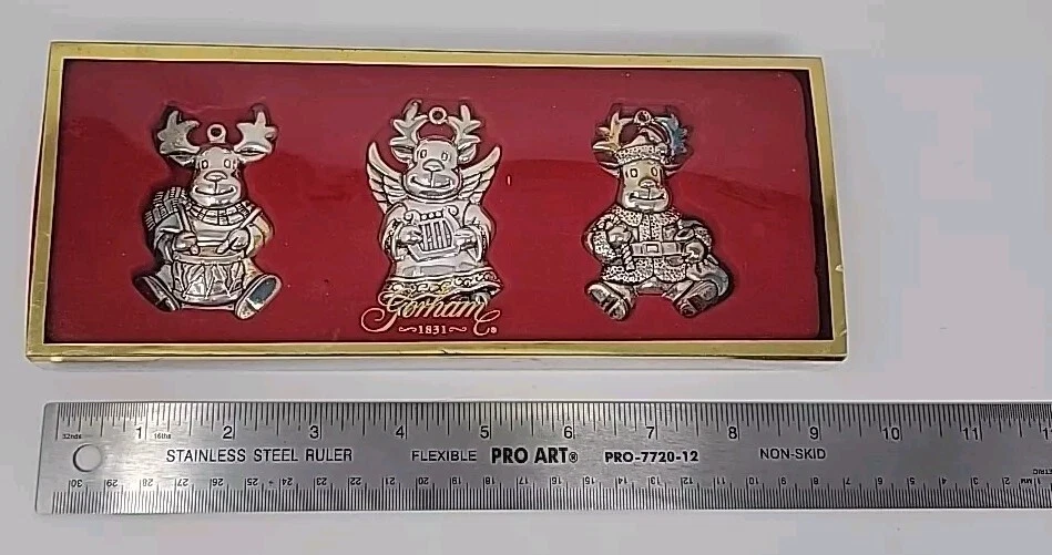 Add a touch of vintage charm to your Christmas decor with this set of three Gorham silver-plated reindeer ornaments. The medium-sized ornaments feature a mid-century modern style and are perfect for any Christmas occasion. Each ornament is an original piece from the Gorham Ornaments collection and is made of high-quality silver-plated material. Celebrate the holiday season with these beautiful and unique ornaments that are sure to impress your guests. The reindeer shape and silver color make them a perfect addition to any Christmas tree. Get into the festive spirit with these timeless and elegant pieces from Gorham.