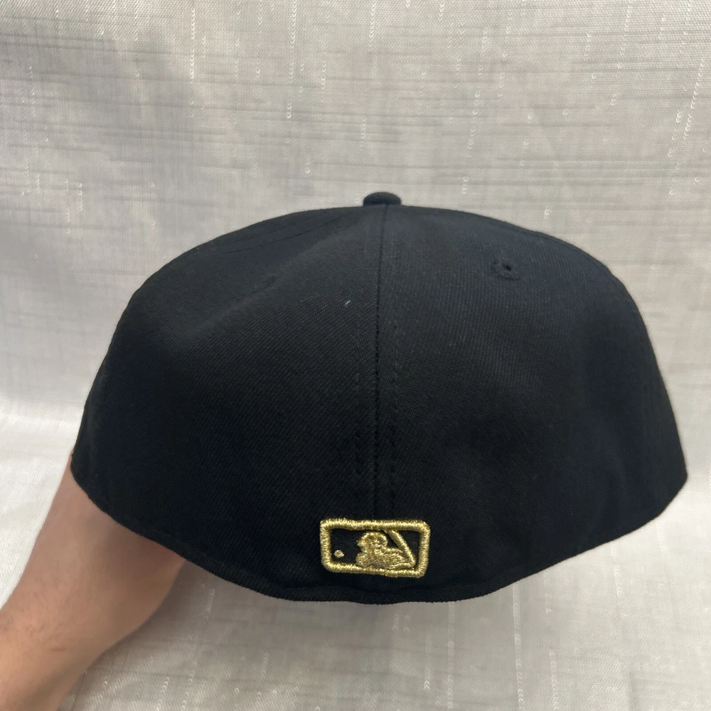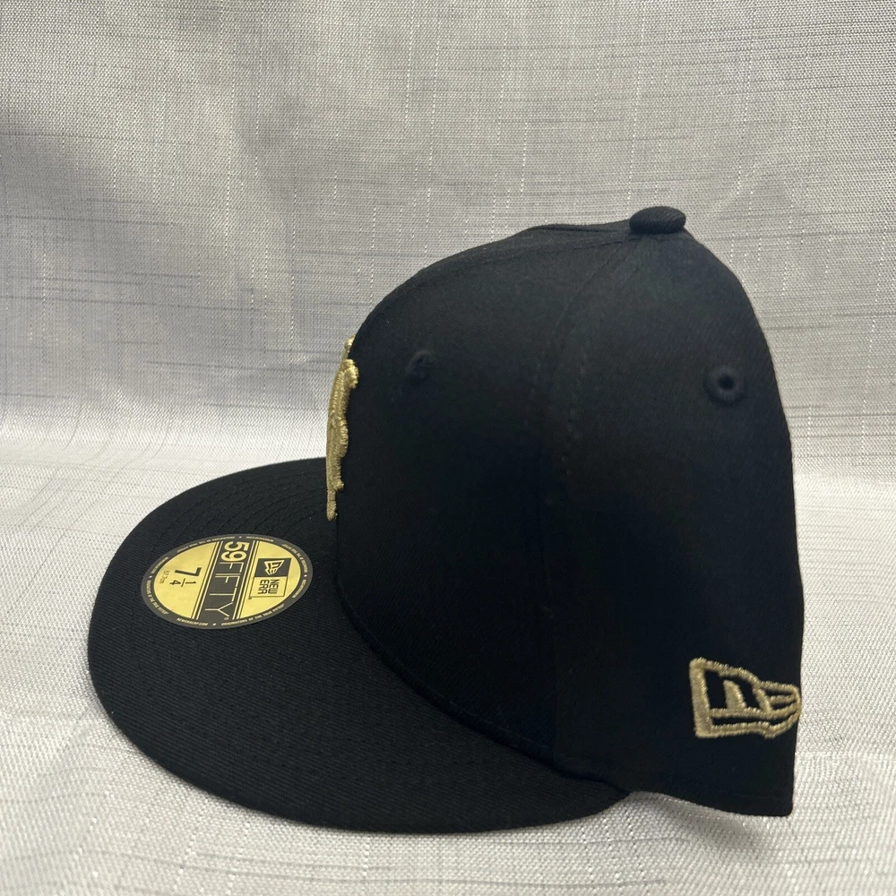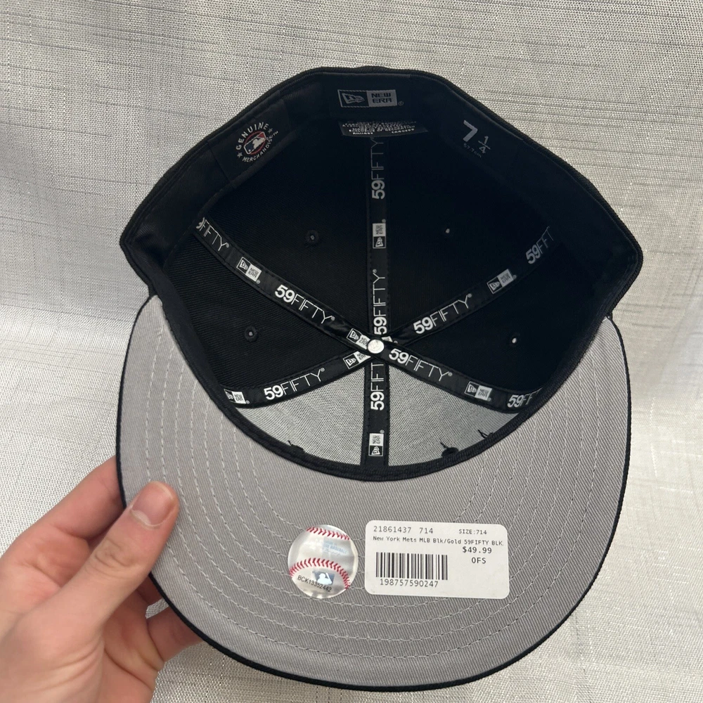 This is a New Era 59Fifty baseball cap featuring the New York Mets team in black and gold colors. It is made of polyester canvas material in a size 7 1/4. The cap is part of the MLB collection and suitable for unisex adults. It can be worn casually throughout all seasons and is not personalized or handmade.