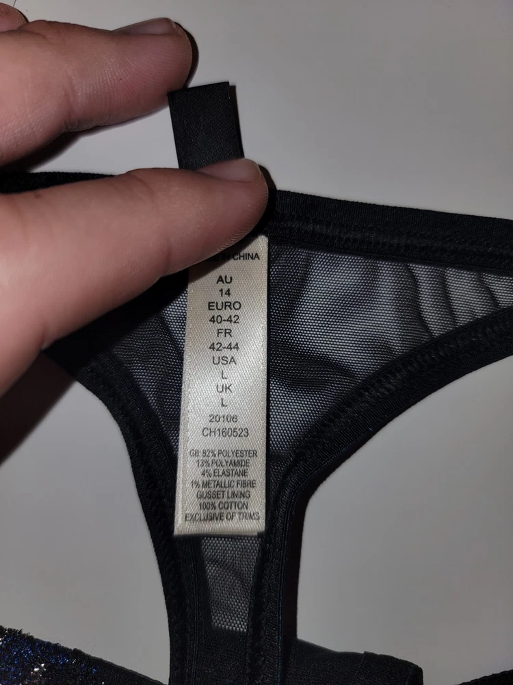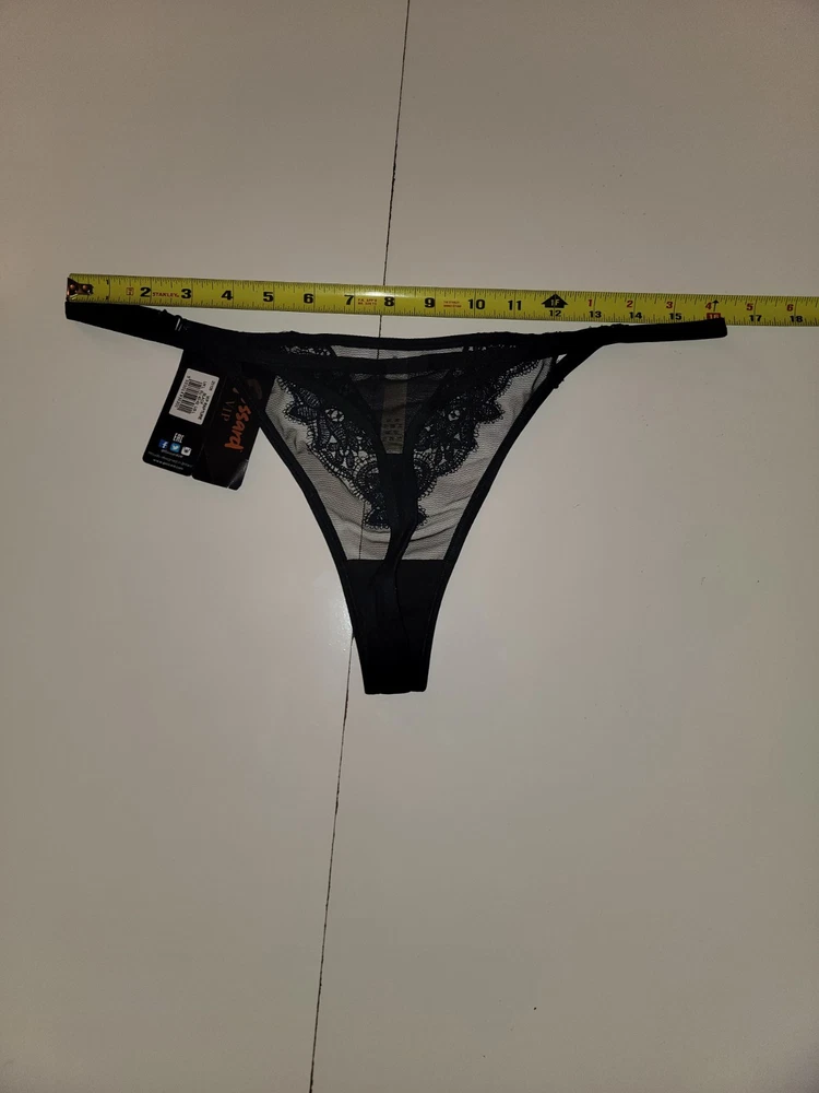 The Gossard VIP Rapture thong in size large features a semi-sheer floral lace design in black. Made of polyester, elastane, metallic fiber, polyamide, and cotton, this thong has a stylish thong/string style. Perfect for women looking for a sexy and comfortable underwear option.