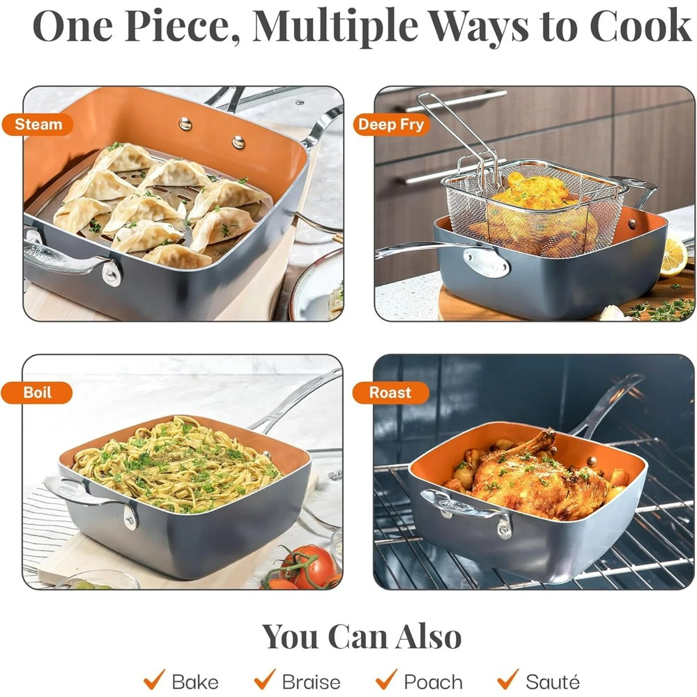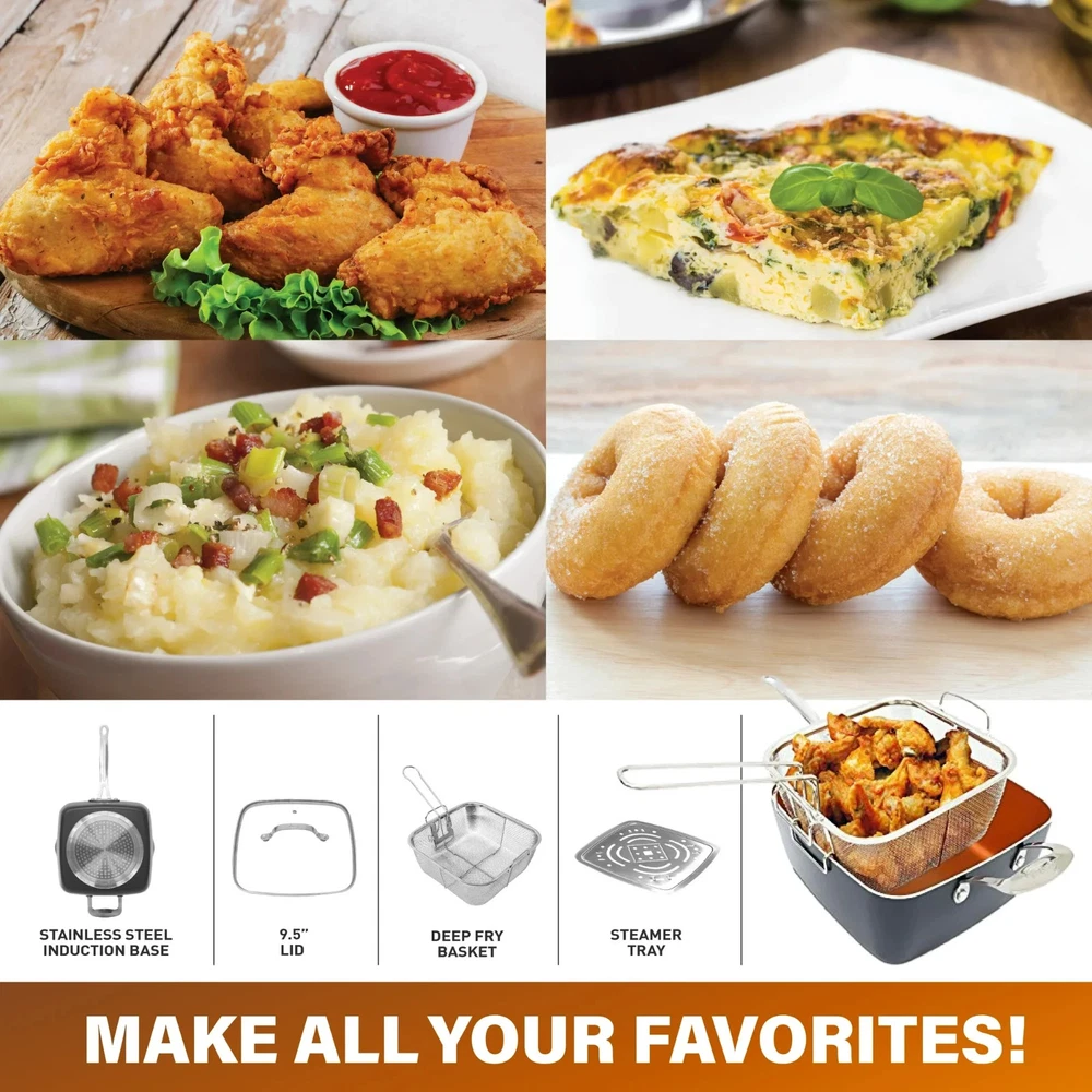 Gotham Steel Nonstick Deep Fry Pan 9.5" Square Ceramic Frying Pan Pot with Glass Lid 5.6 Quart with Basket Steamer Insert About this item Product details Enhance your cooking with the Gotham Steel 9.5" Deep Fry Pan Set, a must-have for any kitchen, offering versatility and ease of use. This 5.6-quart square pan is equipped with a ceramic-coated nonstick surface, allowing food to release effortlessly without the need for butter or oil, promoting healthier meals. Ideal for frying, steaming, baking, roasting, and more, this set includes a tempered glass lid, deep fry basket, and steamer tray, making it a perfect all-in-one solution for preparing your favorite dishes. The stainless steel induction bottom ensures even heat distribution and compatibility with all stovetops, including induction. Designed for durability, this pan can handle high heat and is dishwasher safe, making cleanup quick and easy. Experience efficient and healthy cooking with this premium deep fry pan set. 5.6 Quart Deep Fry Pan: Includes 9.5" square deep pan tempered glass lid deep fry basket steamer tray/trivet Versatile Cookware Set: Ideal for frying, steaming, baking, roasting, and boiling, this 9.5" square deep pan is perfect for a variety of cooking tasks. Ultra-Nonstick Ceramic Coating: The triple-layer ceramic surface ensures easy food release with less oil or butter, supporting healthier meal preparation. Safe Cooking Experience: Made without PTFE, PFOA, and PFOS, the ceramic coating ensures safe, non-toxic cooking without the release of harmful chemicals. Induction Ready & Even Heating: Equipped with a stainless steel induction bottom for fast and even heat distribution, compatible with all stovetops, including induction. Durable & Long-Lasting Design: Reinforced with titanium, this pan resists scratches and warping, retaining its nonstick properties even with daily use. Easy Cleanup: Dishwasher-safe for added convenience, this pan allows for quick and effortless cleaning, letting you focus on enjoying your meals. High-Heat Resistant: This pan withstands high temperatures, making it perfect for searing meats or cooking acidic dishes without altering flavors. High-Heat Resistant: This pan withstands high temperatures, making it perfect for searing meats or cooking acidic dishes without altering flavors.