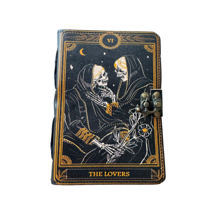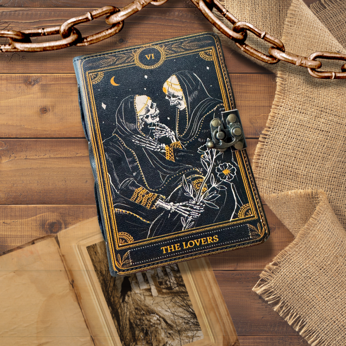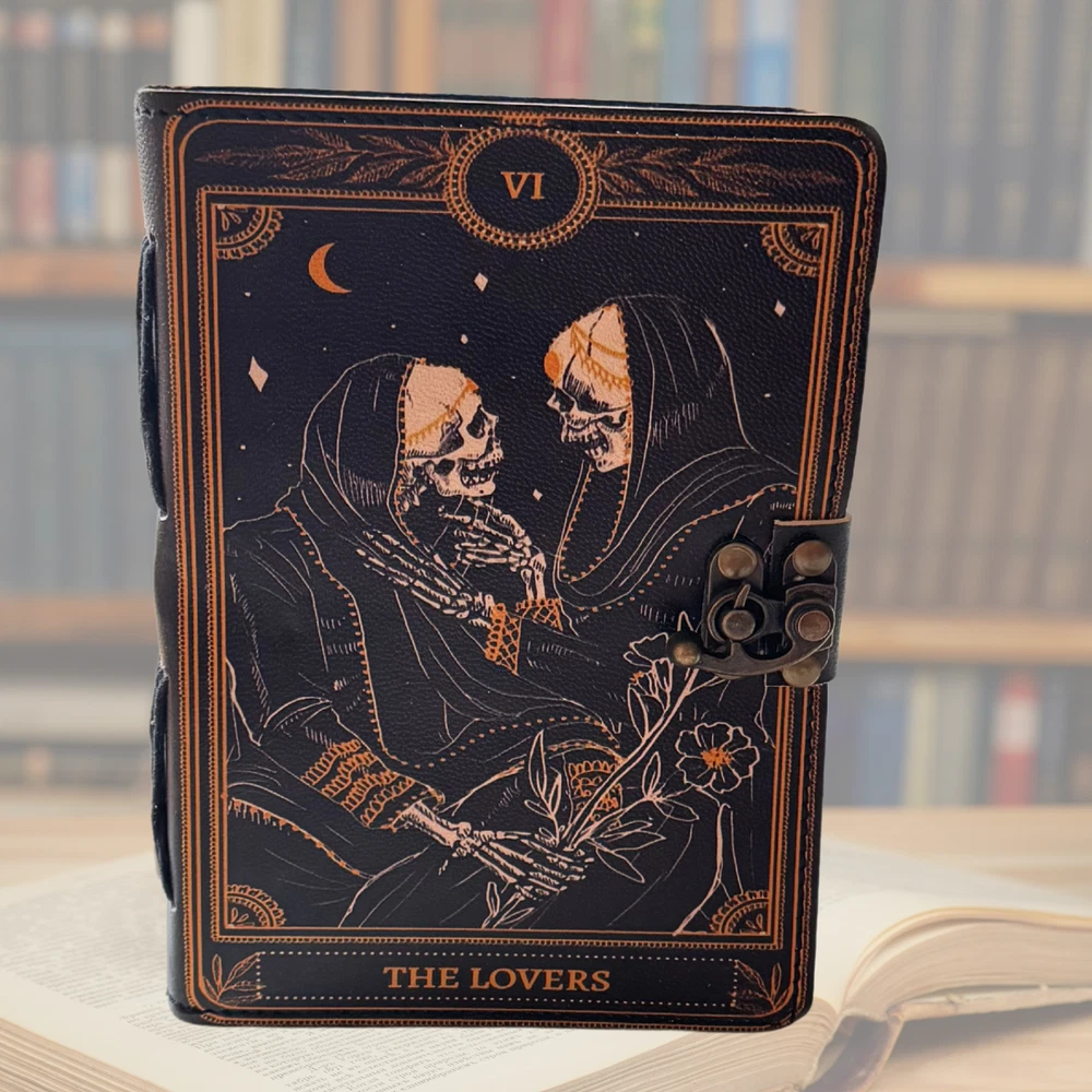 The Lovers Tarot Notebook – A Mystical Leather Grimoire Step into the realm of magic and mystery with The Lovers Tarot Notebook, an exquisite Leather Gothic Book of Spells designed for those who embrace the mystical and the macabre. Whether you're a devoted practitioner of the occult, a tarot enthusiast, or someone who appreciates dark and antique aesthetics, this Grimoire Printed Journal Notebook is your perfect companion. 📖 Features: Premium Leather Cover with a beautifully printed Lovers Tarot Card design, symbolizing destiny, duality, and deep connections. Aged antique-style pages that capture the essence of ancient spellbooks and secret grimoires. Compact yet spacious, making it ideal for spellwork, dream journaling, tarot readings, or personal musings. Gothic and mystical aesthetics, perfect for fans of Skull Lover artwork and vintage book collectors. Use it as a personal grimoire, a diary for your moon rituals, a spell journal, or an artistic notebook for your gothic poetry. This antique journal is more than just a notebook—it’s a portal to your thoughts, spells, and spiritual journey. 🎁 A Unique Gift for Gothic & Witchy Souls Looking for a mystical and meaningful gift? This Lovers Tarot Notebook makes a perfect choice for witches, tarot readers, gothic writers, and antique journal lovers. ✨ Let the magic of The Lovers guide your journey—order yours today! ✨ Ships from Melbourne within 1-2 business days via tracked postage.