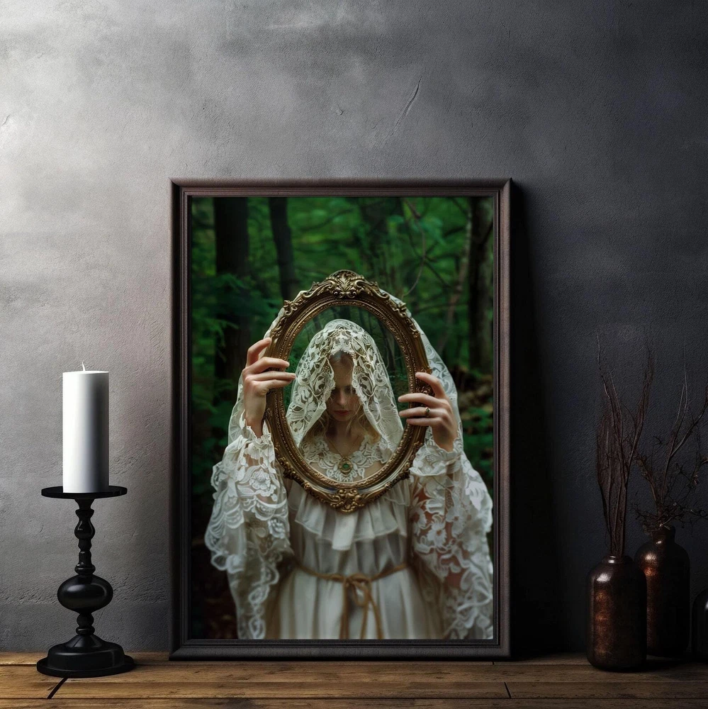 Gothic Woman With Mirror Art Print Dark Academia And Moody Victorian Decor Cottagecore Wall Art Material: Premium luster photo paper Print type: Inkjet printing One side printed + The finish provides the highest possible resolution and color saturation + Lasts up to 200 years in color and 400 years in black-and-white + Printed on high-quality resin-coated photo base paper medium + Posters can be hung with double-sided tape, tacks, or framed + Hand washing with a gentle cry cloth is recommended for extended durability I will hand select the best choice of paper for your chosen design to ensure top quality results for a beautiful, bright and luxurious print. All prints are sealed in cellophane slips for protection during transportation, and are shipped in a protective cardboard envelope.