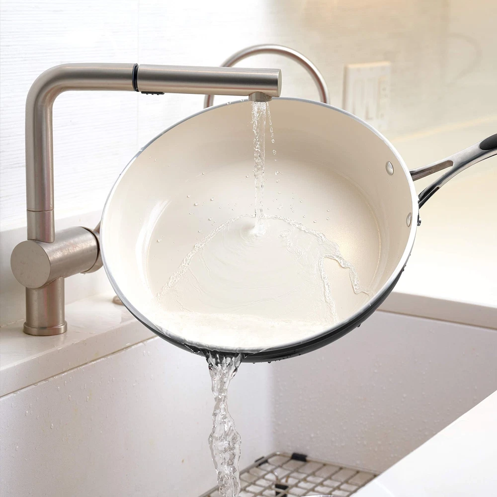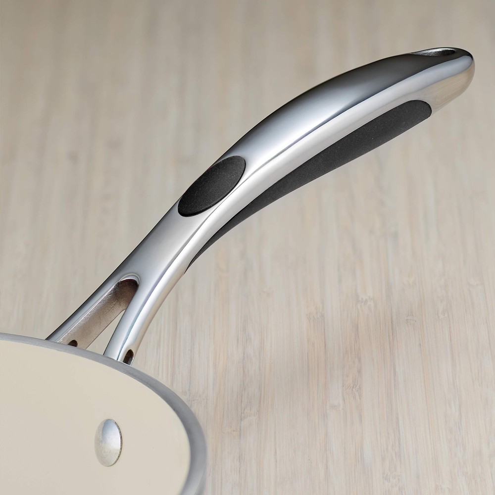Cold-forged, heavy-gauge aluminum construction for even heat distribution with a durable, easy-to-clean Metallic Black porcelain enamel exterior Ceramic nonstick interior provides a healthy, quick release and easy cleanup cooking surface Ergonomically designed, cast stainless steel handles feature a stay-cool, soft-grip accent with a convenient hang-hole for use with pot racks Dishwasher and oven-safe (up to 350 Degree Fahrenheit or 176 Degree Celsius); compatible with gas, electric and ceramic glass cooktops Made in Italy, assembled and packaged in the USA and offered under a Lifetime warranty