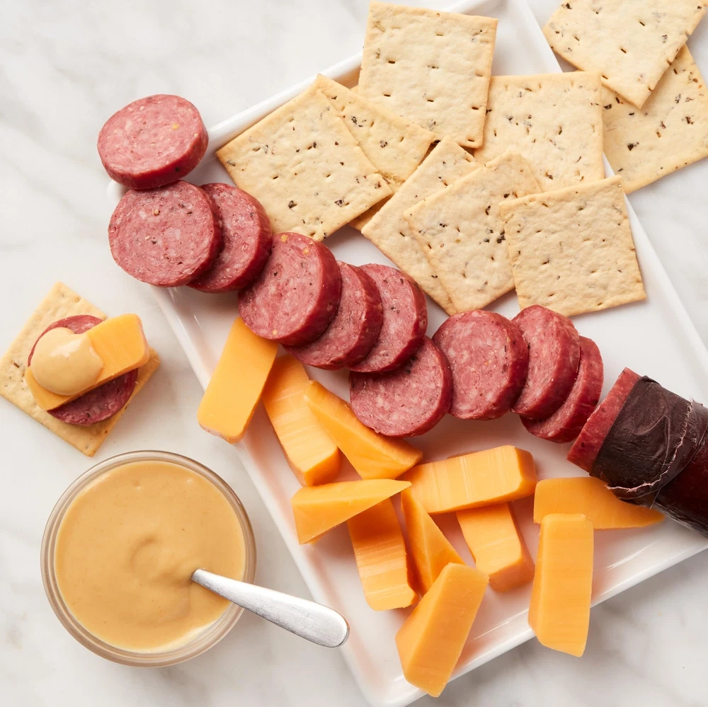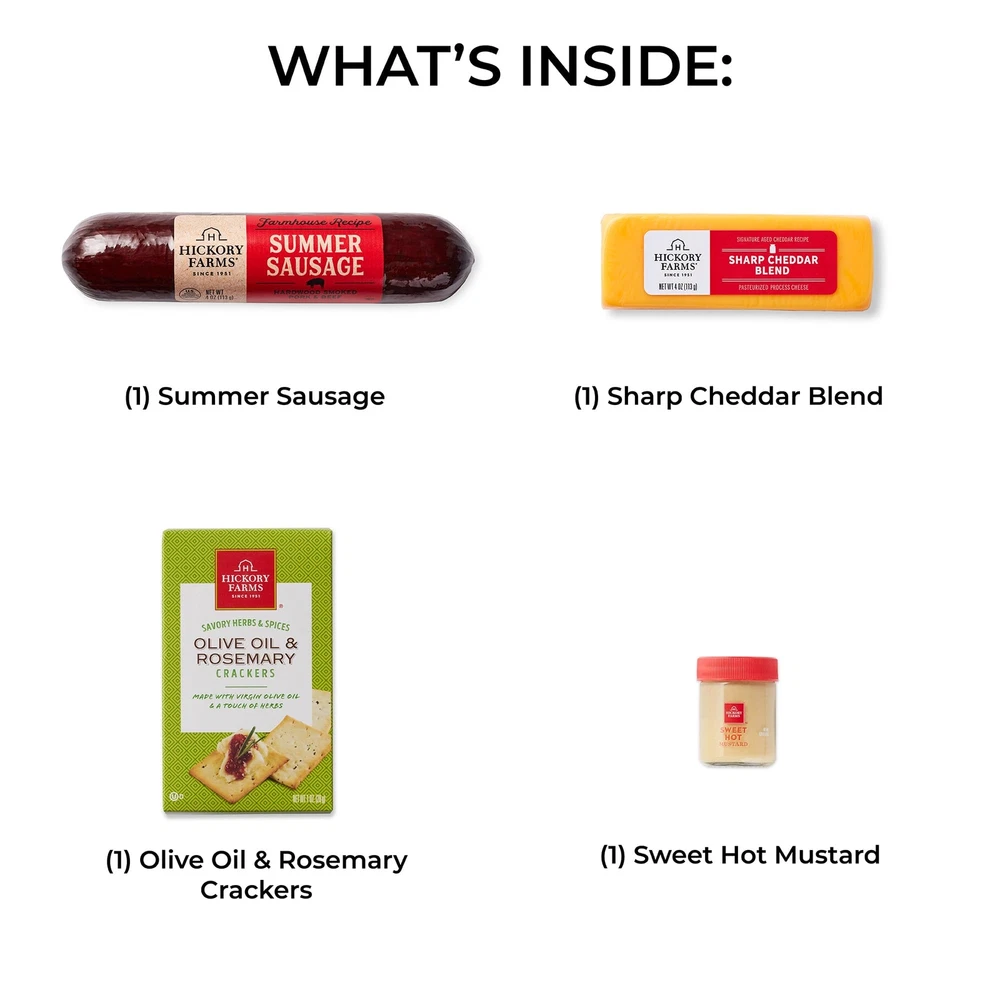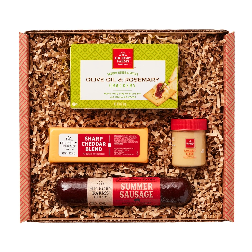 Our favorite savory and delicious flavors all wrapped up in one perfect gift! In this box it will contain our Farmhouse Summer Sausage, Smooth & Sharp Cheddar Blend, and, Olive Oil and Rosemary Crackers. CONTENTS: 4 oz Farmhouse Summer Sausage, 2 oz Smooth & Sharp Cheddar Blend Plank, 1.25 oz Sweet Hot Mustard, 1 oz Olive Oil and Rosemary Crackers GOURMET FOOD: Shelf-stable summer sausage and cheese, perfect for individual snacking CHARCUTERIE: Great for charcuterie platters or as a food gift basket INDIVIDUAL SNACKING: Great for business or corporate gifting, birthdays, care packages, party appetizers, snacking, and more