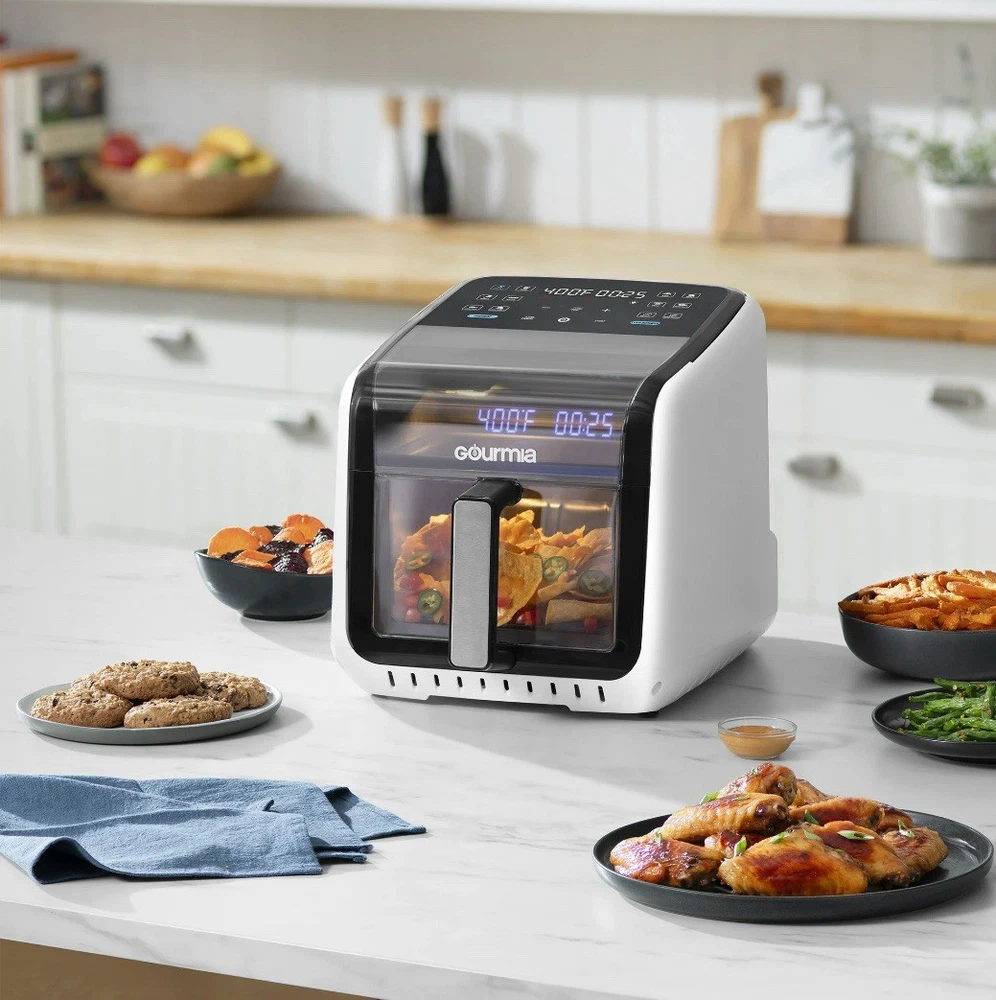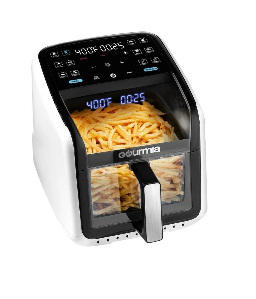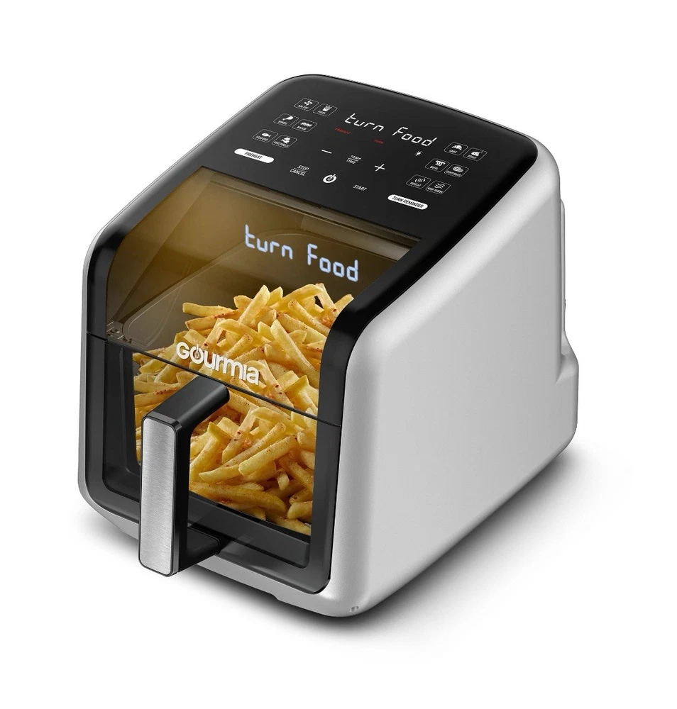 Effortless Cooking with Style: The Green Gourmias Air Fryer features a large 7-quart capacity and 12 one-touch cooking presets for fries, bacon, seafood, and more. Monitor cooking progress through its panoramic viewing window. Cutting-Edge Technology: Includes FryForce 360° Technology for even, oil-free crispy cooking and a 3D holographic display that projects time, temperature, and reminders for a user-friendly experience. Enhanced Usability: Guided cooking prompts ensure flawless operation, and optional preheat/turn reminders make this air fryer ideal for beginners and experienced cooks. Sleek design in an eye-catching green color. Easy to Maintain: Includes a dishwasher-safe nonstick basket and crisper tray, making cleanup fast and hassle-free. Crafted with durable materials to ensure consistent performance over time. Powerful and Versatile: With 1500 watts of power, adjustable temperature from 250°F to 400°F, and compact dimensions of 17.4 x 13.4 x 13.9 inches, this air fryer is a perfect addition to any modern kitchen.
