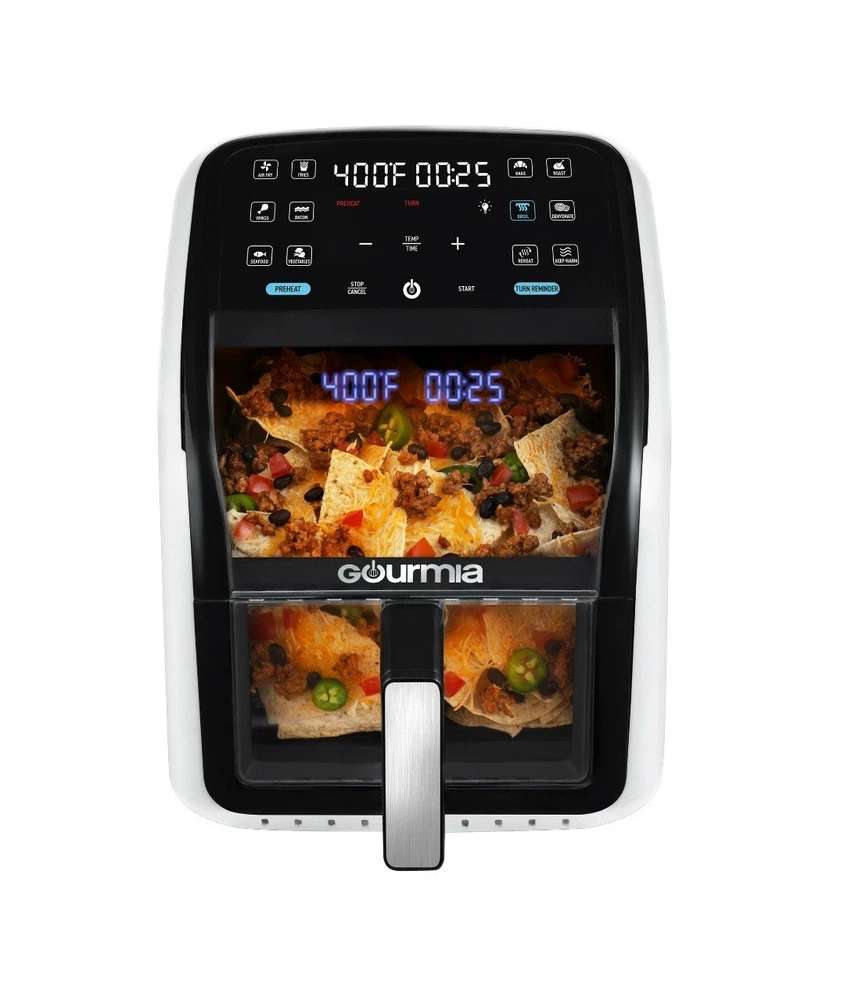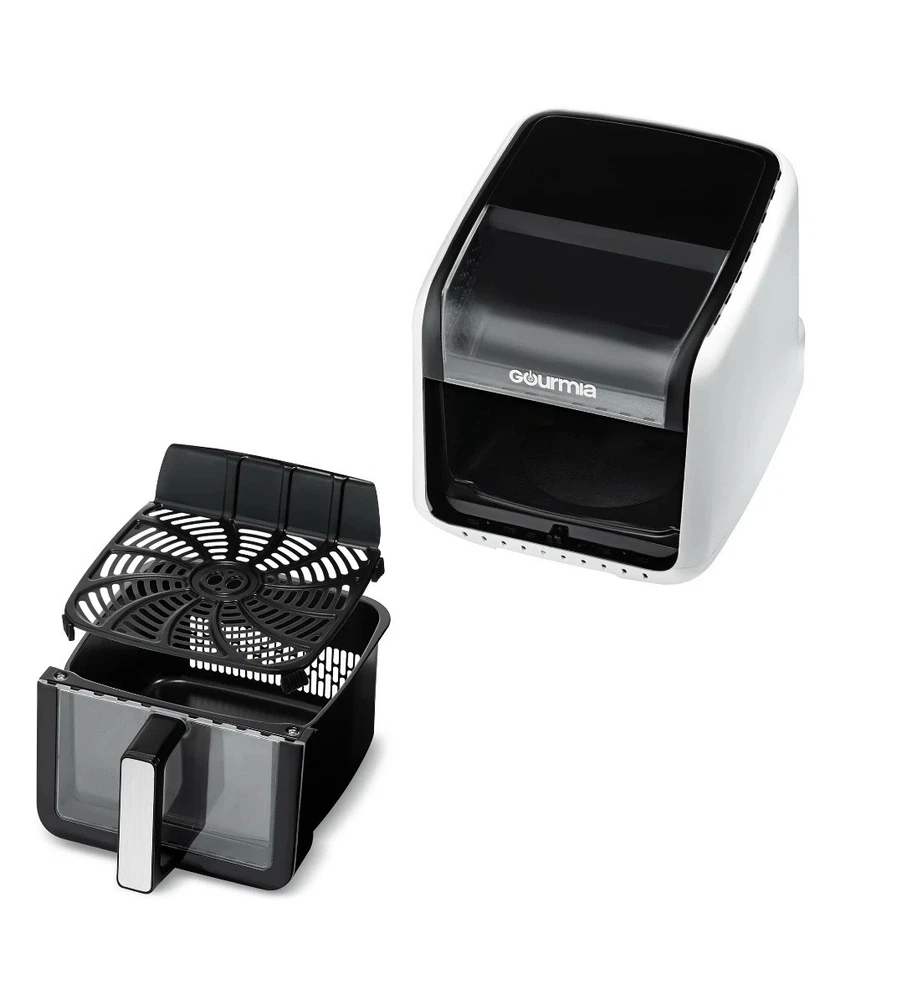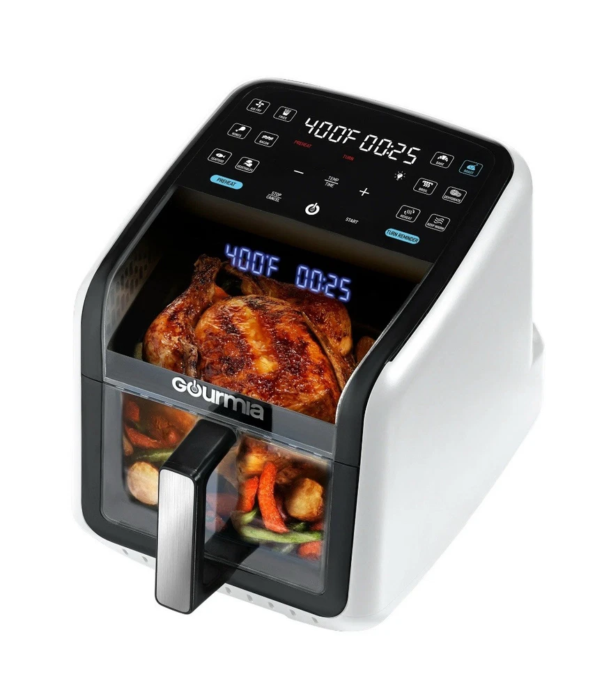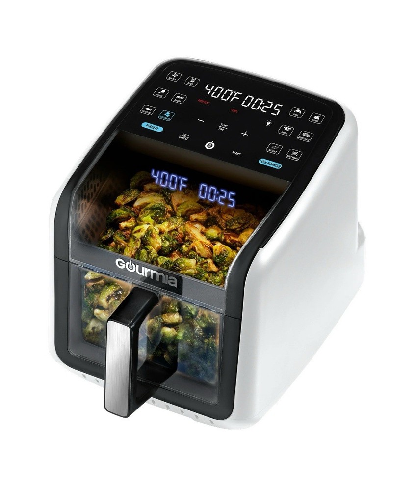 Effortless Cooking with Style: The Green Gourmias Air Fryer features a large 7-quart capacity and 12 one-touch cooking presets for fries, bacon, seafood, and more. Monitor cooking progress through its panoramic viewing window. Cutting-Edge Technology: Includes FryForce 360° Technology for even, oil-free crispy cooking and a 3D holographic display that projects time, temperature, and reminders for a user-friendly experience. Enhanced Usability: Guided cooking prompts ensure flawless operation, and optional preheat/turn reminders make this air fryer ideal for beginners and experienced cooks. Sleek design in an eye-catching green color. Easy to Maintain: Includes a dishwasher-safe nonstick basket and crisper tray, making cleanup fast and hassle-free. Crafted with durable materials to ensure consistent performance over time. Powerful and Versatile: With 1500 watts of power, adjustable temperature from 250°F to 400°F, and compact dimensions of 17.4 x 13.4 x 13.9 inches, this air fryer is a perfect addition to any modern kitchen.
