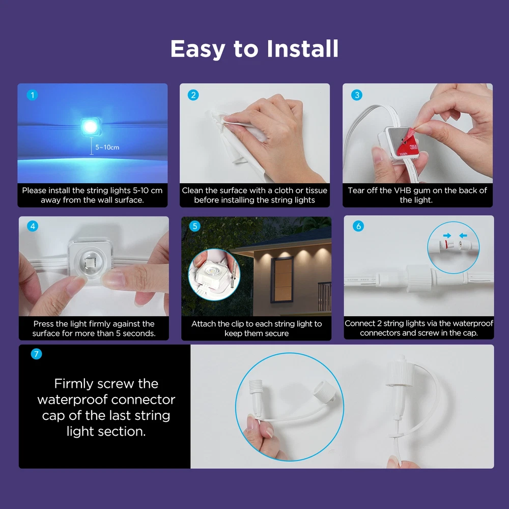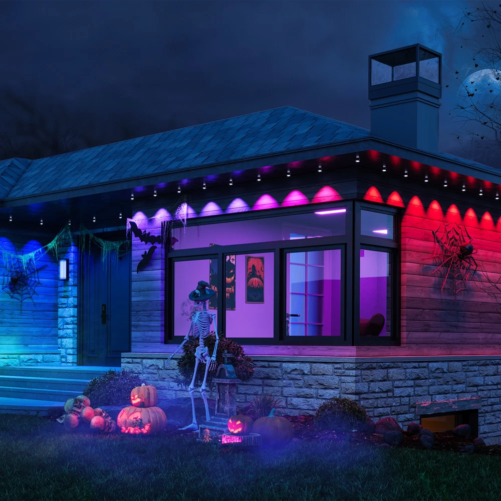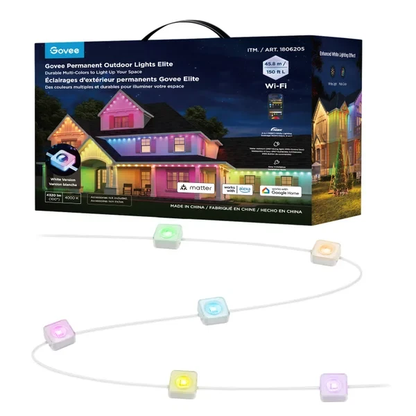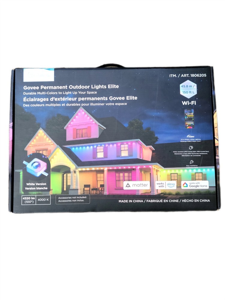 Govee 150ft Permanent Outdoor Lights Elite, Smart Festive RGBIC Lighting Features: Festive RGBIC Lighting Eye-Catching Lighting Effects Outdoor Durability Smart App & Voice Control Simple Installation Item # 1870005 Item Description Govee Permanent Outdoor Lights Elite Short Features Festive RGBIC Lighting; Eye-Catching Lighting Effects;Outdoor Durability; Smart App & Voice Control; Simple Installation Introduction Paragraph Adorn your home with a set of decorative permanent outdoor lights designed for any occasion. Install on the eaves, fences, or corridors to create visually appealing home decor. Features ✓Festive RGBIC Lighting Effects: Inspired by nature and holidays. ✓Outdoor Durability: The string lights are IP67 water resistant with an IP65 control box. Made from anti-UV material. ✓Eye-Catching Lighting Effects: Reveal a unique triangular lighting effect. ✓Simple Installation: Use the provided VHB glue and clips to install each light in 8 seconds. ✓Multiple Controls: Control via Govee Home App or voice assistants. ✓Matter-Enabled: Matter allows compatibility with major smart home ecosystems, providing more ways for users to customize and future proof their smart homes. Includes ★ 5.1m/16.7ft Lights String x9 ★ 3.6m/11.8ft Extension Cable x2 ★ 1.2m/3.9ft Extension Cable x2 ★ Clips x114 ★ Control Box x1 ★ Power Adapter x1 ★ VHB Tape x27 ★ Cable Clamp x3 Specifications Dimensions (L × W × H/D): 39.7cm × 15.3cm × 28.4cm ( 15.63 in. × 6.02 in. × 11.18 in.) Weight: 4.85 kg (10.7 lb.) Warranty 1 year limited