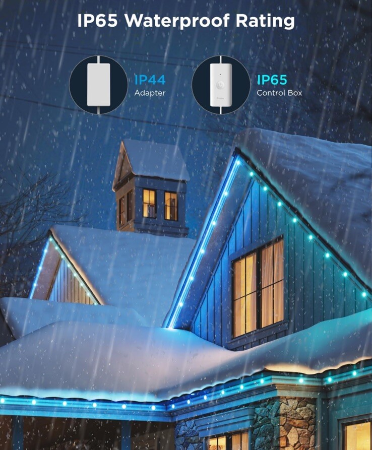 Festive RGBIC Lighting: Brighten your holidays with Govee Outdoor Dots String Lights. These Christmas lights outdoor offer 16 million colors and visualized lighting effects, transforming your garage, window, and eaves into a vibrant holiday decor. Bright and Adjustable Glow: Each LED Christmas lights emits a 4000K white light at 30lm, with adjustable warm cold color temperature and brightness settings. These outdoor Christmas lights are suitable for festive gatherings and house decor. Outdoor Durability: Even in -4℉ to 104℉ cold environments, these IP65 waterproof outdoor lights can function normally. Ideal for winter, lasting up to 25,000 hours, keeping your house and garage beautiful. Control box is IP65, adapter is IP44. Diverse Lighting Modes: Choose from 65 scene modes and 6 music modes to suit any festive occasion. With DIY and AI options through the Govee Home App, your govee outdoor lights can transfer effortlessly from Halloween lights to Christmas decorations. Smart App Control: Manage your Led lights easily with WiFi/Bluetooth and Govee Home App. Compatible with Alexa, Matter and Google Home. Adjust your lighting with a tap or voice command, adding a touch of magic to your Christmas decorations. Simple Installation: Install with ease using adhesive backing or screws. You can cut and reconnect the outdoor string lights to design your own unique layout. Notes: It is recommended to use screws when installing on a wooden surface.