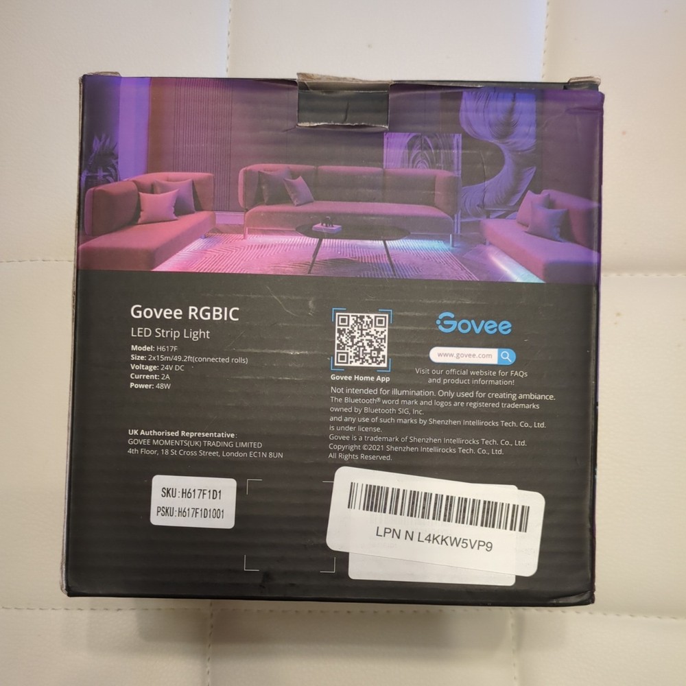 Govee RGBIC Basic LED Strip Lights H617F offer a versatile and vibrant way to illuminate your space. With a length of 49.2 feet, these multicolor strip lights are designed to create stunning ambience in various settings, from parties and holidays to casual gatherings. The button light shape ensures a continuous and even glow, perfect for enhancing the mood of any indoor area. The lights are equipped with an app control that provides an array of settings to suit your mood or event, making them suitable for occasions such as baby showers, birthdays, and more. Energy-efficient with an A+++ to G rating and an LED lighting technology, these strips are not only vibrant but also eco-friendly. The white cord blends seamlessly, ensuring a clean and sophisticated look.