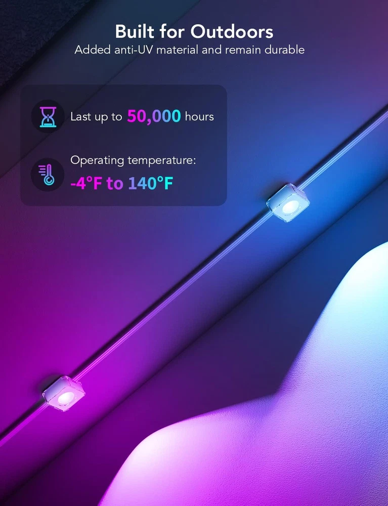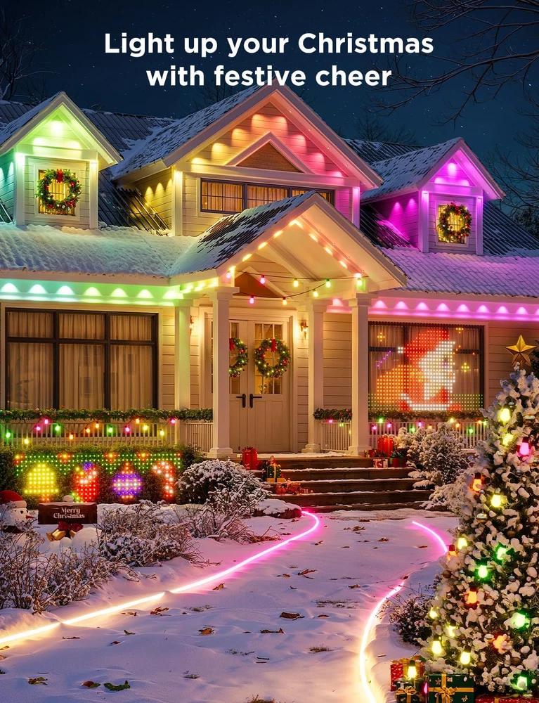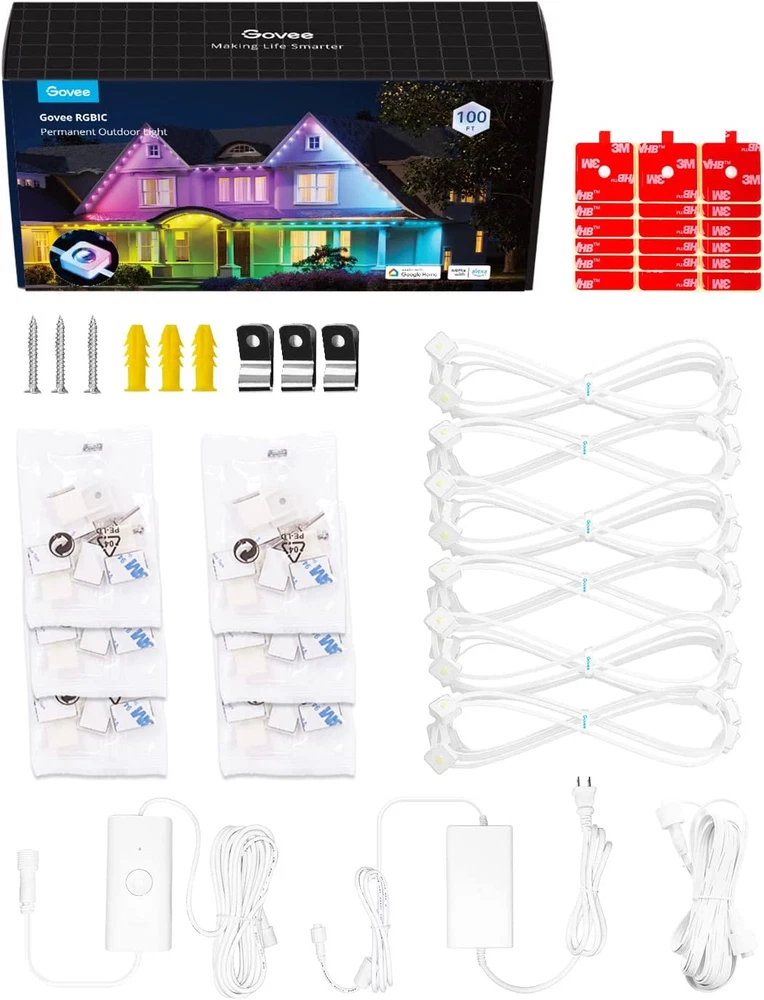 Store New Arrivals Add to Favorite View Feedback Contact Govee Permanent Outdoor Lights, Smart RGBIC Outdoor Lights with 75 Scene Modes, 100Ft with 72 LED Christmas Lights, IP67 Waterproof for Christmas Decorations, Work with Alexa, Google Assistant, White Description Item model number H705A Light Source Type LED Style Modern Number of Items 1 Power Source Corded Electric Brand Govee Number of Light Sources 72 Country of Origin China Switch Style Push Button Light Direction Adjustable Theme Music Batteries Included? No Maximum Compatible Wattage 72 Watts Assembled Height 5.51 inches Connectivity Protocol Bluetooth, Wi-Fi Average Life 50000 Hours Product Dimensions 5.7 x 8.46 x 5.51 inches Material Plastic Assembled Width 8.46 inches Included Components VHB glue and clips Item dimensions L x W x H 5.7 x 8.46 x 5.51 inches Bulb Features Dimmable White Brightness 26 Lumens Indoor/Outdoor Usage Outdoor Control Method Voice Light Color Multicolor Water Resistance Level Waterproof Batteries Required? No Item Weight 5.51 pounds Specific Uses Garden Occasion Various holidays and parties Special Features Color Changing, Waterproof Special Feature Color Changing, Waterproof Part Number H705A1D1 Switch Installation Type Wall Mount Shade Color Multicolor Color White Wattage 72 watts Voltage 110 Volts (AC) Plug Format A- US style Assembled Length 5.7 inches Manufacturer Govee Luminous Flux 26 Lumen Size 100ft Festive RGBIC Lighting: Choose from 75 scene modes to light up Christmas with the govee permanent outdoor lights. This Christmas lights are featured DIY lighting for every occasion. It can only connect up to 9 light segments and 1 extension cables. Eye-Catching Lighting Effects: The lens design reveals a unique triangular lighting effect. The wall washing depth is greater than 16 inches, while the brightness of each light is 26 lumens. Install the lights 2-4 inches away from the wall surface. Outdoor Durability: Added anti-UV material, the Christmas outdoor lights are IP67 waterproof with IP65 Rated Control Box and Adapter. The Christmas decor can use for up to 50,000 hours and work in bad weather from -4°F to 140°F (-20°C-60°C). Simple Installation: Must use provided VHB glue and clips to install each light in 8 seconds. Splice through waterproof joints every 16.4ft and install the Christmas lights on eaves. Please note that the govee permanent outdoor lights cannot be cut. Smart App & Voice Control: Use Govee Home App to control colors of each govee outdoor light independently and set timer function to light up Christmas parties. Pair the Christmas decorations with Alexa and Google Assistant for smart voice control. Product Description Govee Outdoor Lights Set Includes 100ft Permanent Outdoor Lights, 4.9×6.6ft Curtain Lights, 96ft Outdoor String Lights for Christmas Decorations Govee Outdoor Wall Light 2 Pack 1500LM Smart RGBIC Porch Lights with 45 Scene Modes, IP65 Waterproof for Christmas Decor, DIY Lighting Effects, Works with Alexa, Google Assistant and Matter Govee Outdoor Projector Light Laser and Aurora Light Projector for Christmas Decorations, 16 Patterns in RGB, RGBW Aurora, 51 Festive and Daily Scene Modes, Works with Alexa, Google Assistant, Matter Govee Outdoor LED Strip Lights 98.4ft Smart Outdoor Lights Work with Alexa and Google Assistant, IP65 Waterproof, RGBIC Outdoor Lights for Christmas Decorations 1 Christmas Decorations 2 Christmas Lights Show 3 Christmas Decor The video showcases the product in use. The video guides you through product setup. The video compares multiple products. The video shows the product being unpacked. Govee Outdoor Lights Add to Cart Add to Cart Add to Cart Add to Cart Add to Cart Add to Cart Add to Cart Customer Reviews 4.5 out of 5 stars 3,906 4.5 out of 5 stars 3,906 4.5 out of 5 stars 3,906 4.2 out of 5 stars 486 4.5 out of 5 stars 12 4.2 out of 5 stars 486 5.0 out of 5 stars 4 Price $279.99 $ 279 . 99 $419.99 $ 419 . 99 $159.99 $ 159 . 99 $399.99 $ 399 . 99 $299.99 $ 299 . 99 $699.99 $ 699 . 99 $449.99 $ 449 . 99 Item color White White White White White White White+Black Length 100ft 150ft 50ft 100ft 100ft 200ft 100ft+96ft+4.9*6.6ft Light color RGBIC RGBIC RGBIC RGBIC+Warm/Cold White RGBIC RGBIC+Warm/Cold White RGBIC Number of lights 72 108 36 60 90 120 72+30+520 IP rating IP 67 IP 67 IP 67 IP 67 IP 65 IP 67 IP 65 Lumen 26 lm / per light 26 lm / per light 26 lm / per light 50 lm / per light 30 lm / per light 50 lm / per light \ Scene Mode 75 75 75 75 65 75 75 Music Mode 6 6 6 6 6 6 6 Matter ✘ ✘ ✘ ✔ ✔ ✔ ✘ Cuttable ✘ ✘ ✘ ✔ ✔ ✔ ✘ ABOUT US We offer the best prices around on high quality products. Our E-store includes media such as books, movies, music and games while offering electronics, toys, sporting apparel, clothing, tools, general home, garden items and more. SHIPPING We are always working hard to ensure your package arrives as soon as possible. Please understand that some factors like weather, high postal traffic, and the performance of shipping companies are outside of our control. We offer free shipping to the lower 48 states and ship within 5 business days of payment, usually sooner. We do not accept P.O. Boxes. Please provide a physical address. For shipping outside of the continental USA, we only use eBay's Global Shipping Program.The item is shipped to KY and then sent to the rest of the world. International customers are responsible for all duties and taxes. Continue to check out in order to calculate costs for shipping the item to your country. Messages regarding eBay's Global Shipping Program MUST be directed at eBay EXCLUSIVELY. RETURNS We offer a 30-Day Return Policy on items which you are not completely satisfied with. You have the option for a full-refund or an exchange of the item. No returns are available on items shipped outside of the USA. PAYMENT We accept PayPal. CONTACT US This page content is yet to come Please ad us to your favorite seller and visit again later Thank You CUSTOMER SATISFA