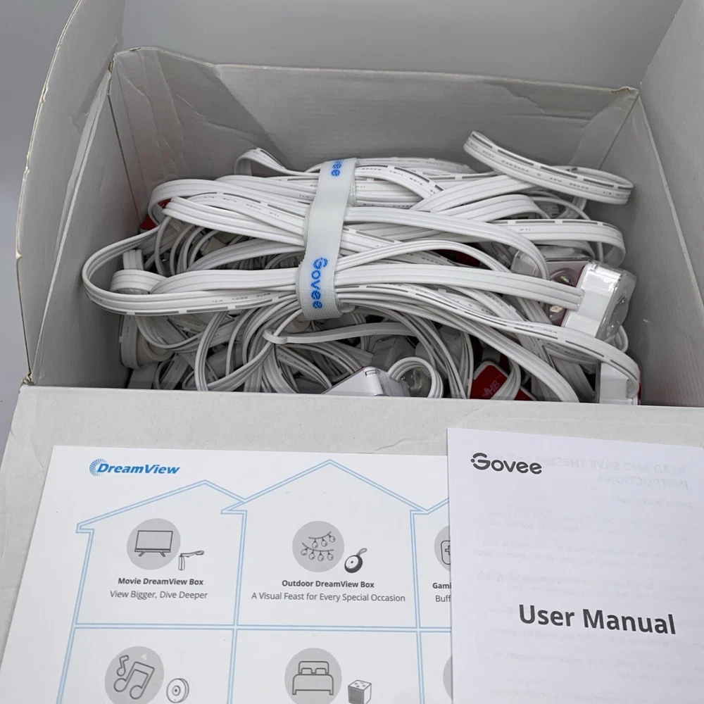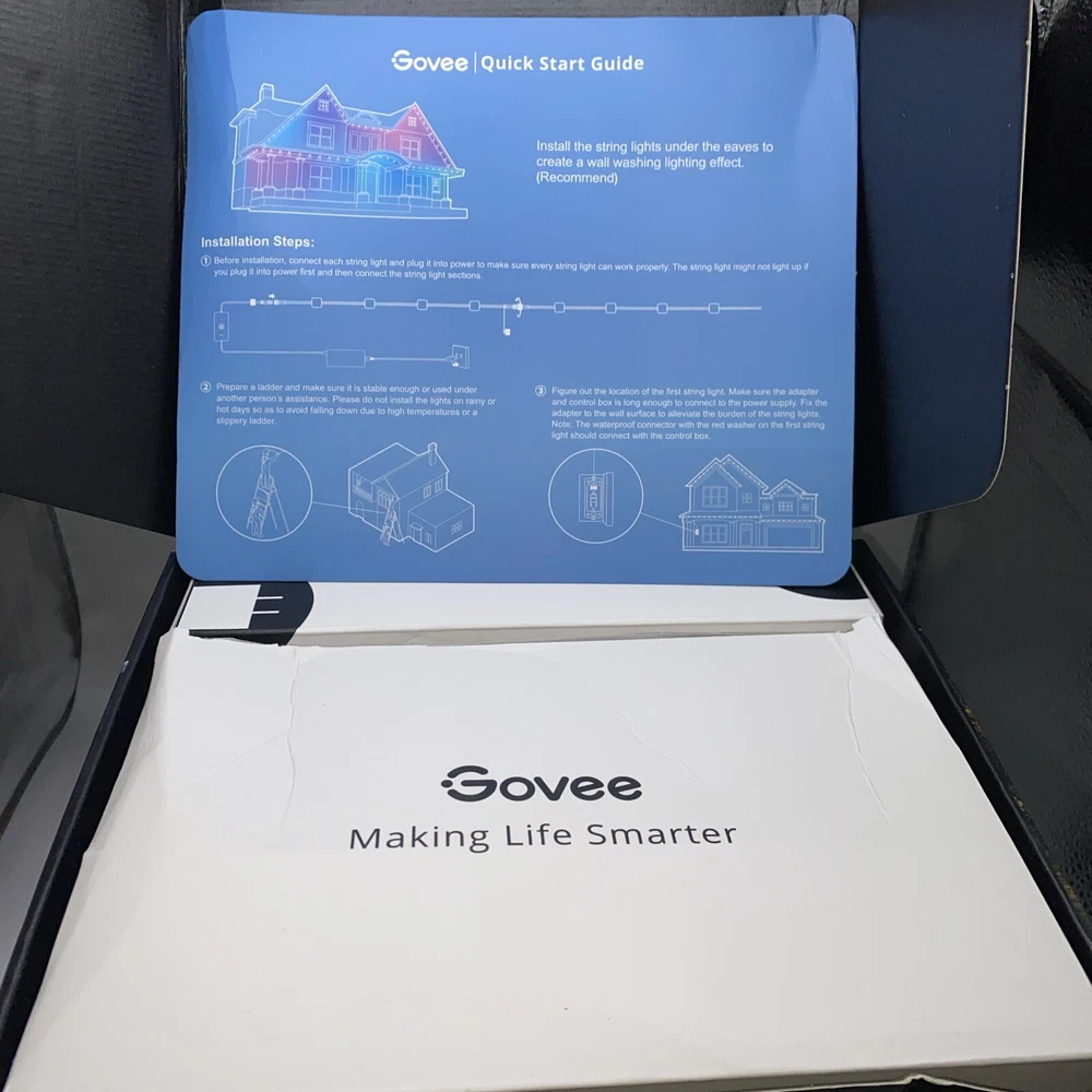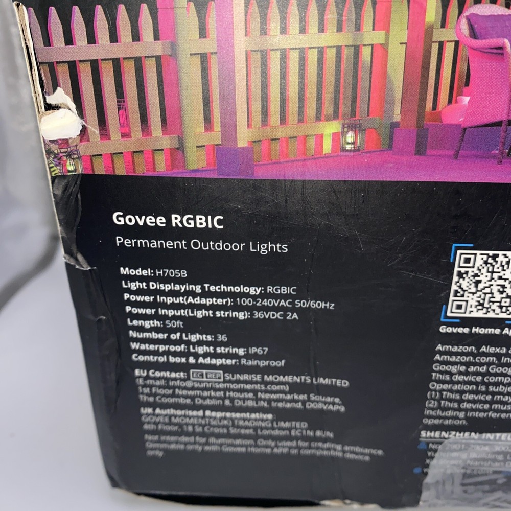Cord Color: White Sensor Type: Light Power Source: Corded Light Shape: Square Type: Outdoor Permanent lights Brand: Govee Features: Color Changing, Dimmable, Waterproof IP Rating: IP67 Light Color: multi Occasion: Christmas, Halloween, Party Lighting Technology: LED Color: White Number of Settings: 75+ Installation Area: Outdoor Model: RGBIC