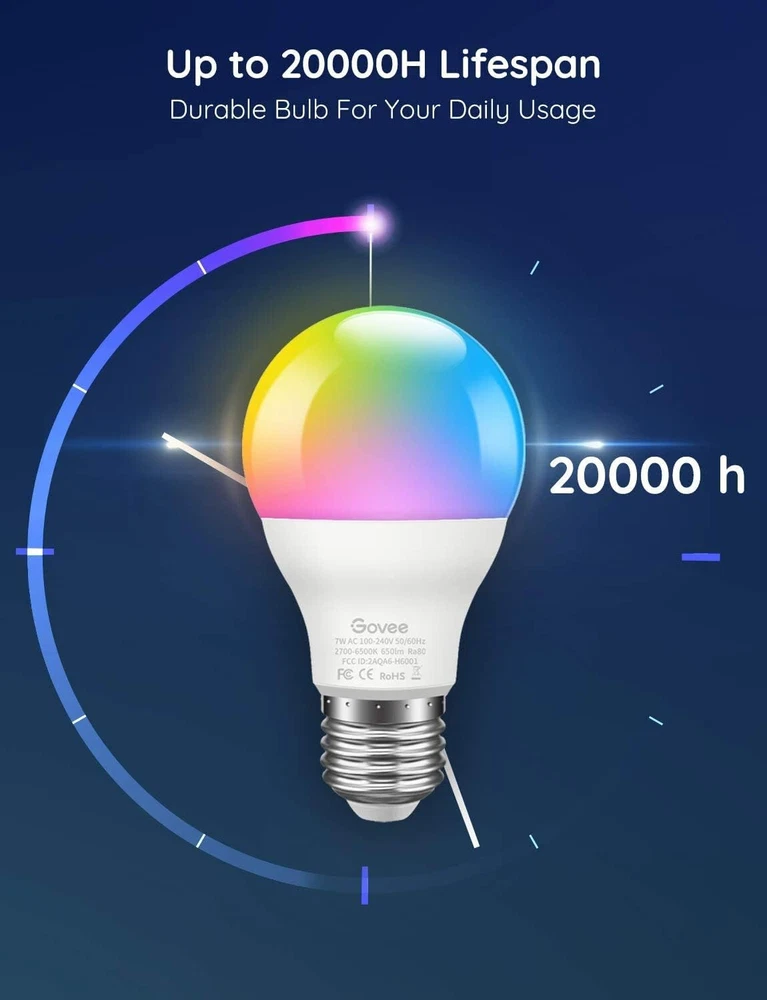 About this item: · Pick Colors from Camera: Take a picture or keep camera focusing to choose a color applying to your bluetooth light bulb. CRI ≥ 90 to restore the true color of the surrounding environment. · Sync Your Music: Personalize your Govee multicolor bulbs with more than 16 million colors and a monochrome palette. Our smart bulb lights can change colors according to rhythm of music. Dynamic or soft rhythm, depending on your preferences. · Connect via Bluetooth & App Control: Via Bluetooth connect the LED Light Bulb with the "Govee Home" App. Group control can control up to multi rgb light bulbs at the same time · Timer & Wake-up Modes: Set your color changing LED bulbs to turn on/off at a specific time. Especially use the “Sunrise” mode to make the color lights bulb brighten to help you wake up, use the “Sunset” mode lets the bulbs darken to help you sleep. · Energy Saving: The brightness of this 7W LED bulb is equivalent to a 60 watt incandescent, saving you 90% on lighting costs. Shipping: We offer FREE shipping on all orders! We ship within Three business days of payment, usually sooner. We use a selection of shipping services such as UPS, FedEx, USPS etc. We only ship to the lower 48 states, no APO/FPO addresses or PO Boxes allowed. Local pickups and combined shipping options are not provided at this time. Feedback: Customer satisfaction is very important to us. If you have any problem with your order, please contact us and we will do our best to make you satisfied. Contact Us : If you have any queries, please contact us via eBay. We usually respond within 24 hours on weekdays. Thank you for shopping at our store. We would be happy to see you again.