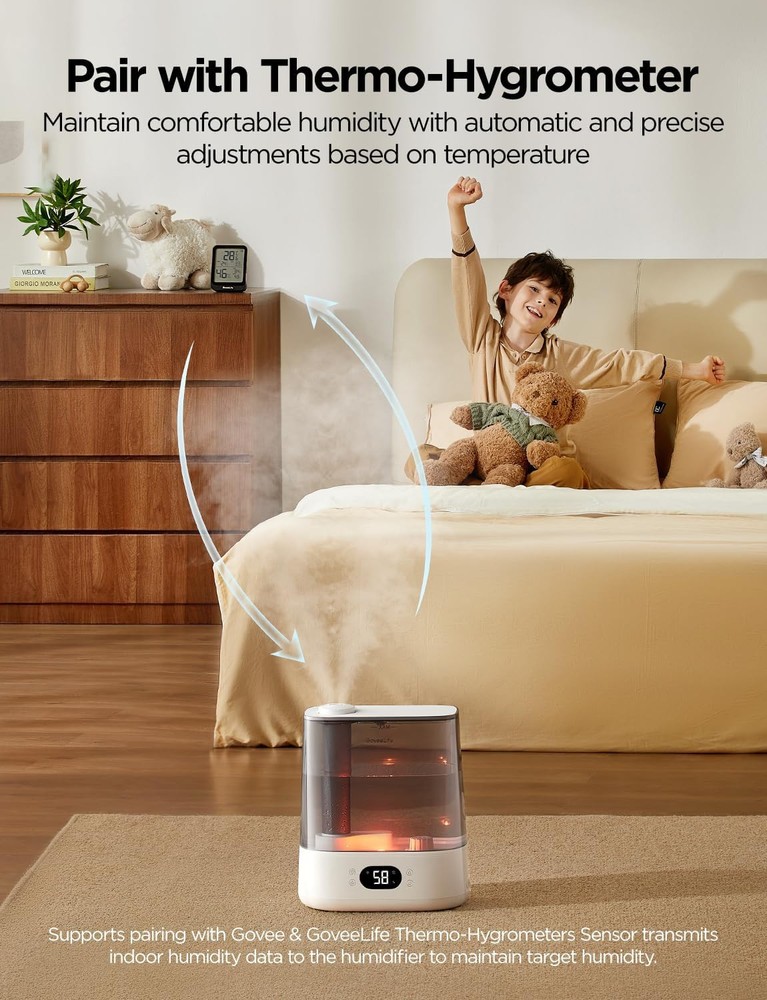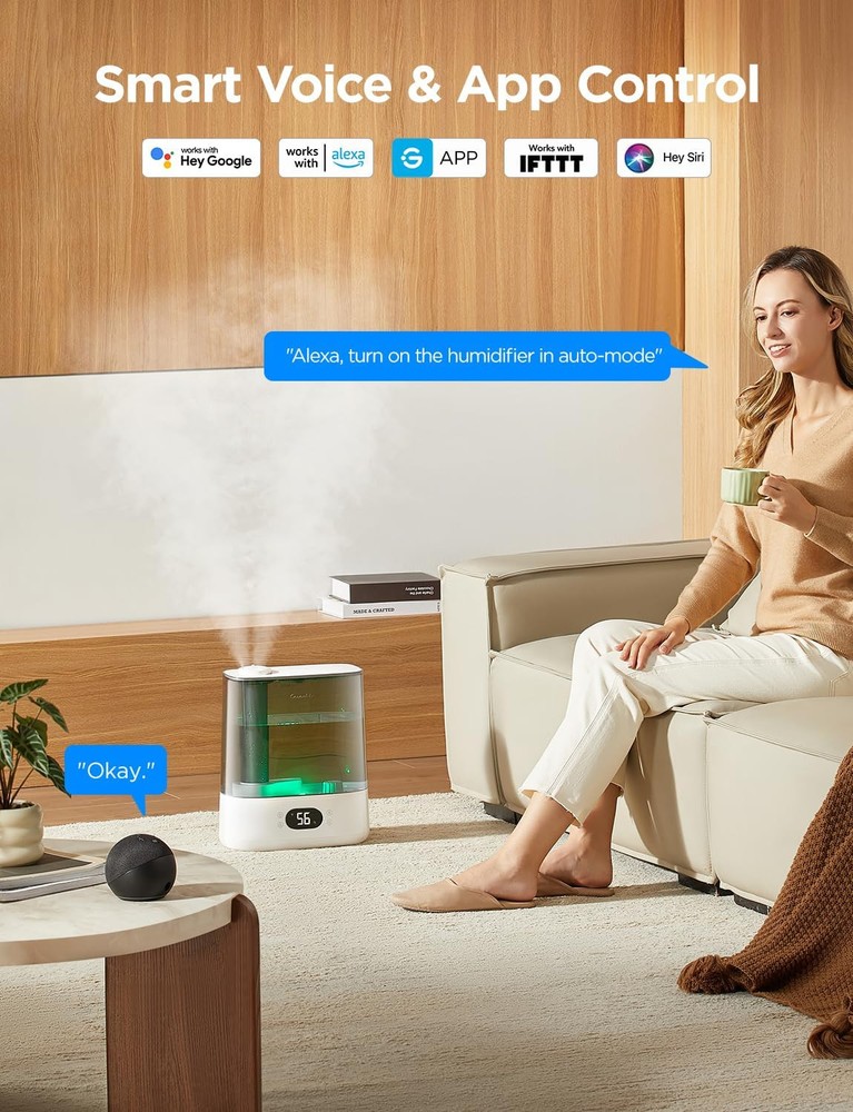 This humidifier is a game-changer! Love the smart app and voice control—super easy to adjust settings from bed. The auto mode keeps humidity just right, and the LED display is a nice touch. Super quiet and the 6L tank lasts forever. Perfect for dry nights!