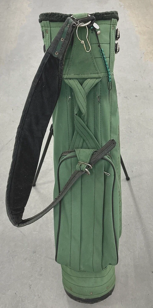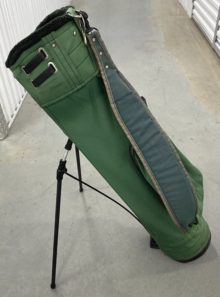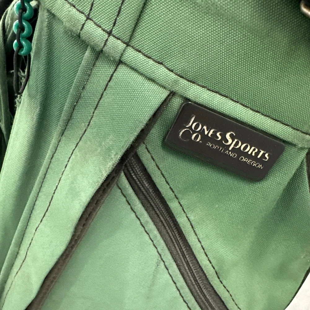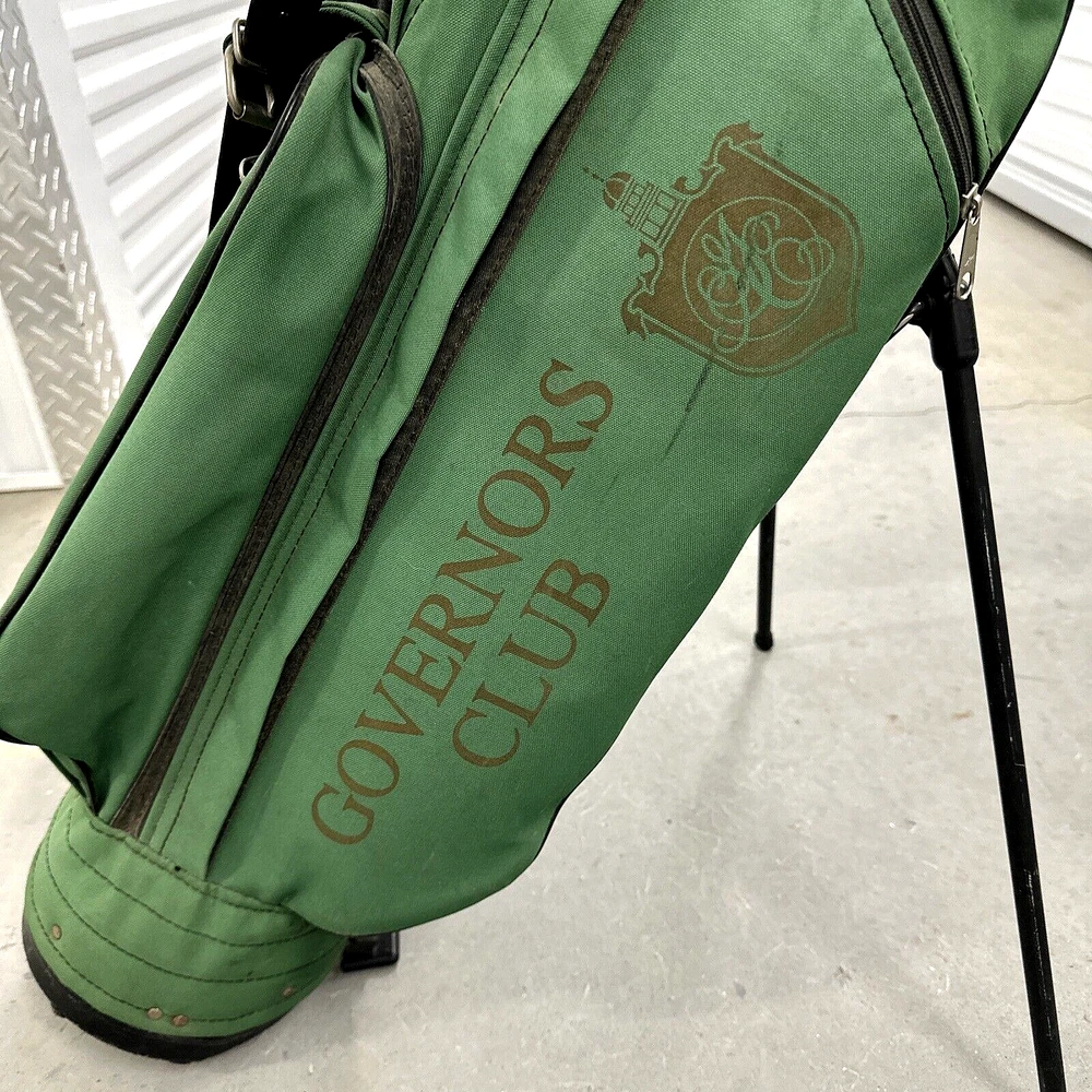 Lightweight stand bag is made by Jones Sports in the USA and is screen printed with the logo of the Governors Club in Chapel Hill, NC. It has a 3 way divider and 4 zippered pockets. Please see photos for description and condition. Note the scuff wear in the picture. Ships USPS or UPS.