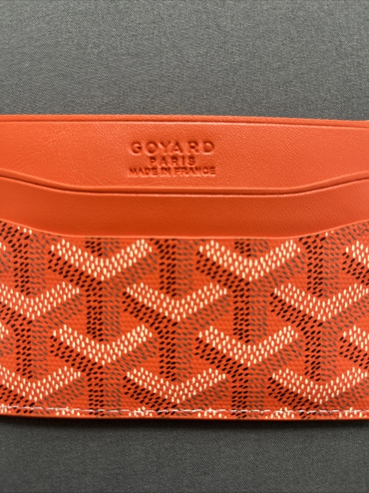 Goyard Orange Leather Card Holder Authentic Goyard card wallet in a rare orange color. Made in France from high-quality leather with the signature Goyard print. Slim, stylish, and easy to carry – perfect for holding cards and essentials. Gently used but in great condition. Don’t miss out on this statement piece.