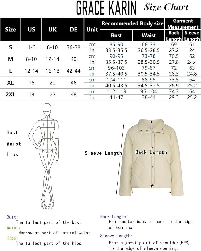 Sleeve Length: Long Sleeve Jacket/Coat Length: Mid-Length Lining Material: Polyamide Season: Winter Department: Women Outer Shell Material: 95% Polyamide, 5% Elastane Colour: Black Brand: Grace Karin Closure: Snap Size: XL Size Type: Regular Type: Coat Accents: Button Style: Winter Coat