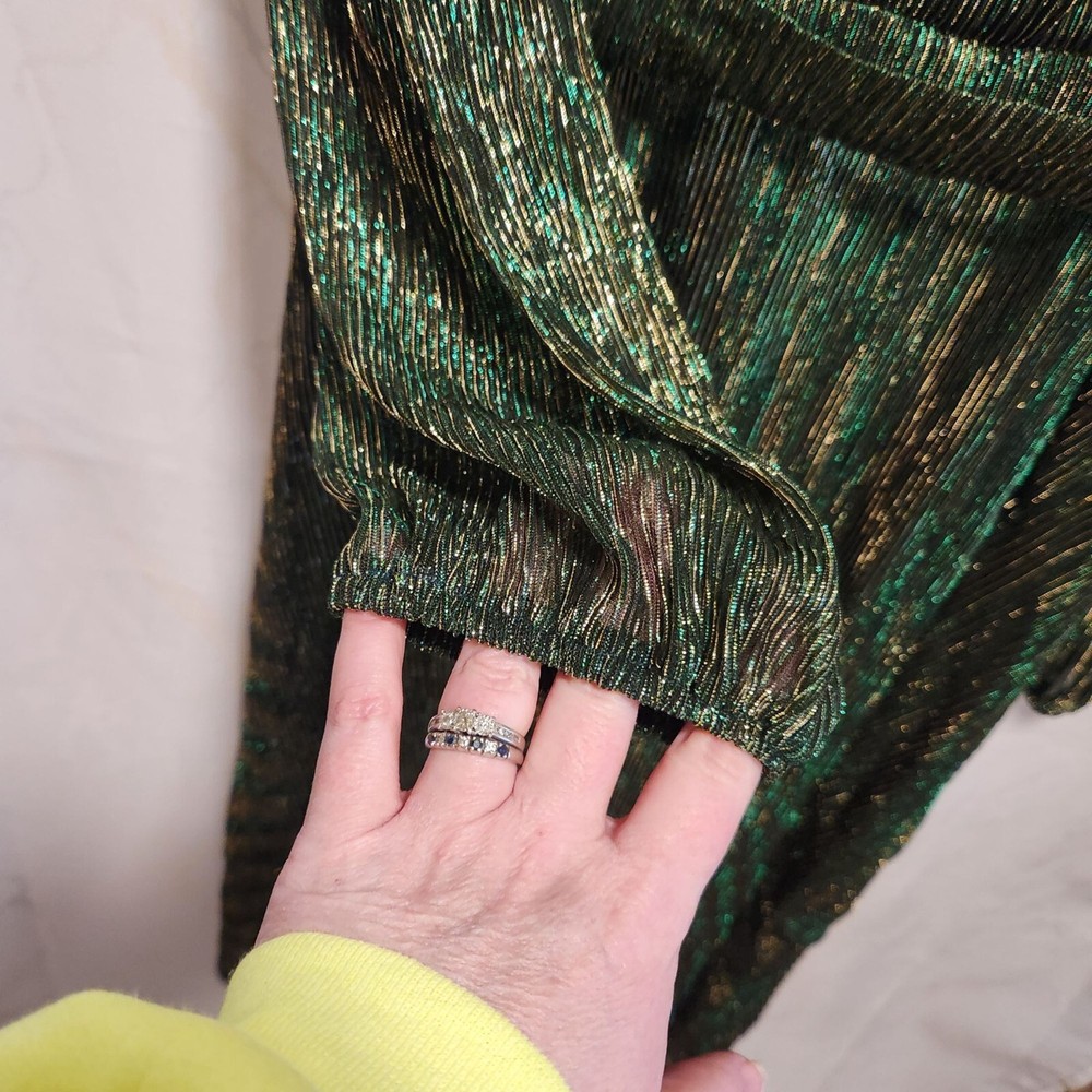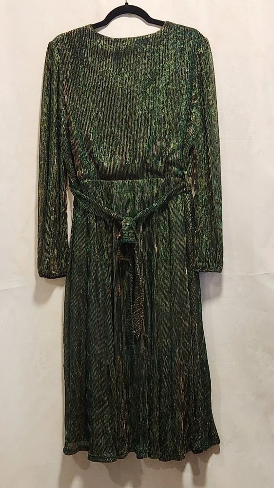 NWT Women's size XL, Grace Karin maxi fashion dress. Green with gold stripe foil, a crossed V-neckline with snap for closure, and long sheer sleeves. The dress is lined with an green lining and has a matching belt. Polyester and viscose, made in China, machine washable. Measurements are approximate: Pit to pit - 21" Shoulder to shoulder - 16" Sleeve length - 25.5" Overall length - 45" Washed per label instructions, stored in a smoke-free and pet friendly environment. Thanks for looking! All orders ship within two business days, reasonable offers accepted.