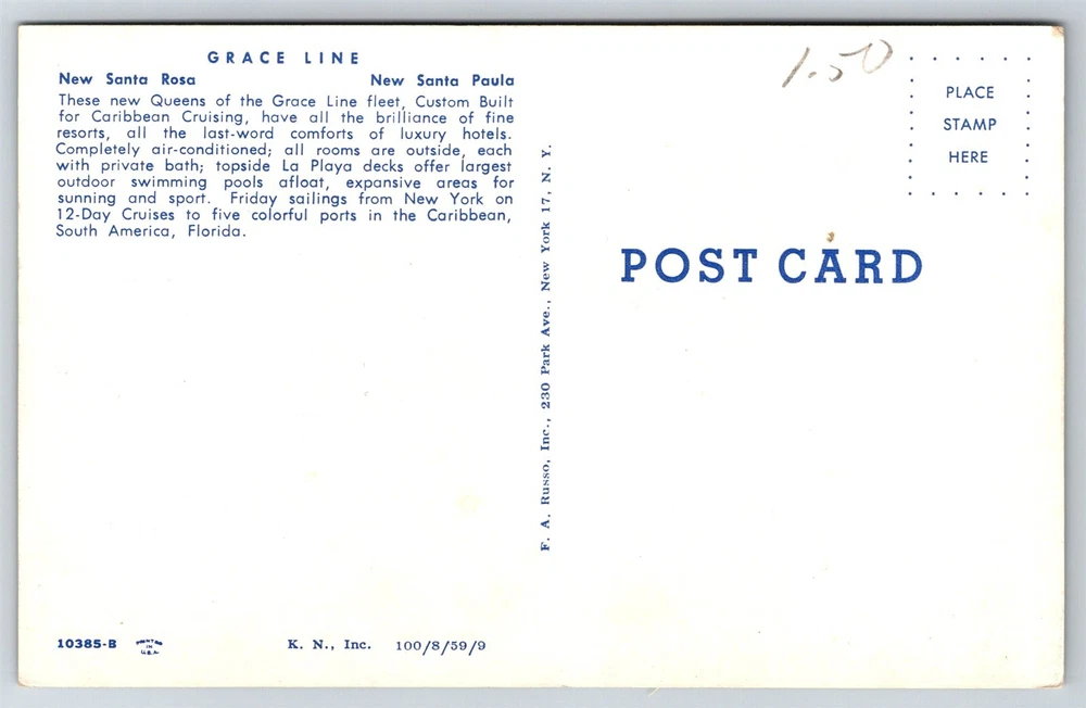 Grace Line Santa Rosa Santa Paula New Ships New York Cruises C1939 Postcard G6 Thank you for visiting! This is a standard size postcard, 3.5" X 5.5". In stock, usually ships within 24 hours of your purchase. Please ask questions if you are unsure about anything. Our goal is for your complete satisfaction with the postcard and your experience. Check all my other listings in my store. RETIREDWITHBOOKS Powered by SixBit's eCommerce Solution