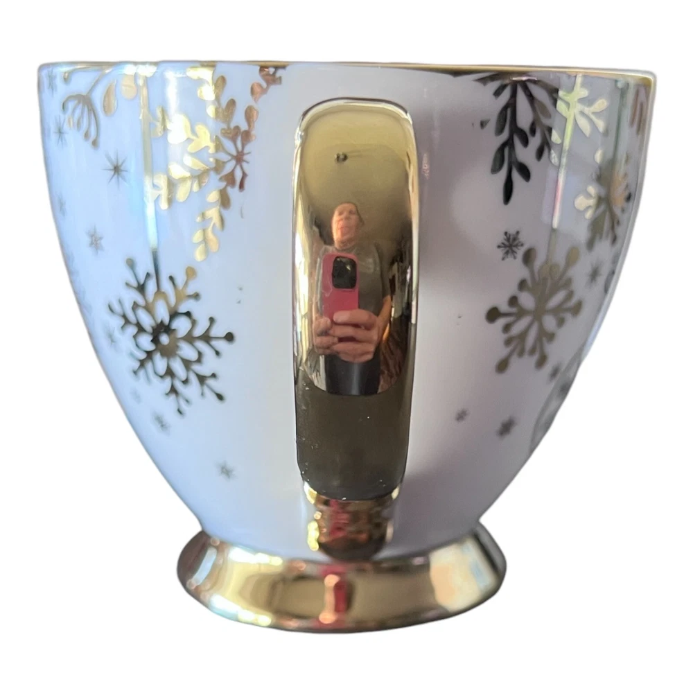Add some festive cheer to your tea time with this beautiful Grace Teaware holiday ornament tea cup. The cup features a stunning ornament pattern that's perfect for any occasion, whether it's a bridal shower, engagement, Christmas, winter, New Year's, anniversary, or just a regular Sunday afternoon tea. With a generous capacity of 12 fl oz, this ceramic mug is perfect for your daily tea fix or as a gift for your loved ones. This cup has a manufacturing flaw and is missing a spot of gold paint on the bottom rim see pic