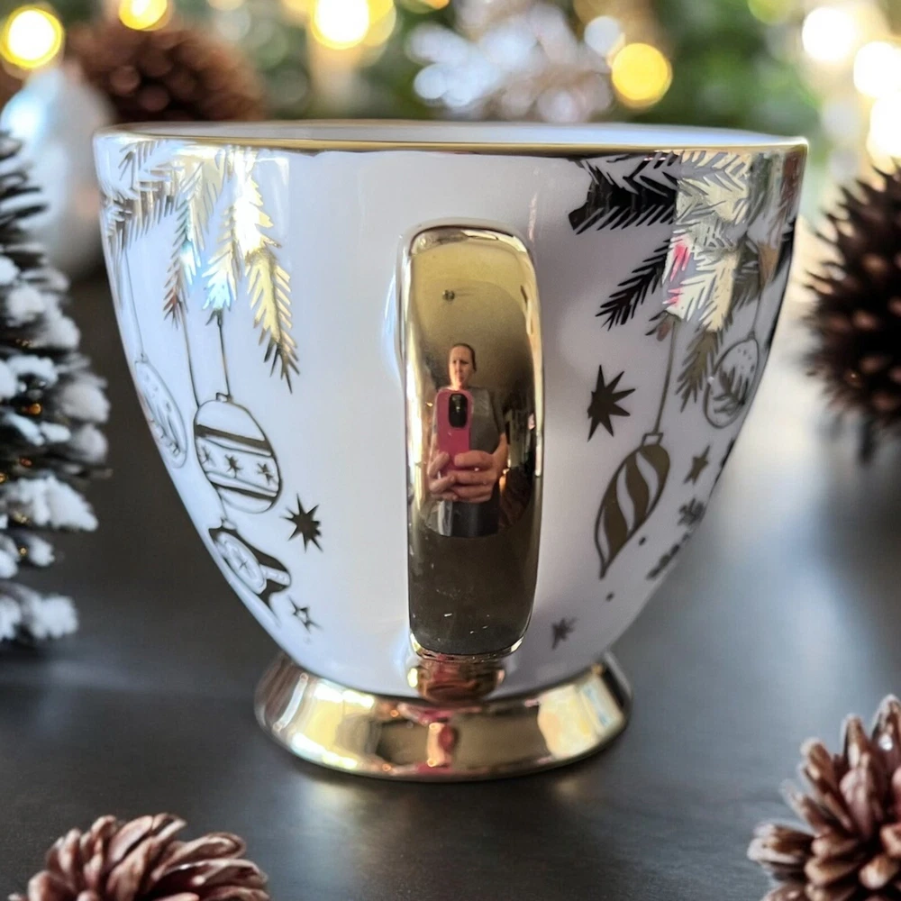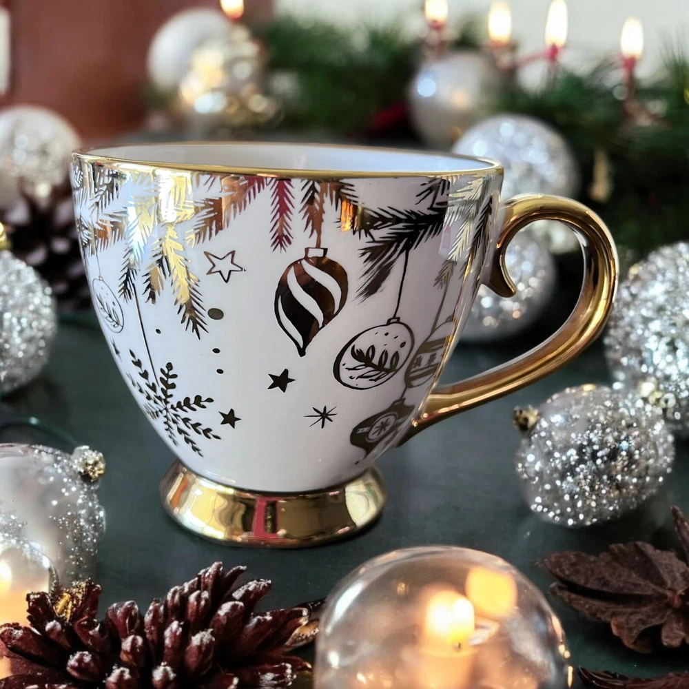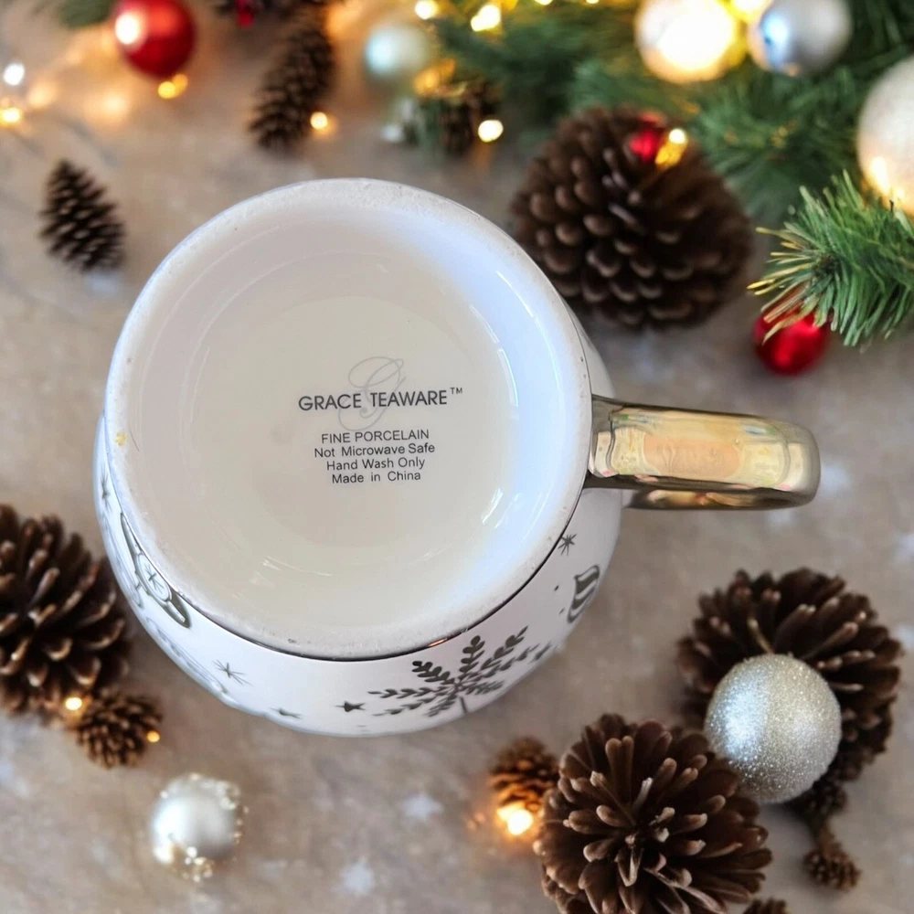 Color: White Features: Dishwasher Safe, Microwave Safe Set Includes: Coffee Cup, Coffee Mug, Mug, Tea Cup Material: Ceramic Type: Coffee Mug Occasion: All Occasions, Christmas, Winter, Anniversary, Bridal Shower, Engagement, New Year's Capacity: 12 fl oz Brand: Grace Theme: Beauty, Holiday/Christmas Pattern: Ornaments