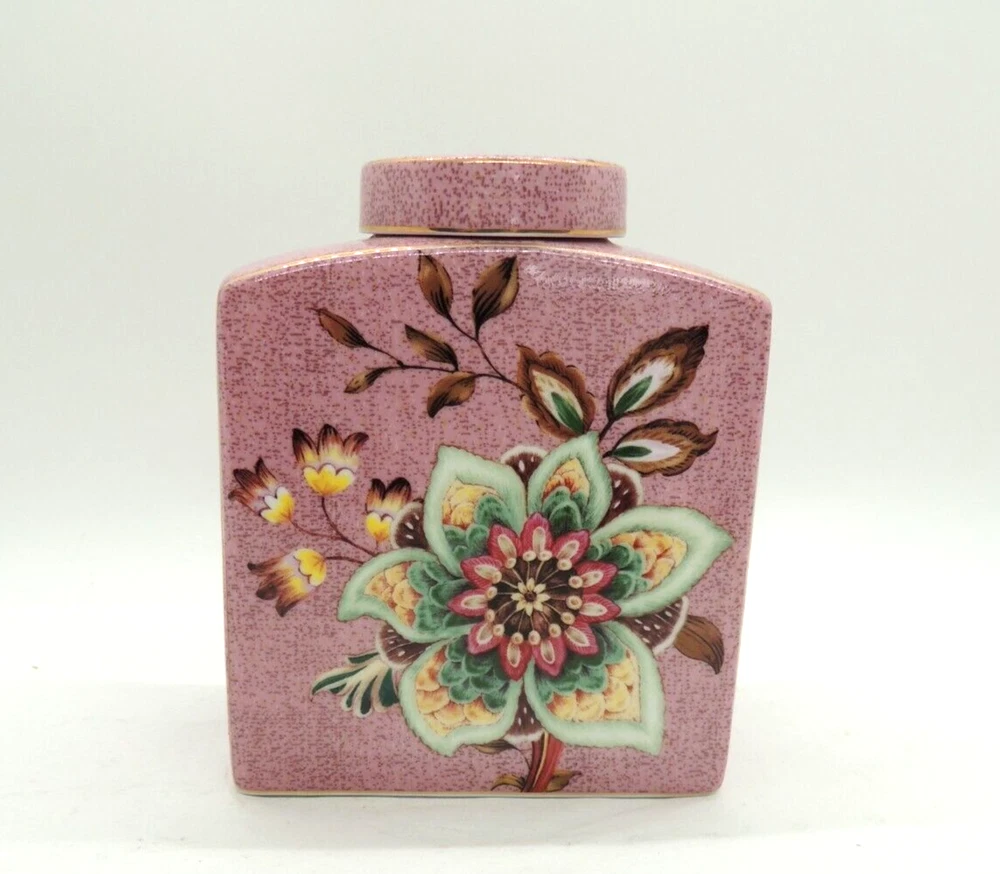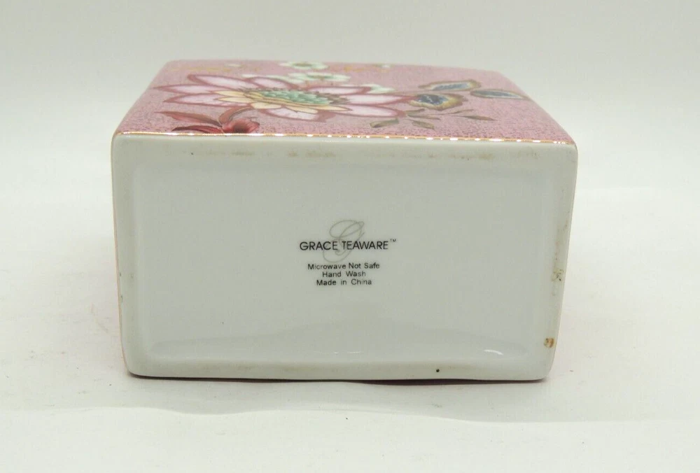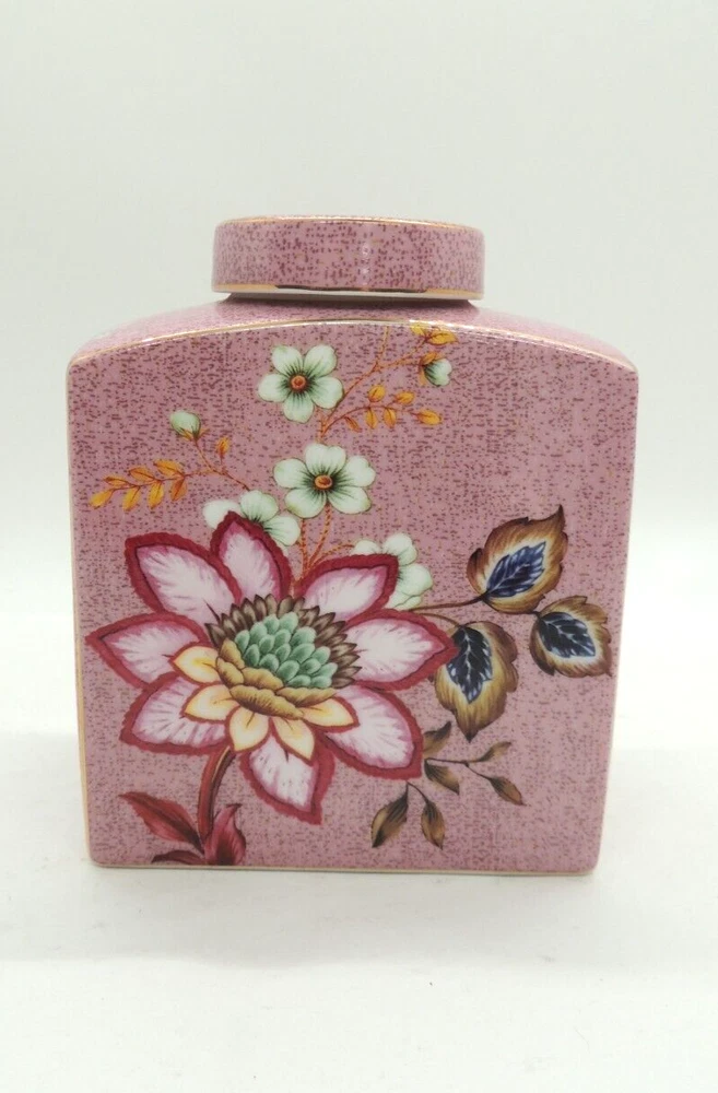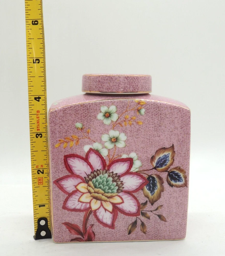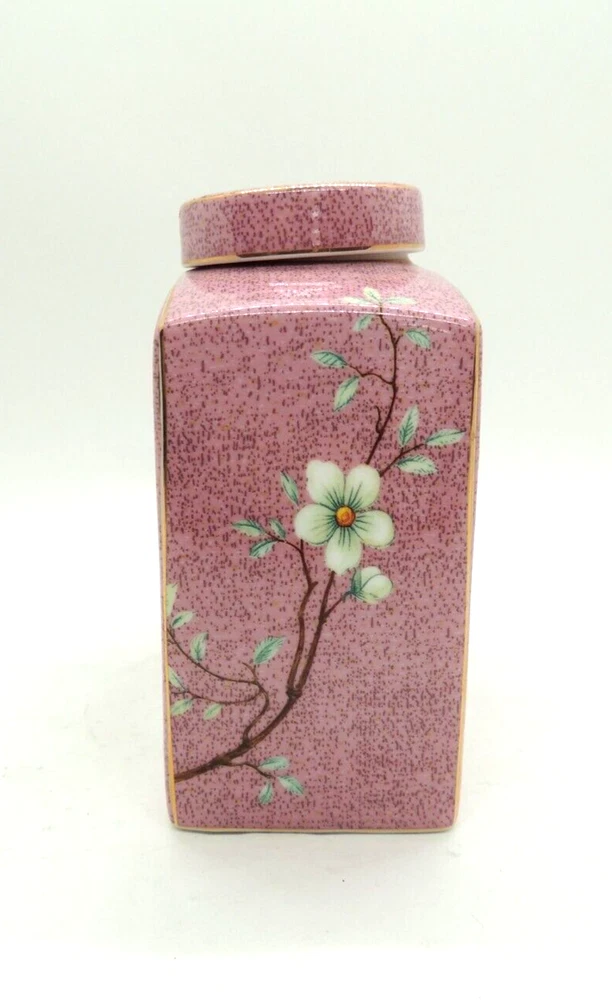 Grace Teaware Ceramic Square Tea Caddy Tea Box Tea Jar with Lid Mauve Floral -Measures about 4 1/2" tall by about 3 3/4" wide -Pre-owned in very good condition with no chips or cracks, may show slight signs of shelf ware, beautiful color and design -Please examine all photos, they are part of the description -Comes from a smoke free home -If you have any questions, please ask