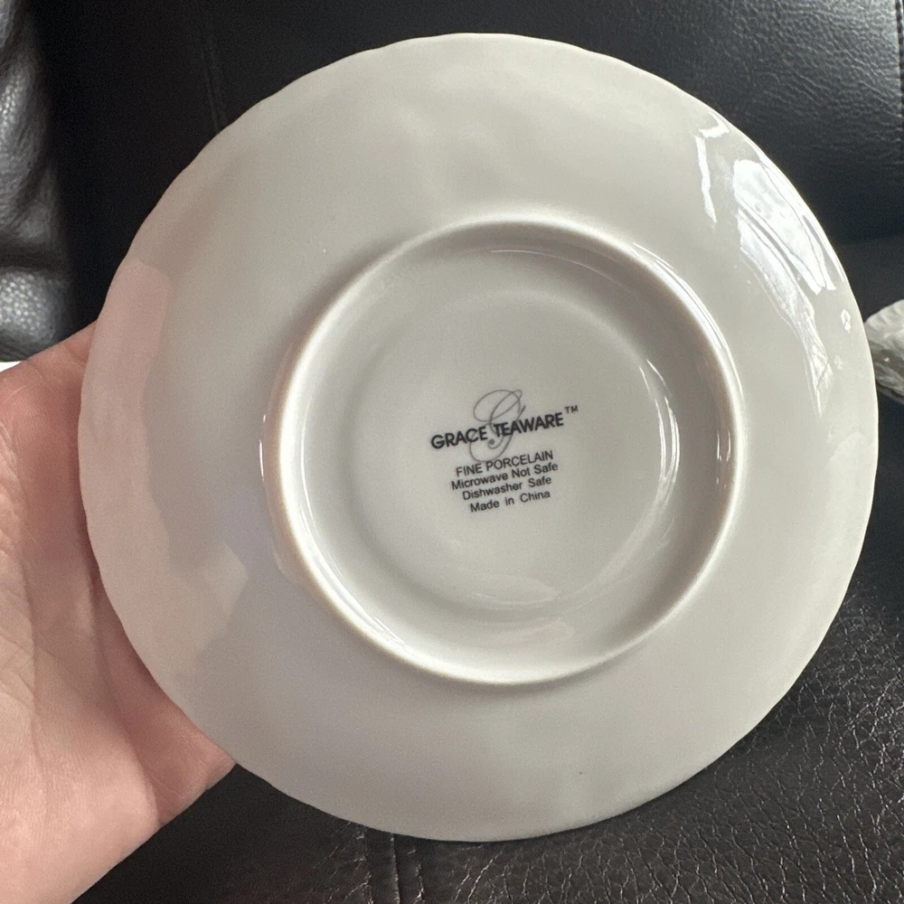 This beautiful ceramic cup and saucer set from Grace Teaware features a charming lemon fruit and butterfly design. The colorful and intricate details make it a great addition to any kitchen or dining room. Made for tea lovers, it's perfect for enjoying your favorite blends. The set is in great shape and ready for a new home. Crafted with care, this Grace Teaware set is perfect for adding a touch of elegance to your tea time routine. The multicolor design and butterfly theme are a perfect combination for nature lovers. The set has been previously enjoyed but is still in excellent condition.