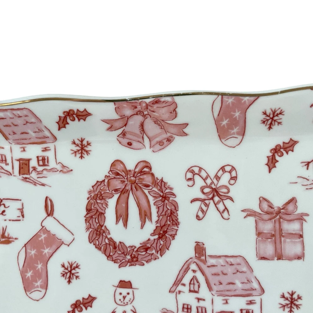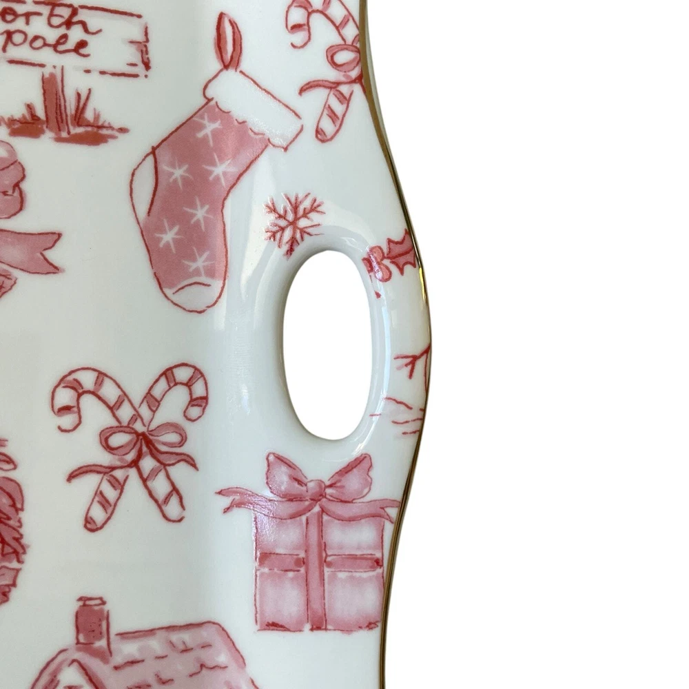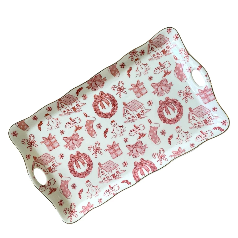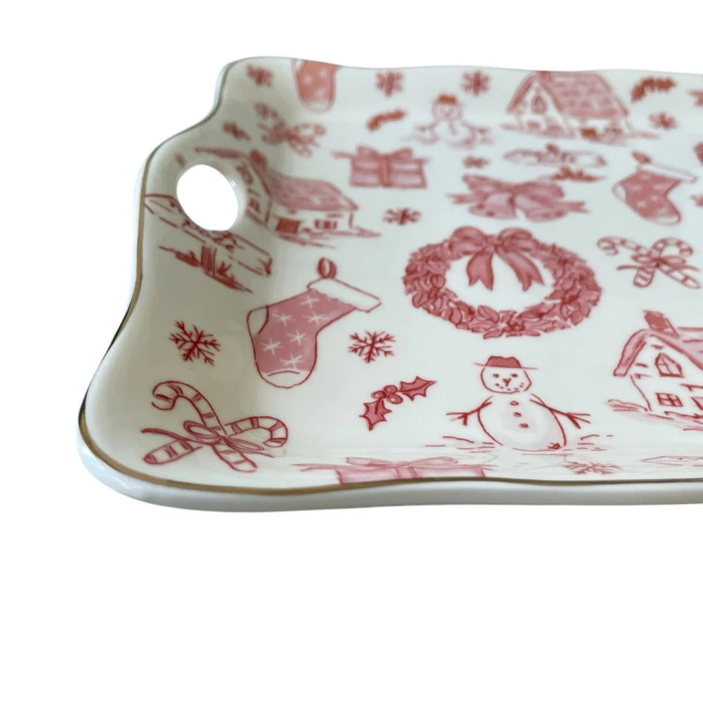 Grace Teaware Christmas Red & White Fine Porcelain Serving Tray 15in x 8.5in Brand New and BEAUTIFUL! Add a touch of elegance to your holiday table with this Grace's Teaware Christmas Serving Tray. A rectangular ceramic tray with scalloped edges and handles on either side for easy carrying. The design features a whimsical red-and-white Christmas motif with various holiday-themed illustrations. These include snowmen, wreaths, bows, gift boxes, candy canes, stockings, and small cottages, creating a charming winter village scene. Red and White color 15in L x 8.5in W Holiday Themed Scalloped edges Built-in handles Fine Porcelain Not Microwave Safe Dishwasher Safe Made in China Highly Rated FAST Shipper (by next day) Ships from Houston, Texas Smoke Free Home Thank you for checking out my store! Please follow me as I list new things DAILY:) Fall, Winter, Fall Essentials, Home, Kitchen, Dining Room, Indoor, Outdoor, Stylish, Trending, Christmas, Grace Teaware, Red, White, Home Decor, Shabby Chic, Holiday, Gift, Mothers Day, Merry Christmas
