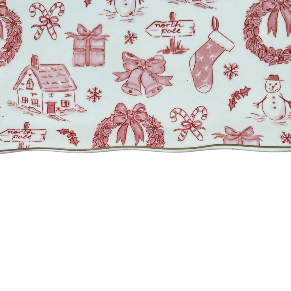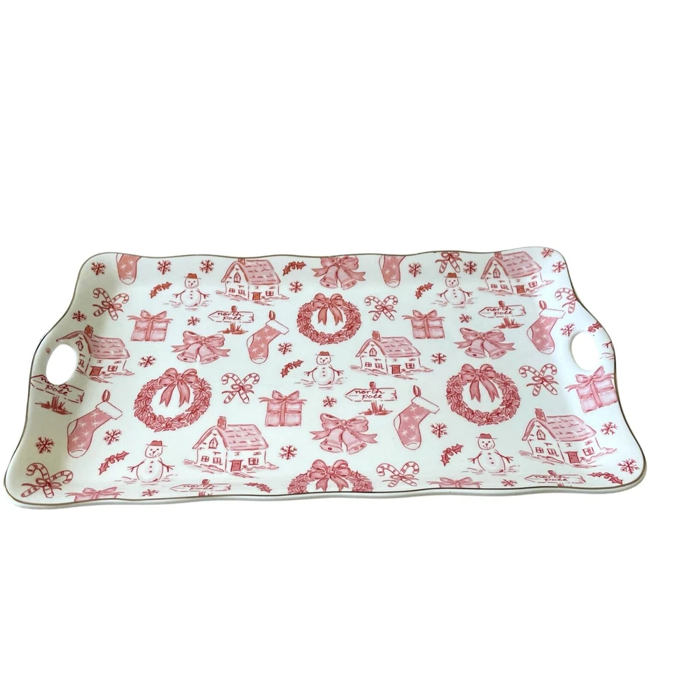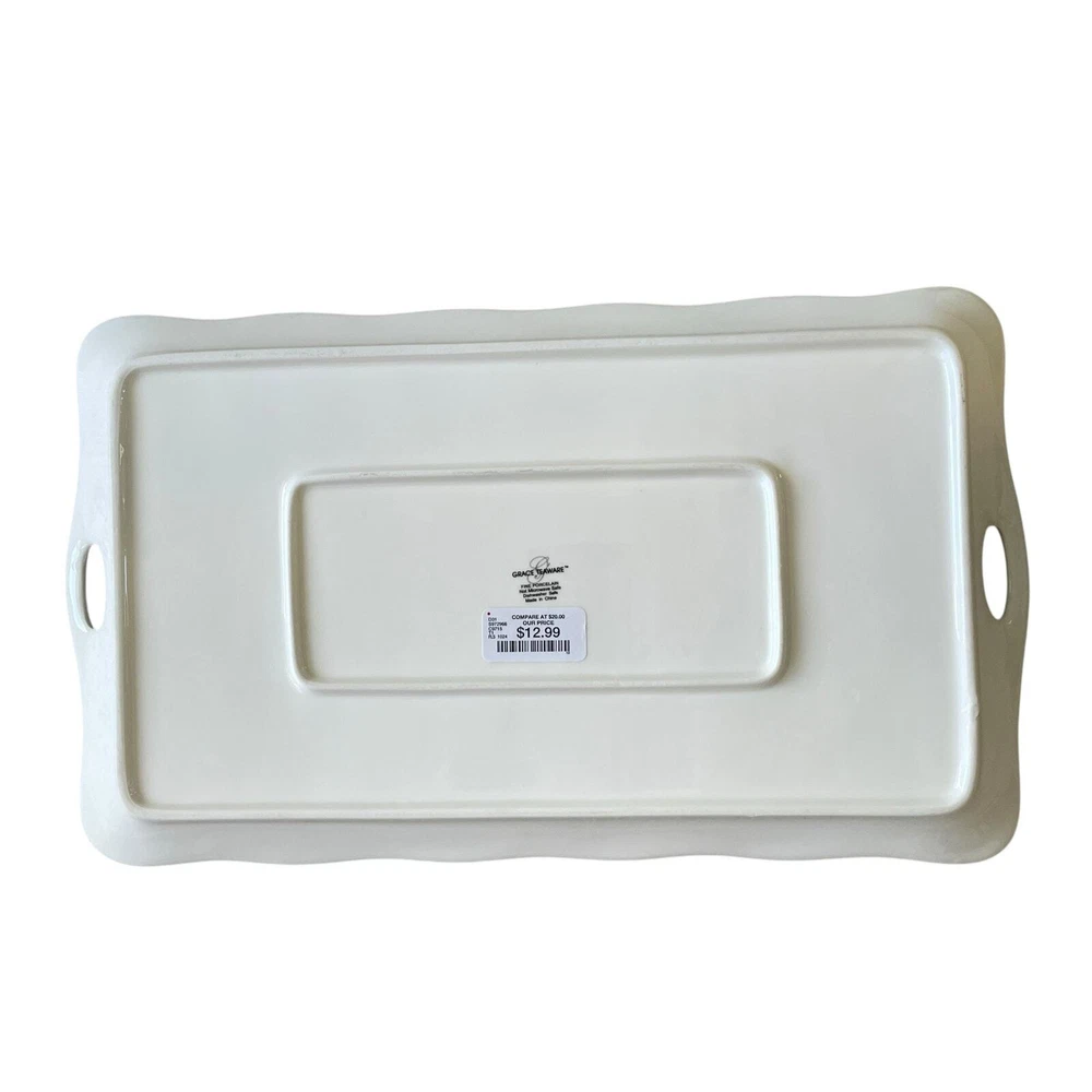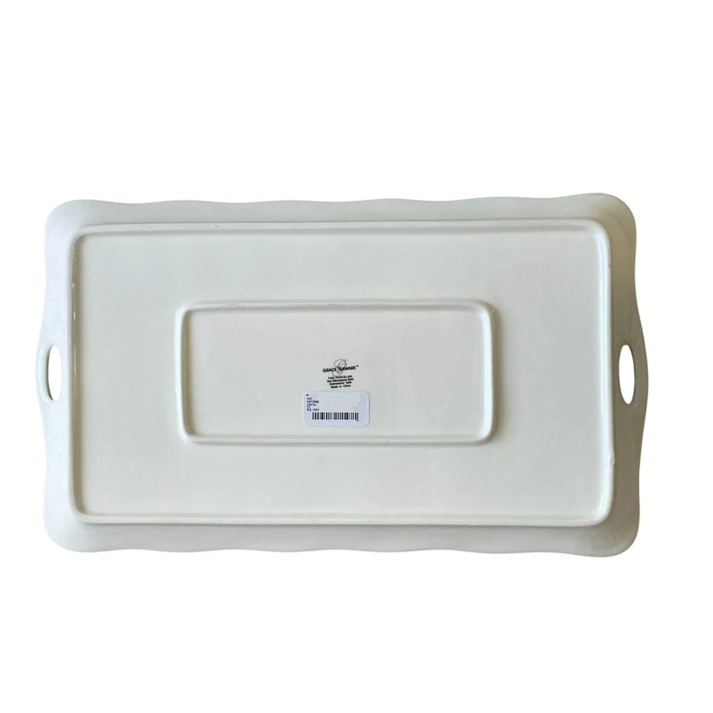 Grace Teaware Christmas Red & White Fine Porcelain Serving Tray 15in x 8.5in Brand New and BEAUTIFUL! Add a touch of elegance to your holiday table with this Grace's Teaware Christmas Serving Tray. A rectangular ceramic tray with scalloped edges and handles on either side for easy carrying. The design features a whimsical red-and-white Christmas motif with various holiday-themed illustrations. These include snowmen, wreaths, bows, gift boxes, candy canes, stockings, and small cottages, creating a charming winter village scene. Red and White color 15in L x 8.5in W Holiday Themed Scalloped edges Built-in handles Fine Porcelain Not Microwave Safe Dishwasher Safe Made in China Highly Rated FAST Shipper (by next day) Ships from Houston, Texas Smoke Free Home Thank you for checking out my store! Please follow me as I list new things DAILY:) Fall, Winter, Fall Essentials, Home, Kitchen, Dining Room, Indoor, Outdoor, Stylish, Trending, Christmas, Grace Teaware, Red, White, Home Decor, Shabby Chic, Holiday, Gift, Mothers Day, Merry Christmas