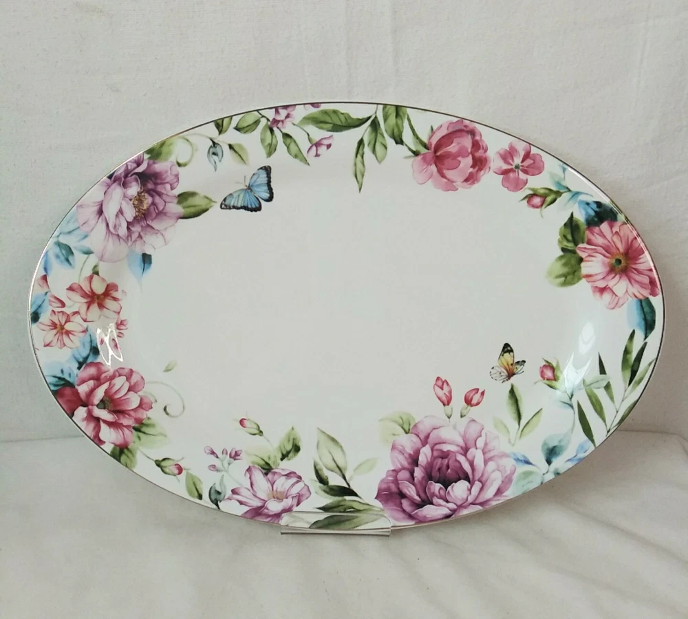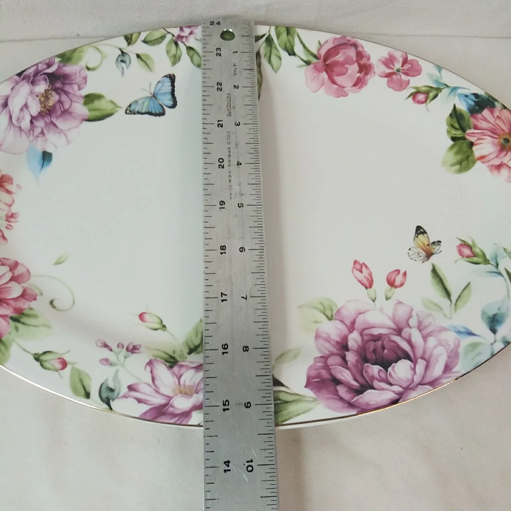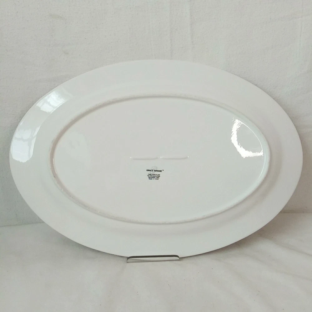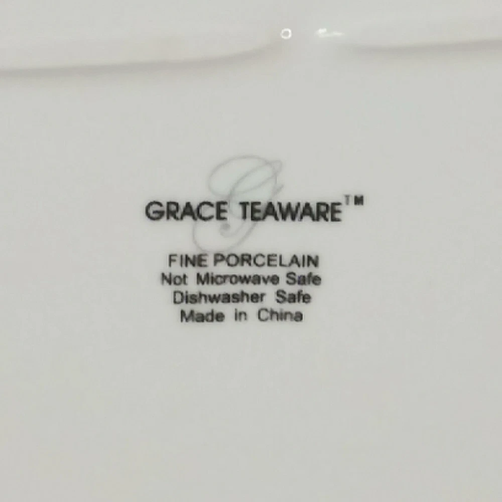 Grace Teaware Floral Oval Porcelain Serving Tray / Platter 14* 9.5"x 14" Really Good Condition Weighs 1 lb 12 oz Shipping USPS This beautiful Grace Teaware serving tray/platter is perfect for any tea party or gathering. The floral pattern in a variety of colors adds a touch of cottage style to any occasion. Measuring 14 inches in length and 9.5 inches in width, this small oval-shaped piece is made of glossy porcelain material. The tray is microwave and dishwasher safe, making it convenient for use and cleaning. Its multicolor design and wild rose theme make it a great addition to any collection. This piece is perfect for serving tea or other beverages and is sure to impress your guests.