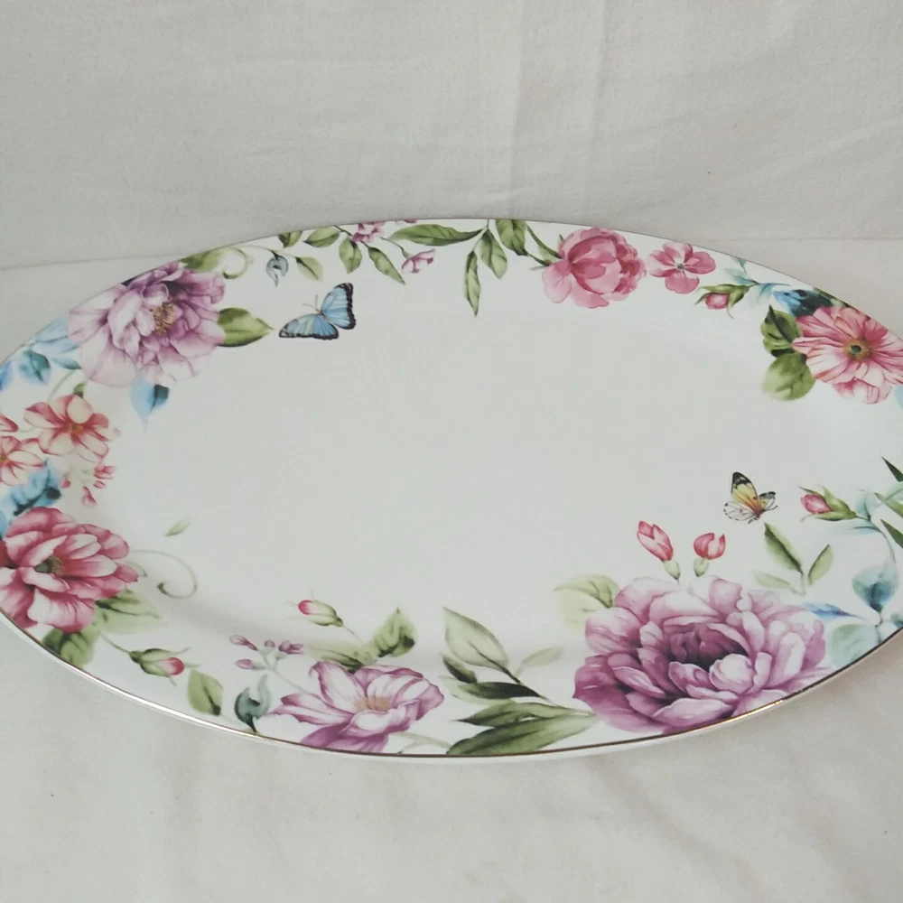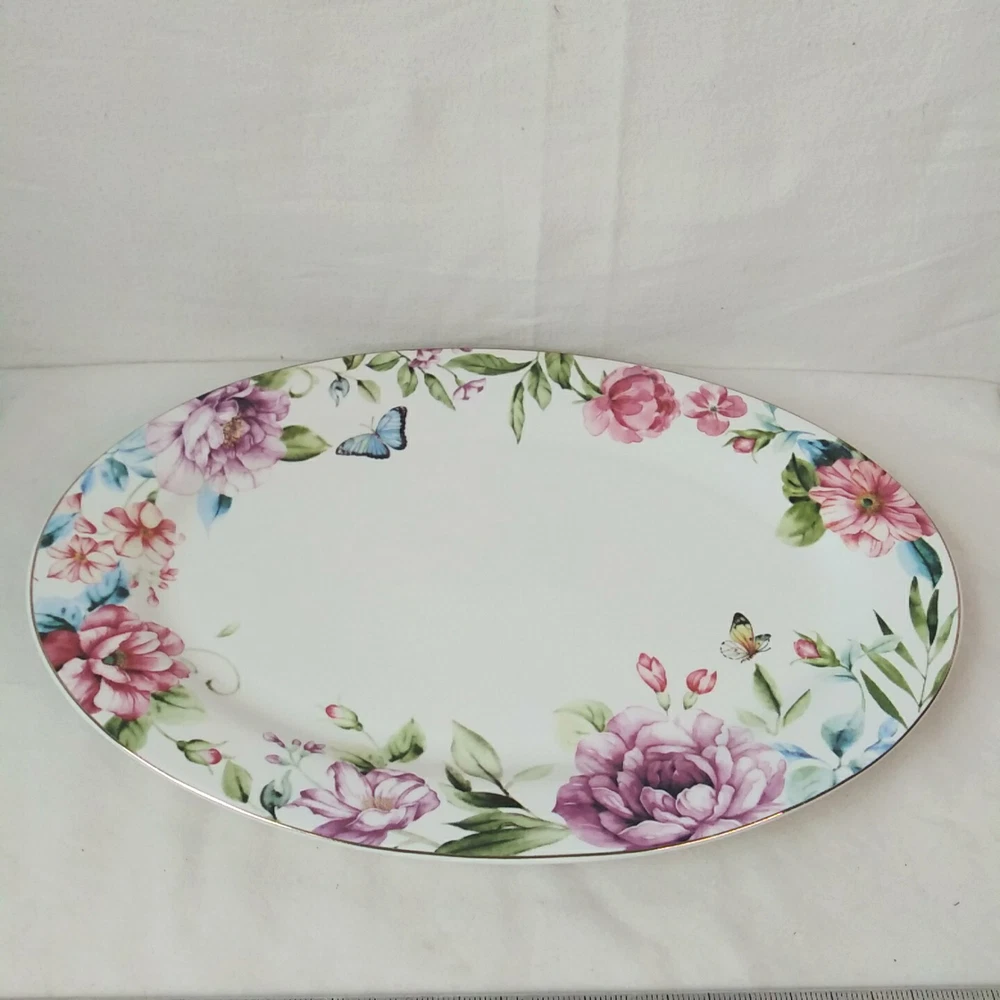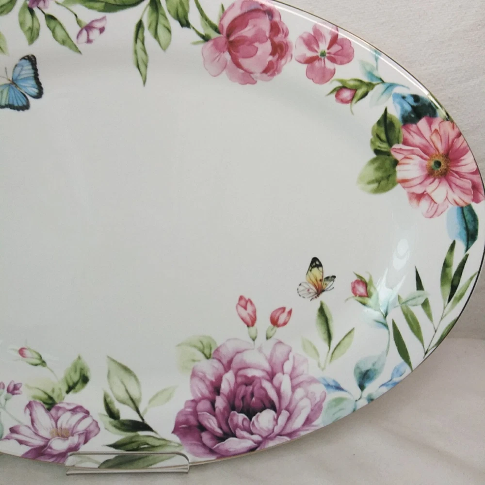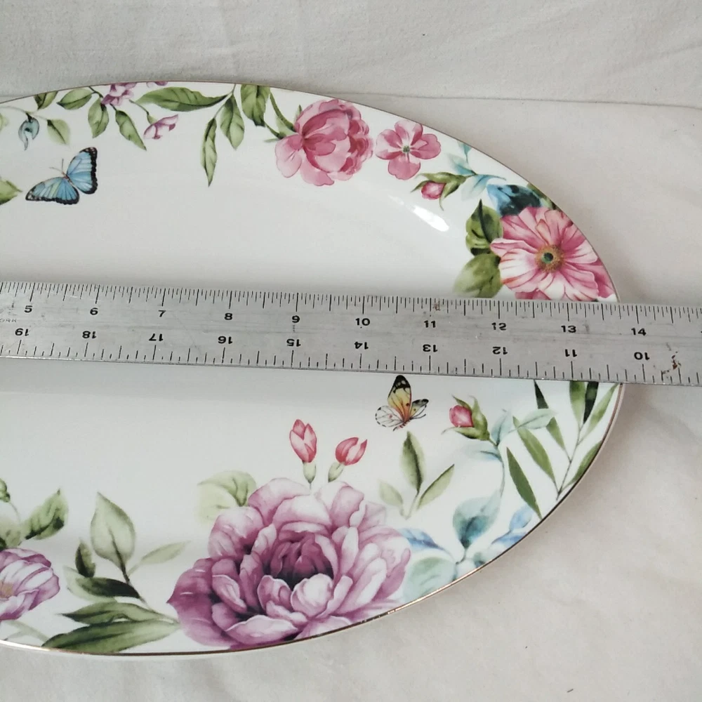 Grace Teaware Floral Oval Porcelain Serving Tray / Platter 14* 9.5"x 14" Really Good Condition Weighs 1 lb 12 oz Shipping USPS This beautiful Grace Teaware serving tray/platter is perfect for any tea party or gathering. The floral pattern in a variety of colors adds a touch of cottage style to any occasion. Measuring 14 inches in length and 9.5 inches in width, this small oval-shaped piece is made of glossy porcelain material. The tray is microwave and dishwasher safe, making it convenient for use and cleaning. Its multicolor design and wild rose theme make it a great addition to any collection. This piece is perfect for serving tea or other beverages and is sure to impress your guests.