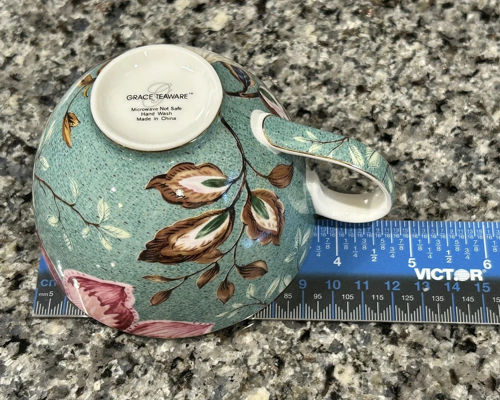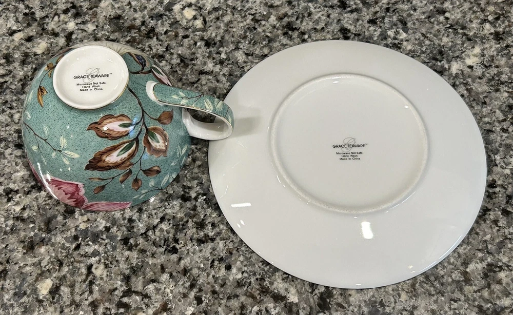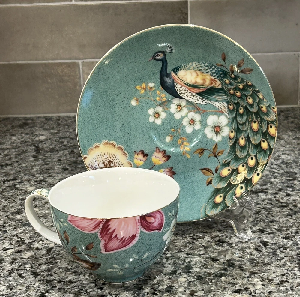 Grace Teaware Peacock Lotus Garden Flat cup and saucer set No chips/cracks/crazing/loss of detail Cup: 3.75”D 4.75”L 2.5”H Saucer: 6.25”D Please message with any questions.