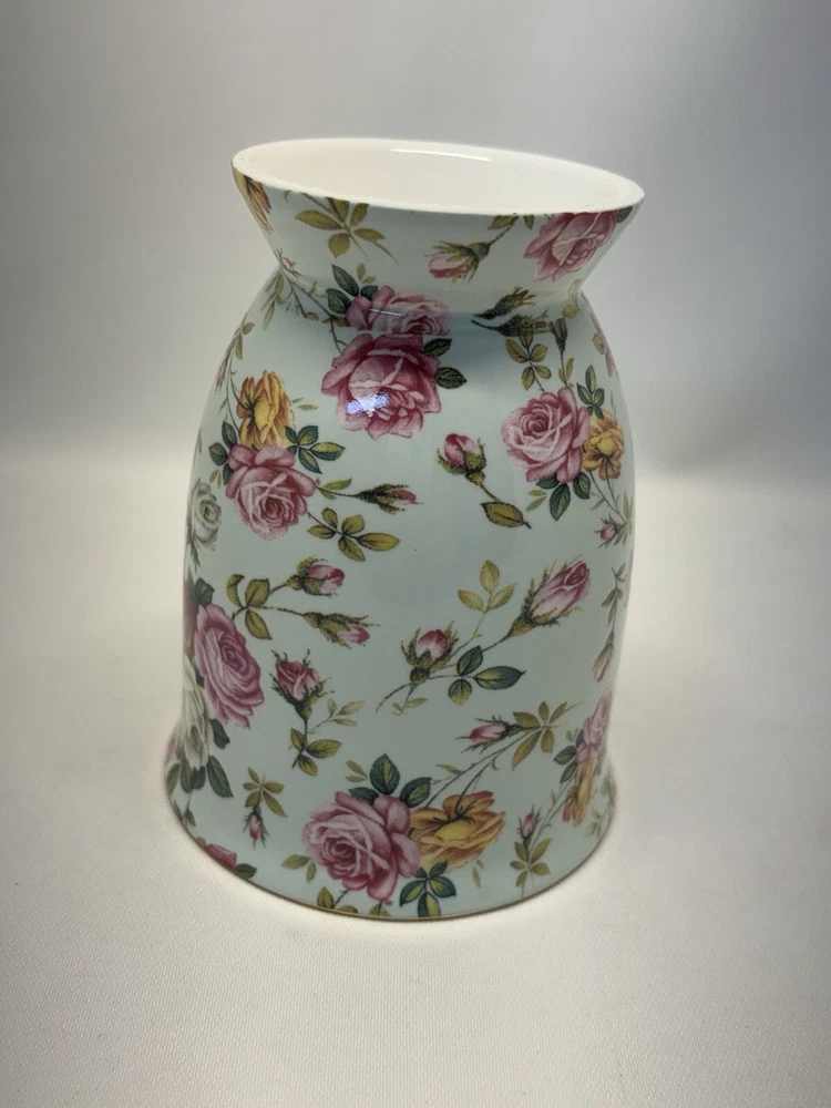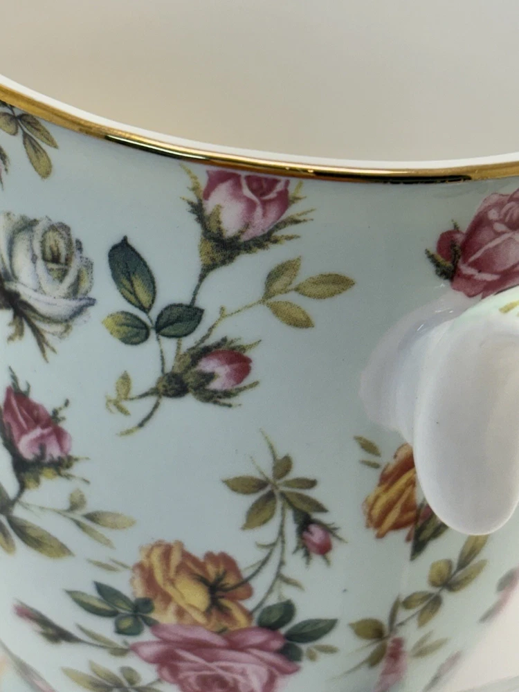 This is in perfect condition. So pretty. There are gold trim accents and beautiful roses on the light green- sea-foam base color. Please see pictures for details. Thanks for looking!