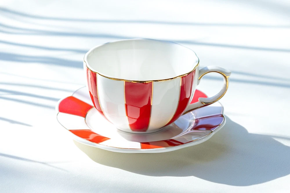 Pattern: Stripes Style: Classic Material: Gold, Porcelain Service For: 1 Capacity: 7oz Brand: Grace's Teaware Color: Red, White and Gold Type: Tea Cup & Saucer Set Includes: Cup, Saucer Occasion: All Occasions