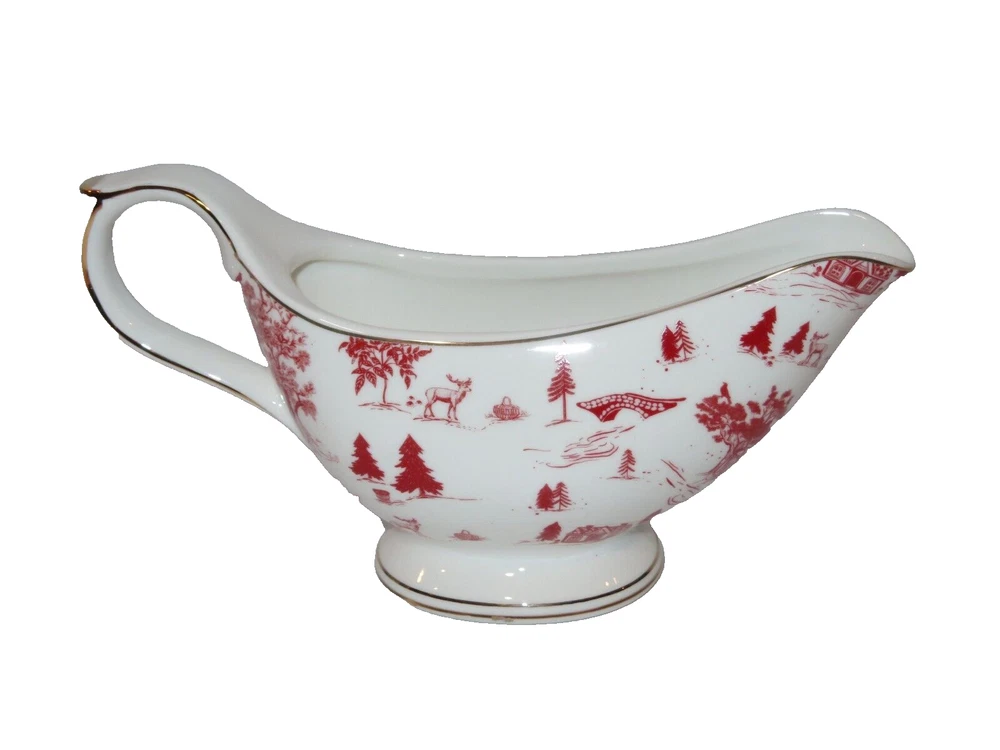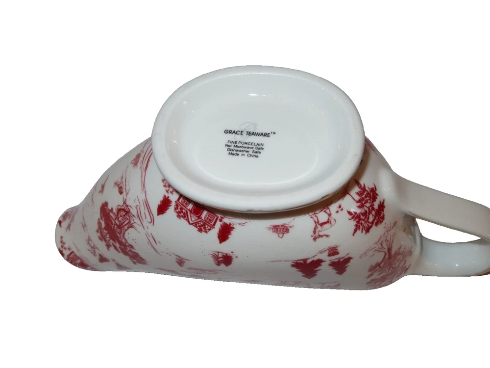 This sale is for one new ceramic gravy boat in a red and white, with gold trim and accents, woodland Christmas pattern by Grace Teaware. This item measures 3-3/4" deep to spout and the opening is 6-1/4" by 2-1/4". It holds approximately 10 ozs. Please note that a lot of our items we sell have been gently used, unless described as NEW. We know times are hard, so our goal is to bring you a quality product at a fair price! Please give us the opportunity to work out any problems or questions you have regarding any purchases. We GUARANTEE that we will pack your order to prevent breakage—however, if a USPS truck runs over it, or if someone uses it as a football and you receive it broken, WE WILL REIMBURSE YOU 100% IMMEDIATELY (on PayPal payments ONLY)! SHIPPING - If you are shipping to a P.O. Box, please do not select FedEx, as they do not ship to P.O. Boxes. Please do not ask us to discount shipping costs. We charge ONLY the exact cost of shipping your item, nothing more, and have absolutely no control over shipping costs . We combine items to save you money, and we reimburse any overpayment of shipping over $1 back to you. Ebay does not calculate correct shipping cost for multiple items. PLEASE e-mail us and ask us for the shipping price on a multiple-item purchase BEFORE you buy or pay. Immediate payment required.